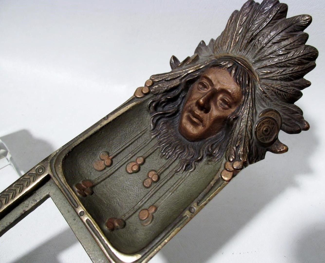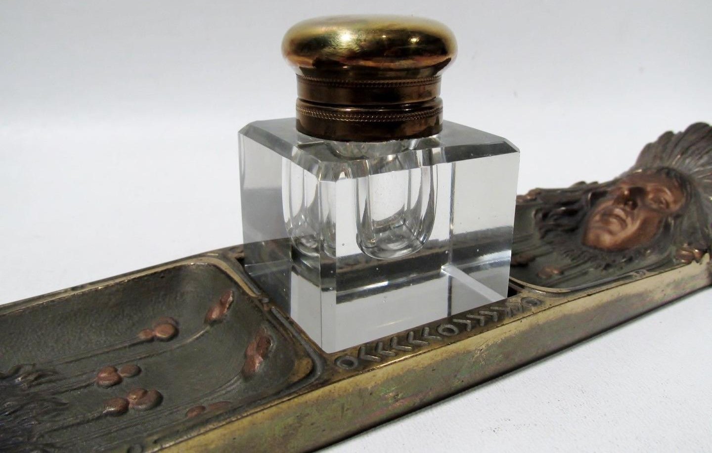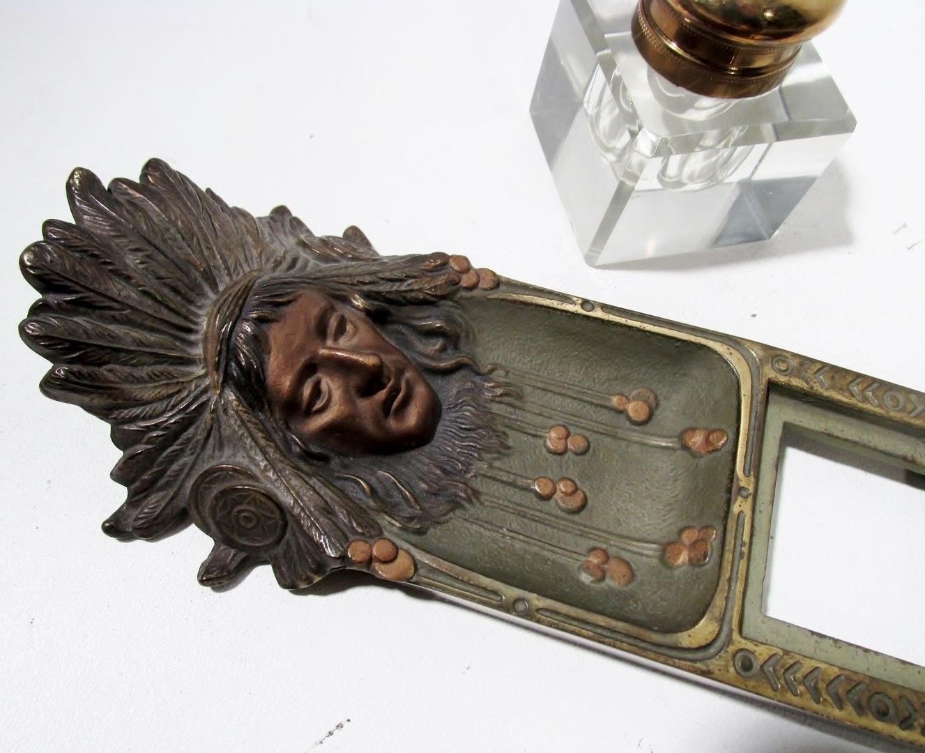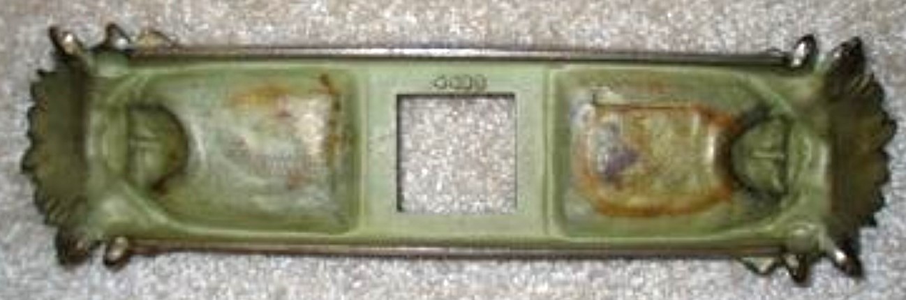 A long tray holds a cut crystal inkwell with a hinged lid. At each end of the tray is the head of an Indian Chief. The number 4493 is stamped on the underside. I believe H. L. Judd Manufacturing made this inkstand.
