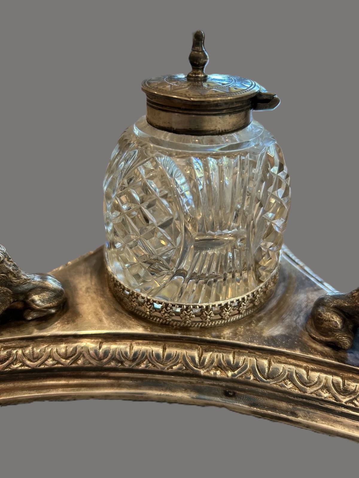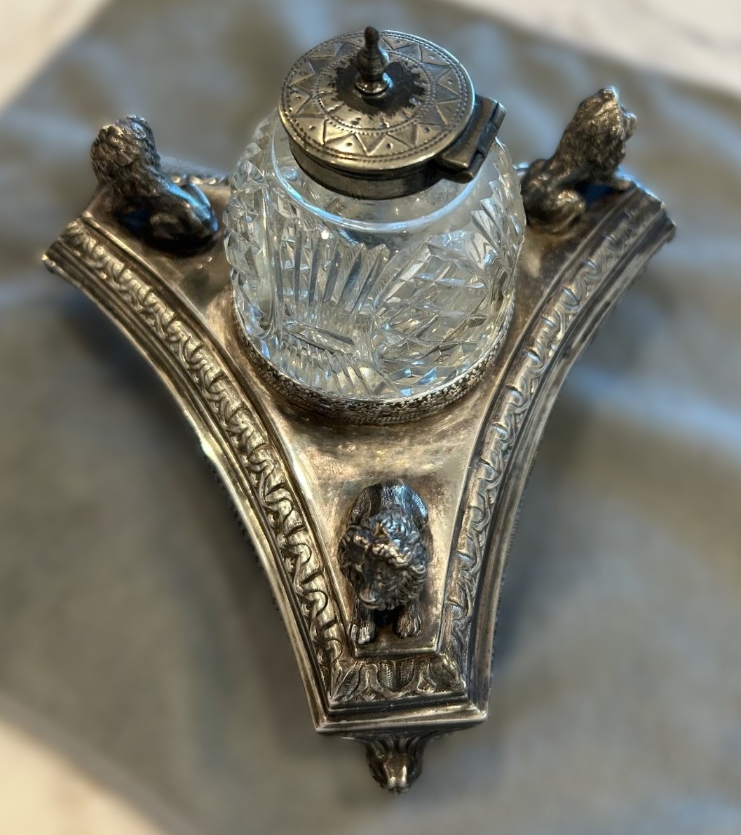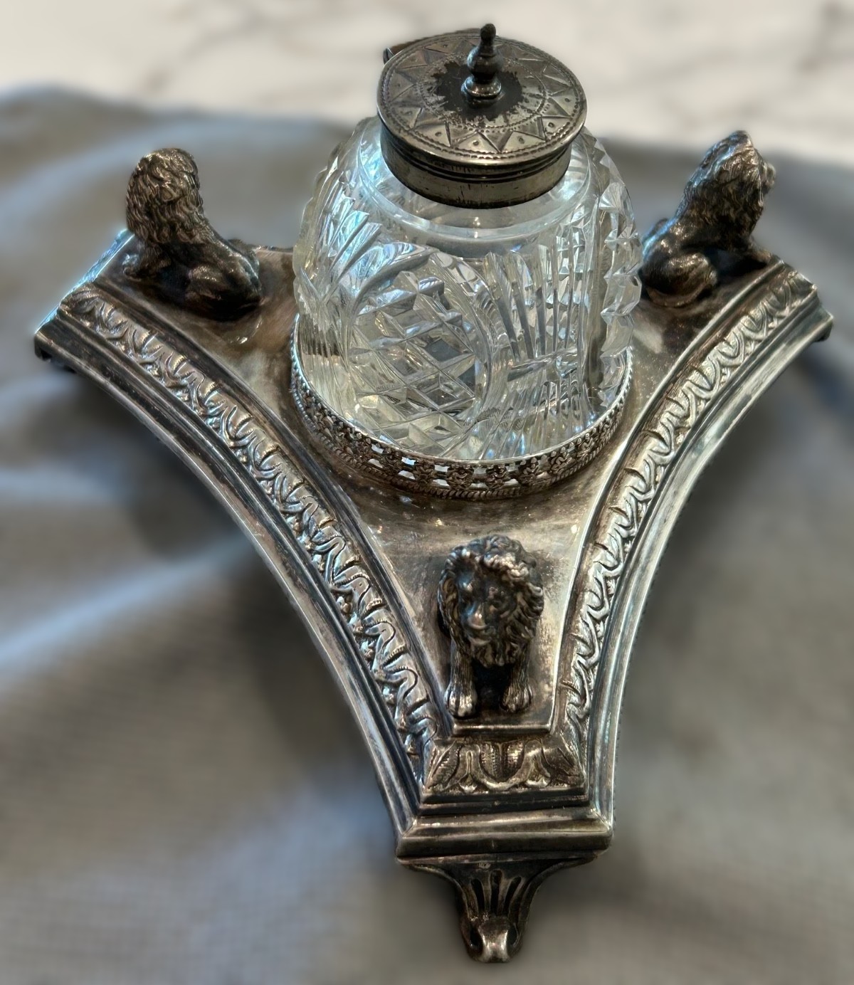 - The Glassware: The central focal point is a heavy cut-crystal inkwell featuring deep diamond and miter cuts. It is topped with a hinged silver-plated lid decorated with a radiant starburst pattern and a formal urn-shaped finial.