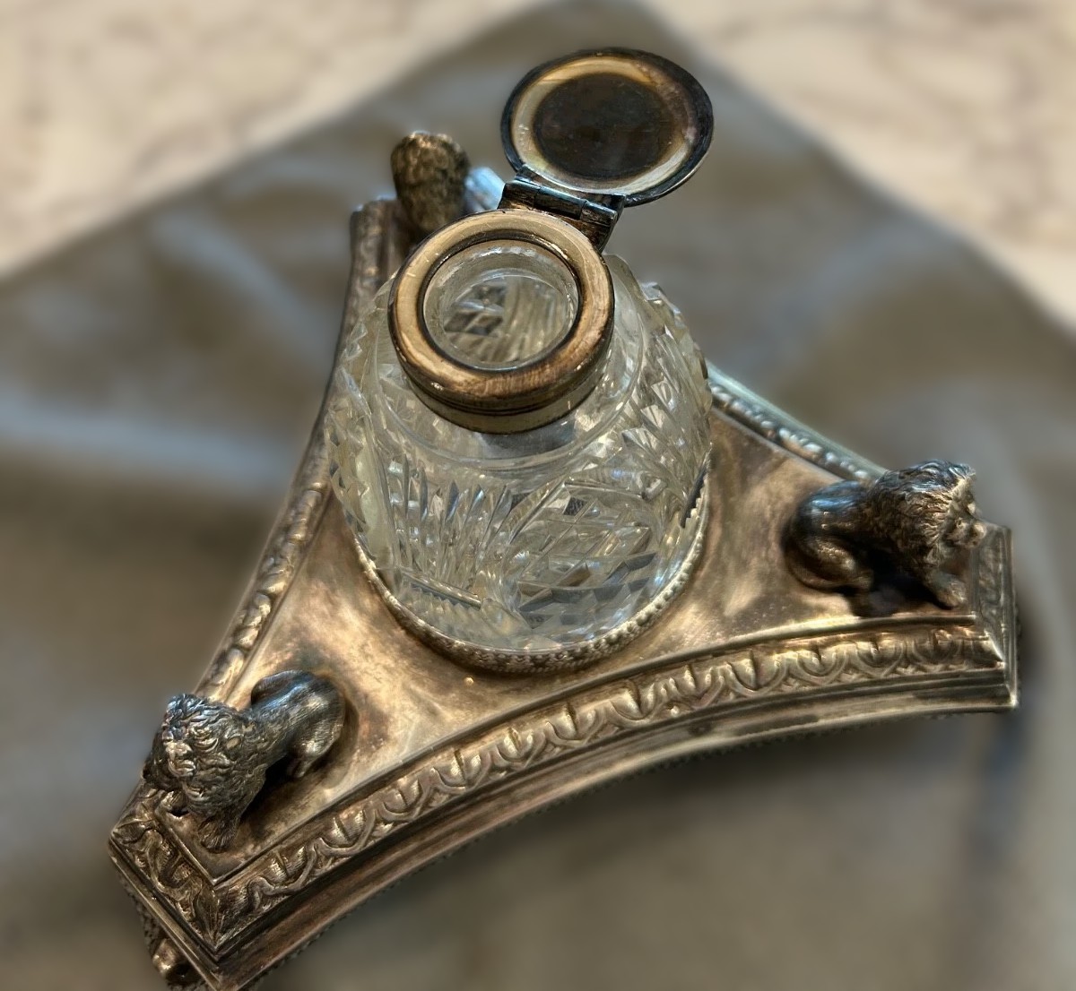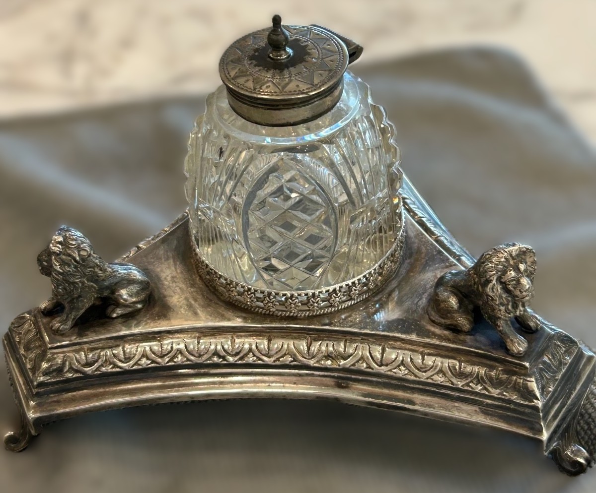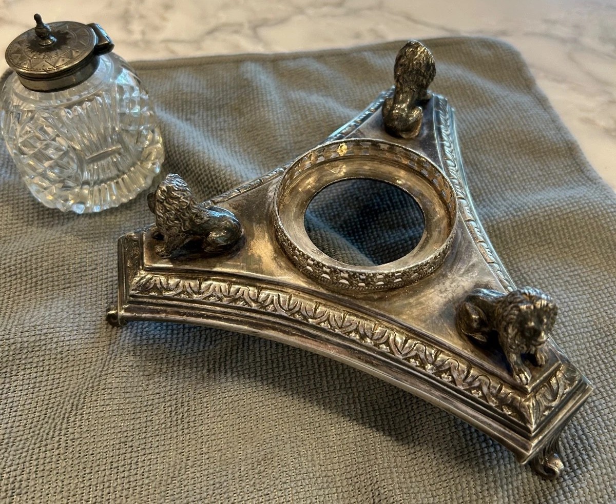- The Glassware: The central focal point is a heavy cut-crystal inkwell featuring deep diamond and miter cuts. It is topped with a hinged silver-plated lid decorated with a radiant starburst pattern and a formal urn-shaped finial.