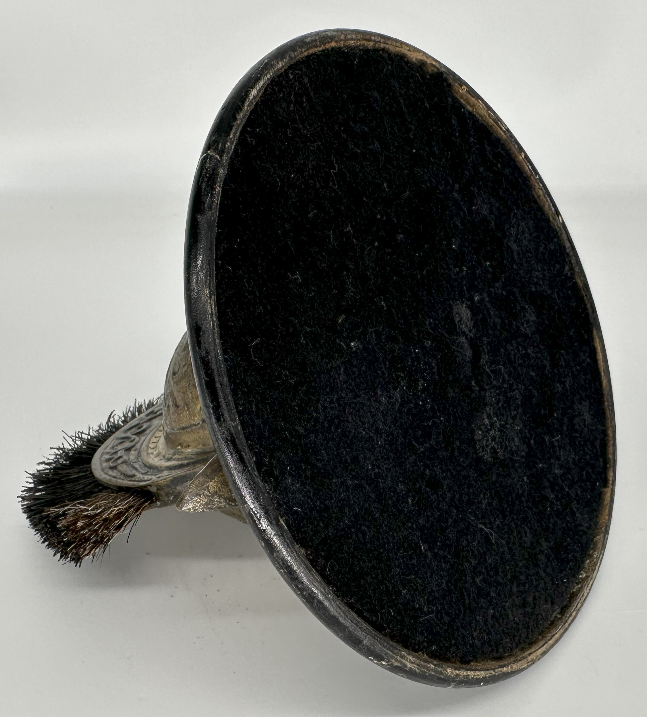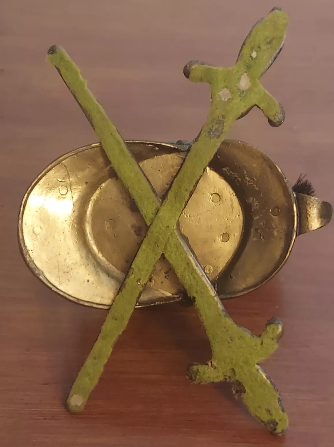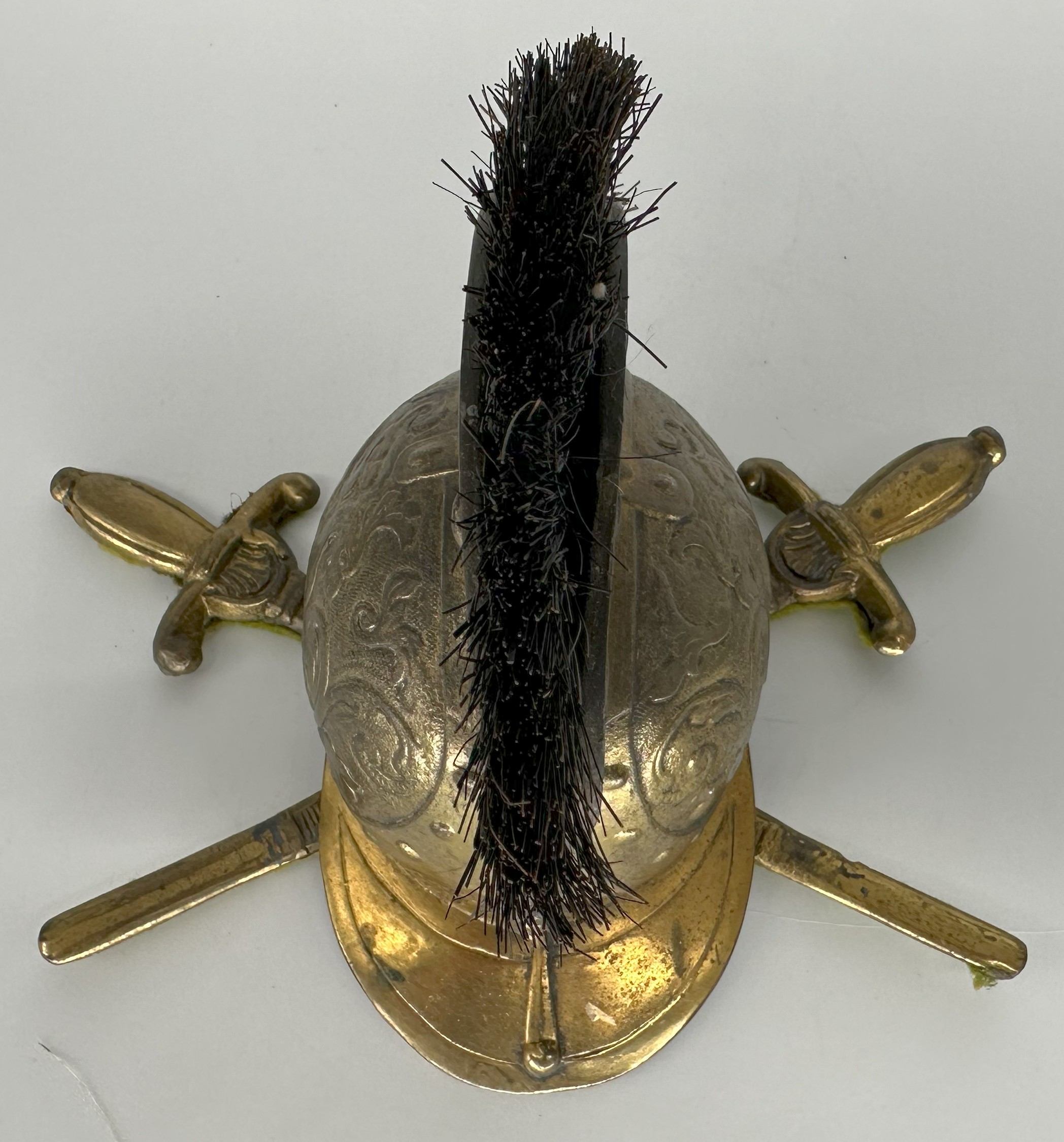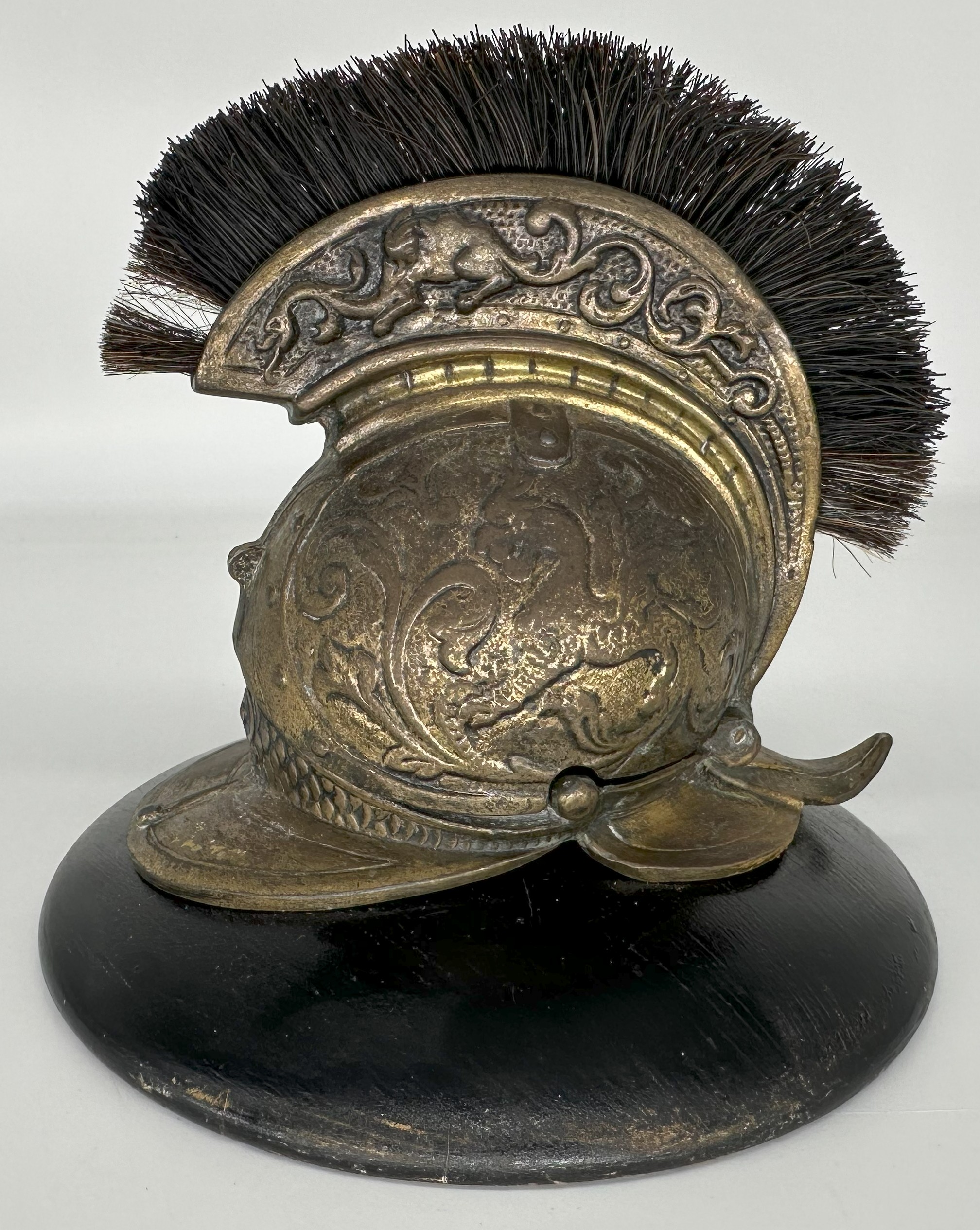 This brass inkwell is designed in the form of a classical helmet. It features chased designs on the dome including a dragon-like creature – possibly a griffin or wyvern. The crest is adorned with a brush-like plume (possibly horsehair) and serves as a pen wipe. The back of the helmet is hinged, revealing an ink pot within. For example #1, the helmet rests on two crossed, stylized swords, forming its base. Example #2 rests on a round wooden base.