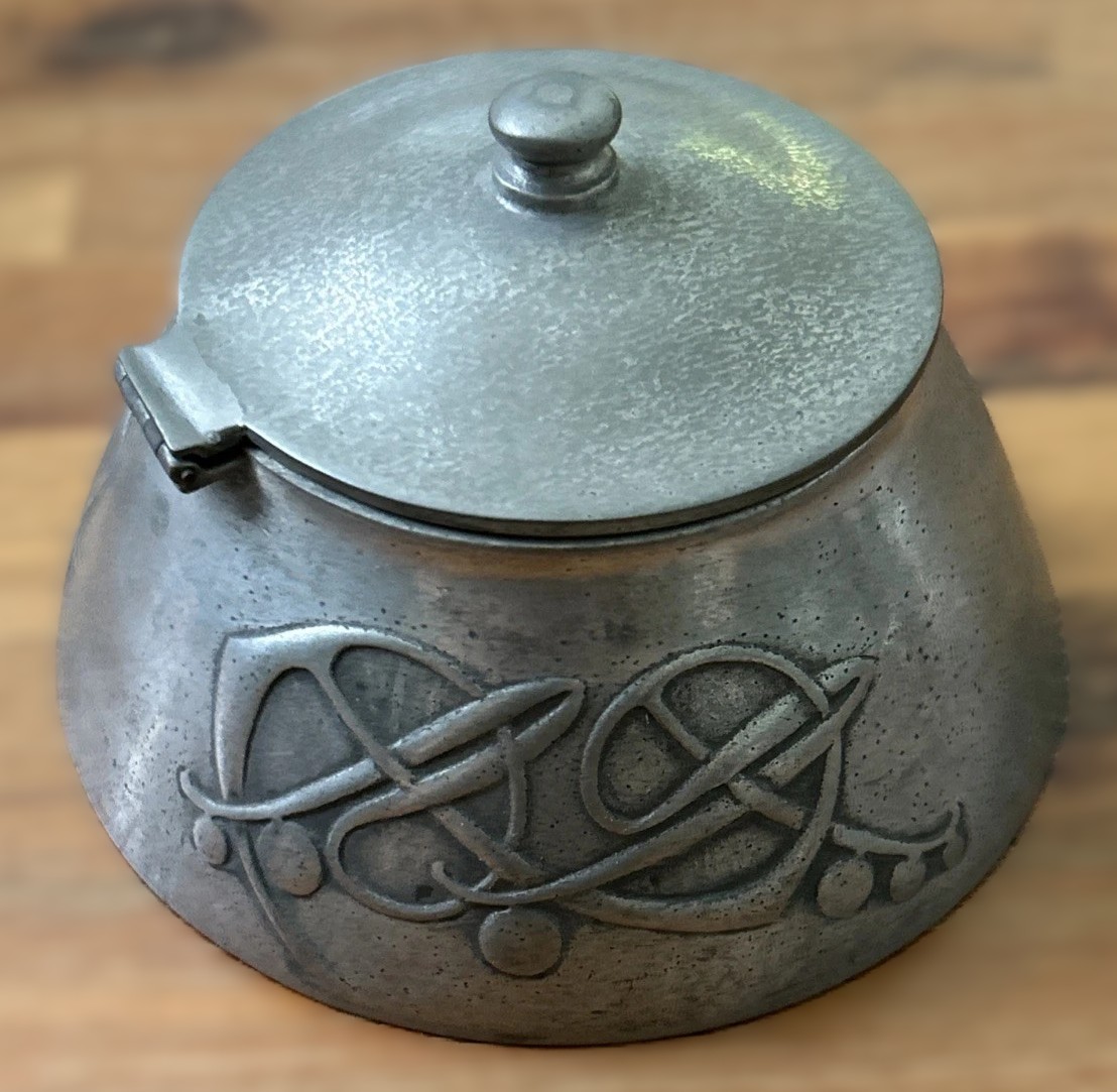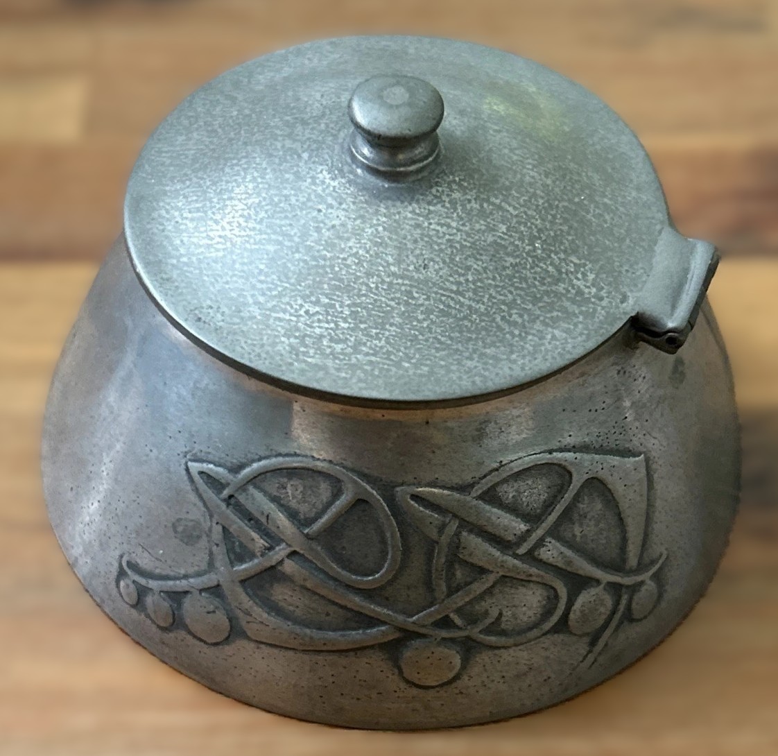 Based on the markings and design, this pewter inkwell was sold by Liberty & Co. and designed by the celebrated artist Archibald Knox.