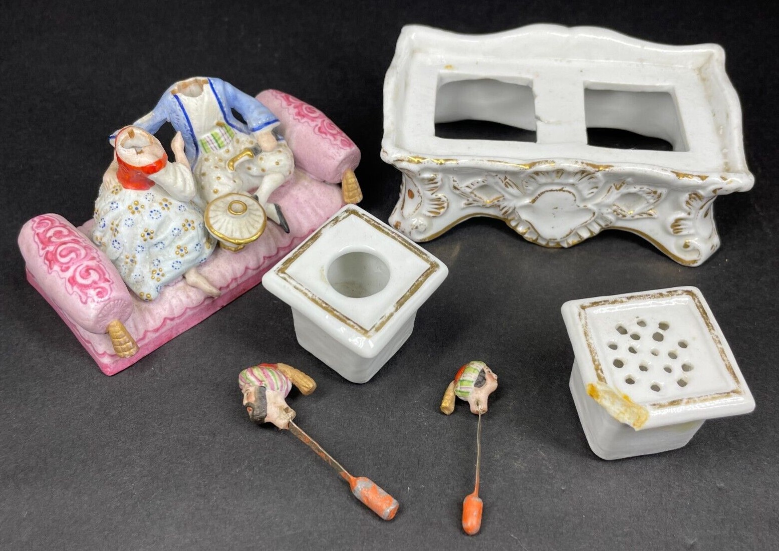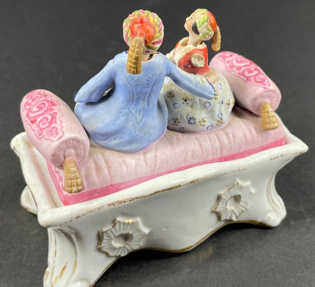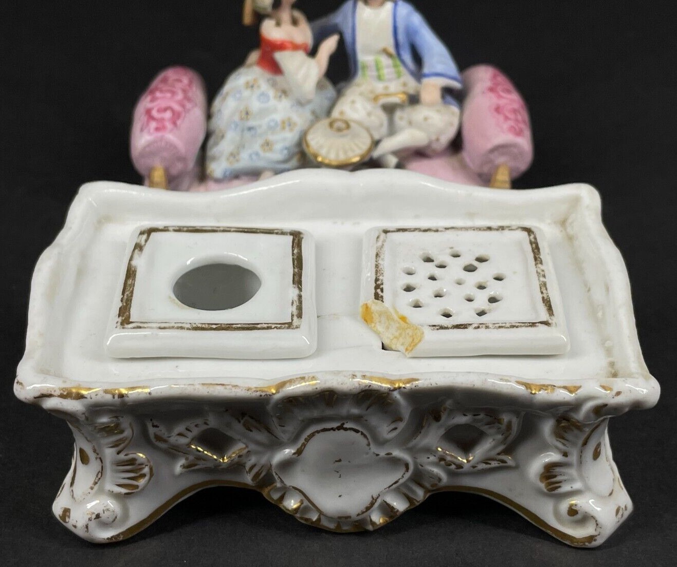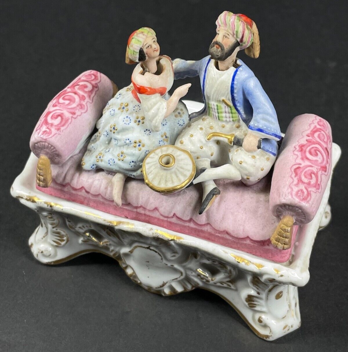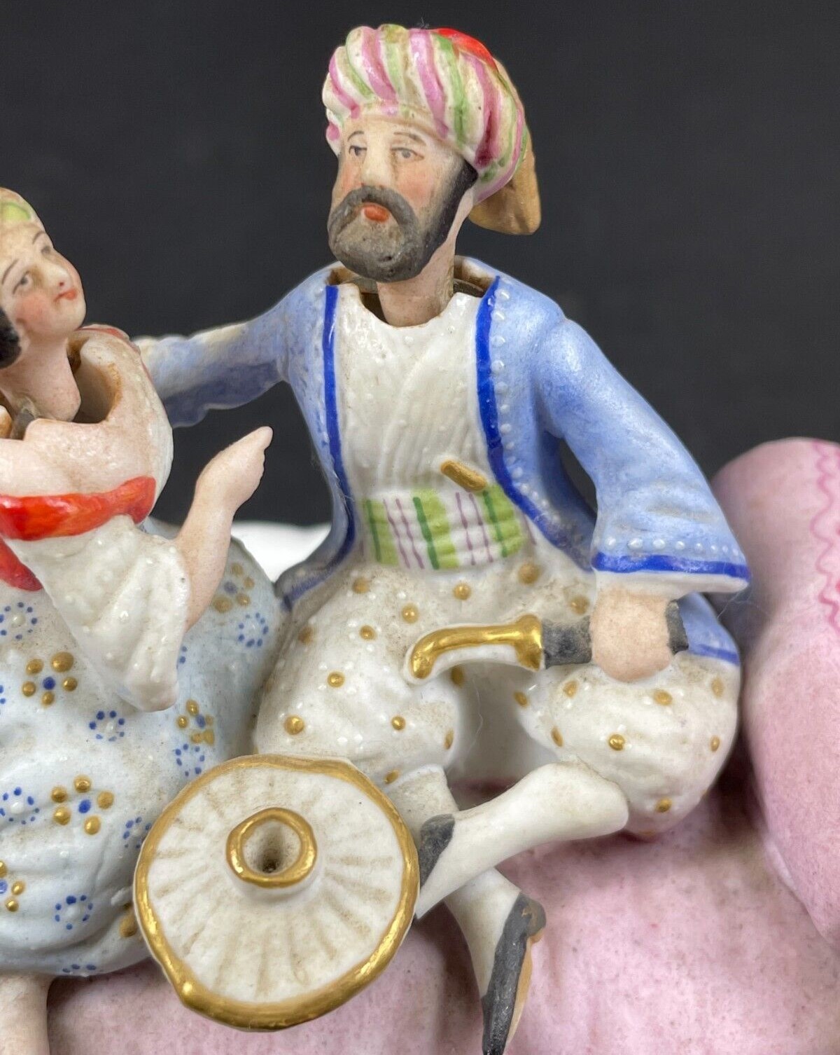 A Middle Eastern man and woman, colorfully hand painted, are seated on an exotic divan – all made of unglazed bisque.  The couple are also miniature nodders – their removable heads are balanced with weights on rockers, so their heads gently bobble when the piece is moved. The top lifts off to access an inkwell and pounce pot housed in a glazed base highlighted in gold.