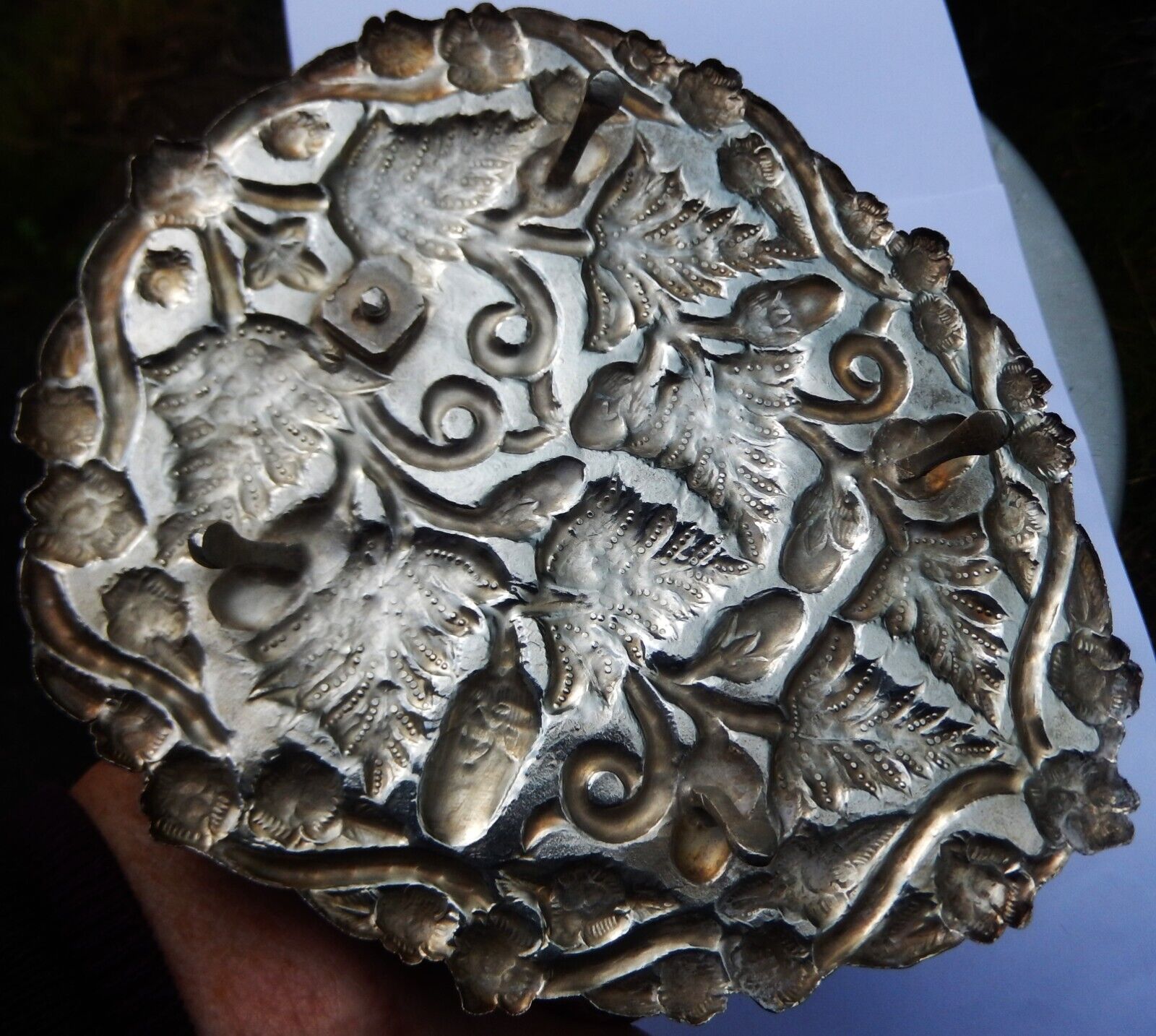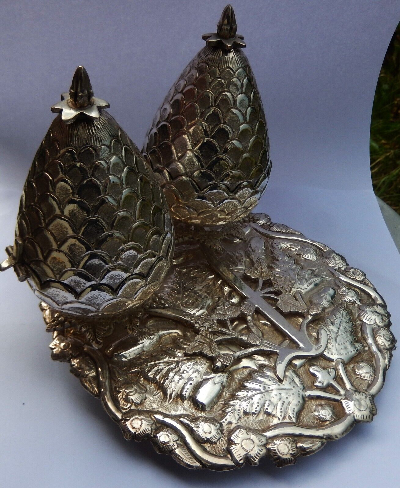 The inkwells are in the form of two pinecones issuing from leafy branches on an openwork repousse and appliqué base with four legs. Each cone is hinged to allow access to the interiors, both of which show traces of ink residue. The set is made from 800 grade solid silver.