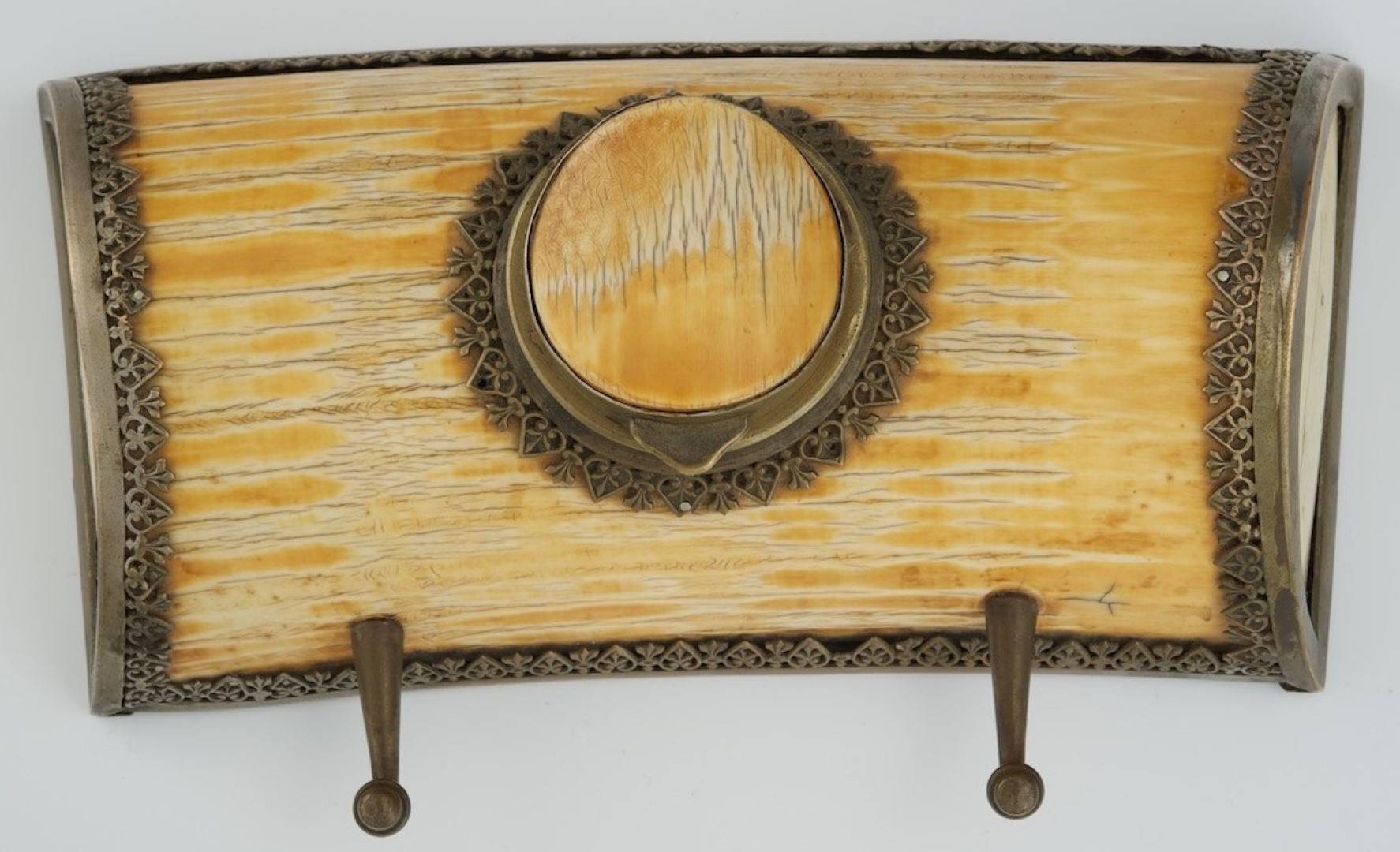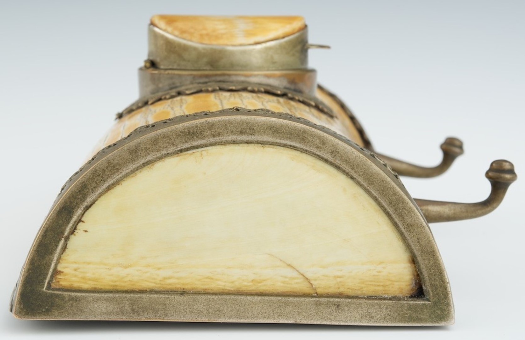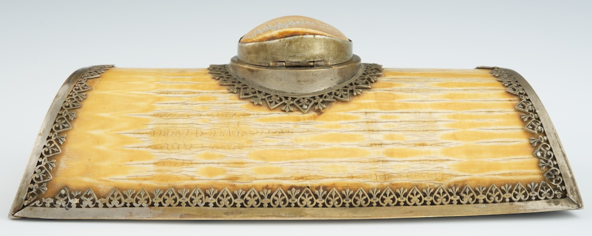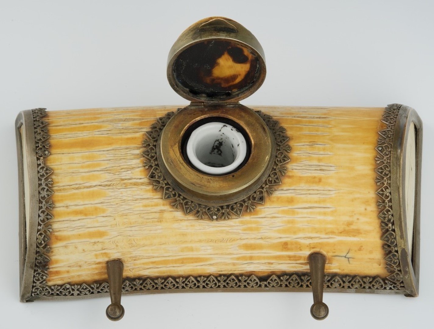 Half-moon shaped, this inkstand is carved from tusk and has silvered bronze reticulated mount. The hinged bronze and ivory lid is set on the underside with tortoise shell. Two bronze pen holders are attached to the front.