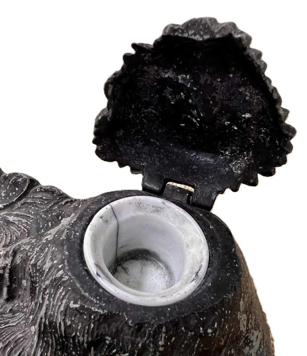 This cold painted spelter inkwell depicts two Middle Eastern men and a camel at an oasis. The inkwell itself is hidden under the low palm fronds on the right. The word “Austria” is impressed on the underside of the base.