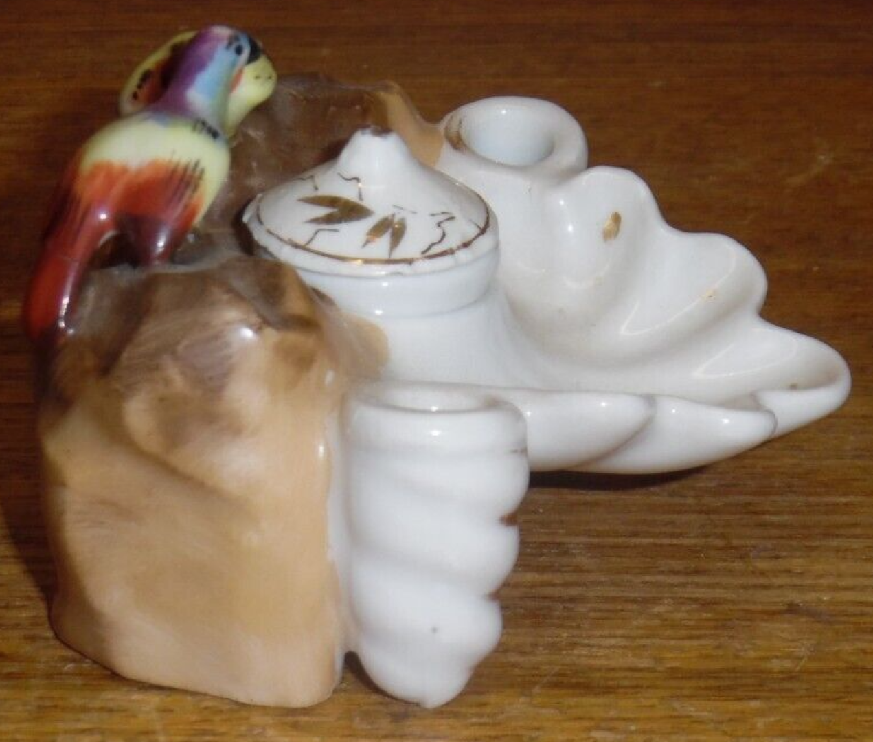 Two colorful birds flank an inkwell with an unattached lid. In the front are two pen holders and a shell tray.