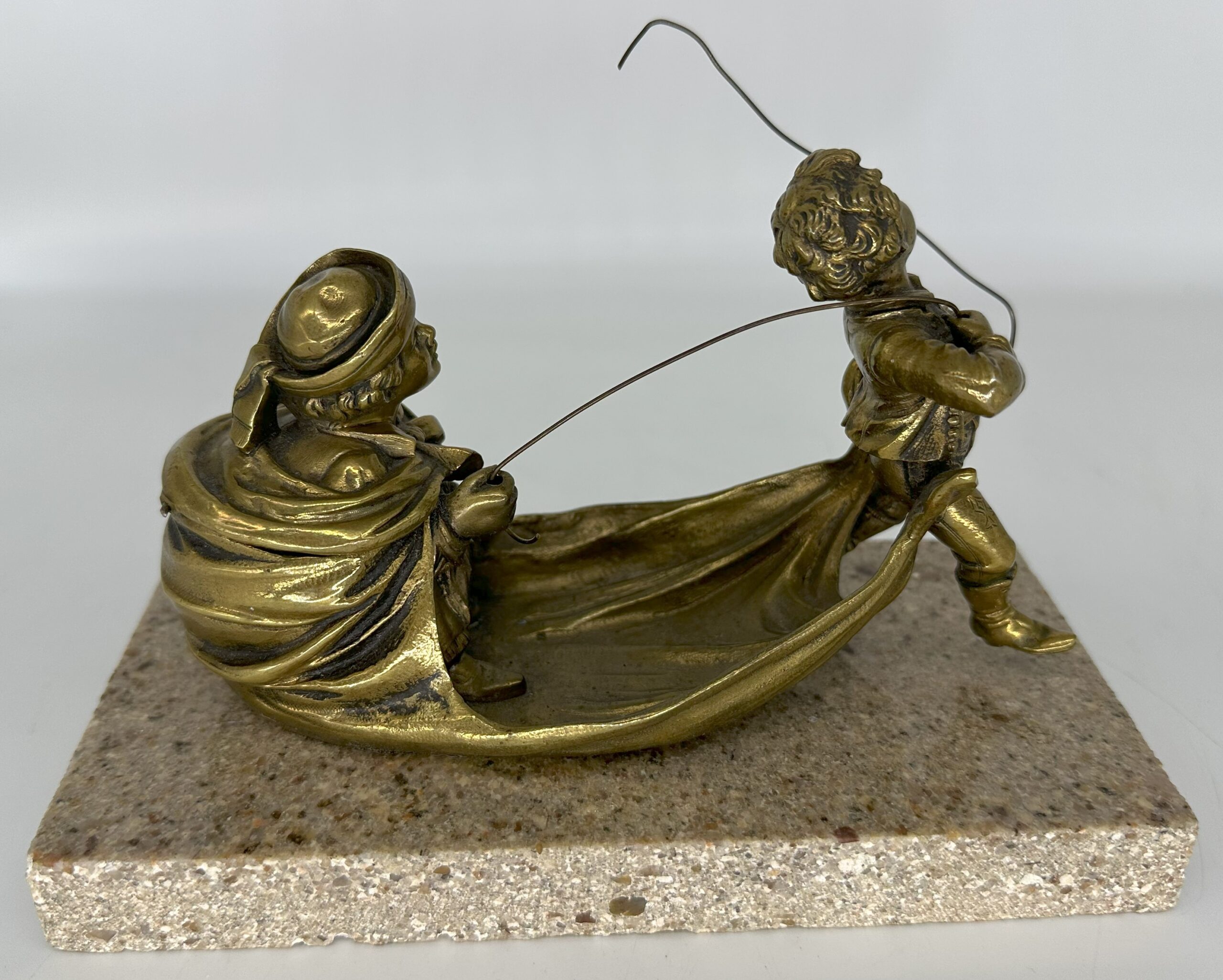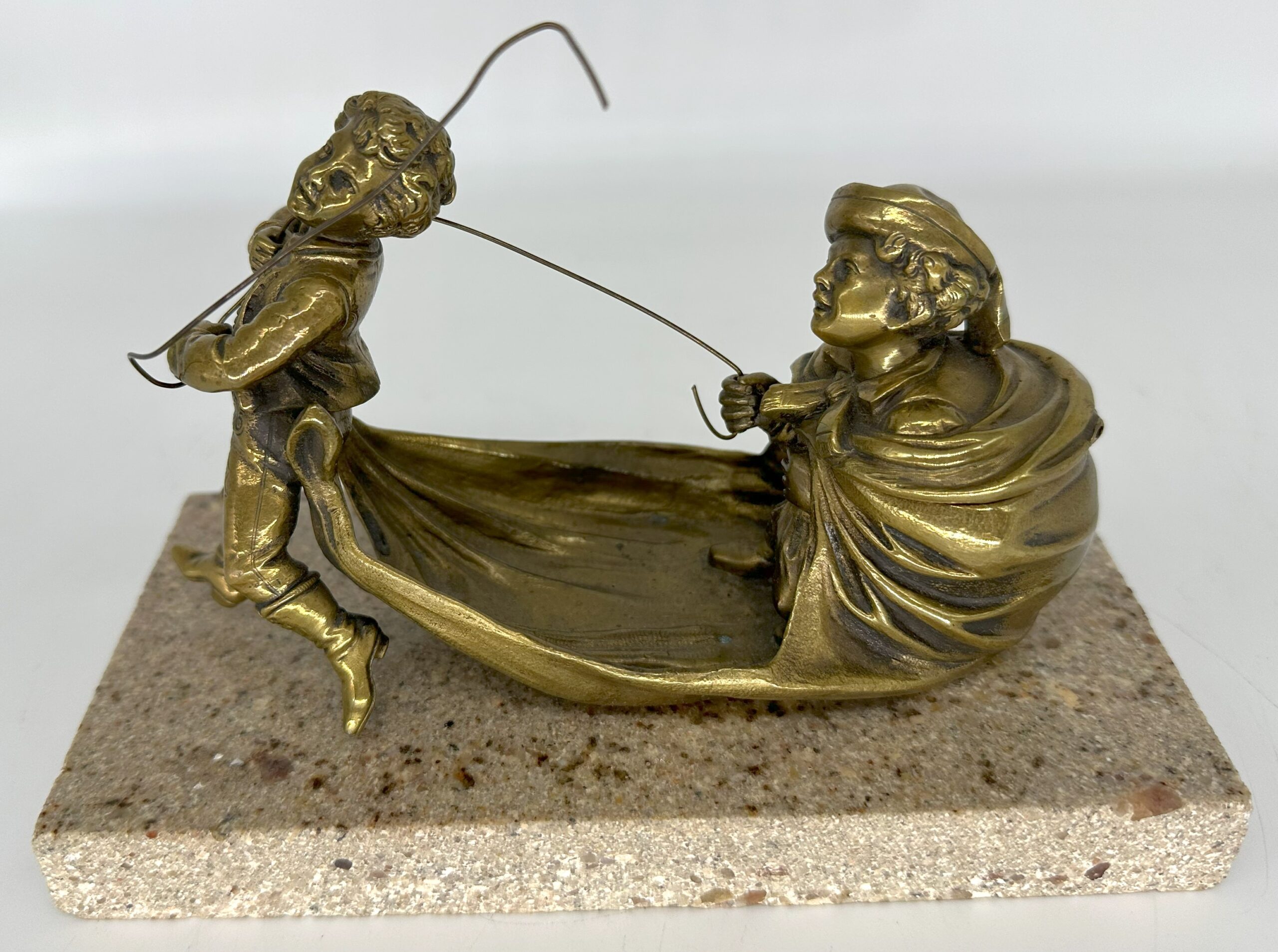This brass inkstand on a stone base depicts two boys playing. The boy in front is depicted in mid-stride, pulling the other boy who is seated in something resembling a sled or a large cloth, like a bedsheet. The boys are dressed in period clothing. The seated boy’s head is hinged to open, revealing the inkwell inside.