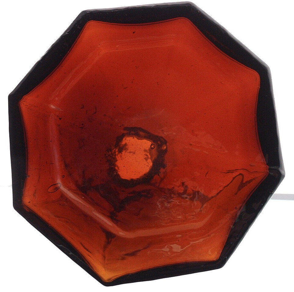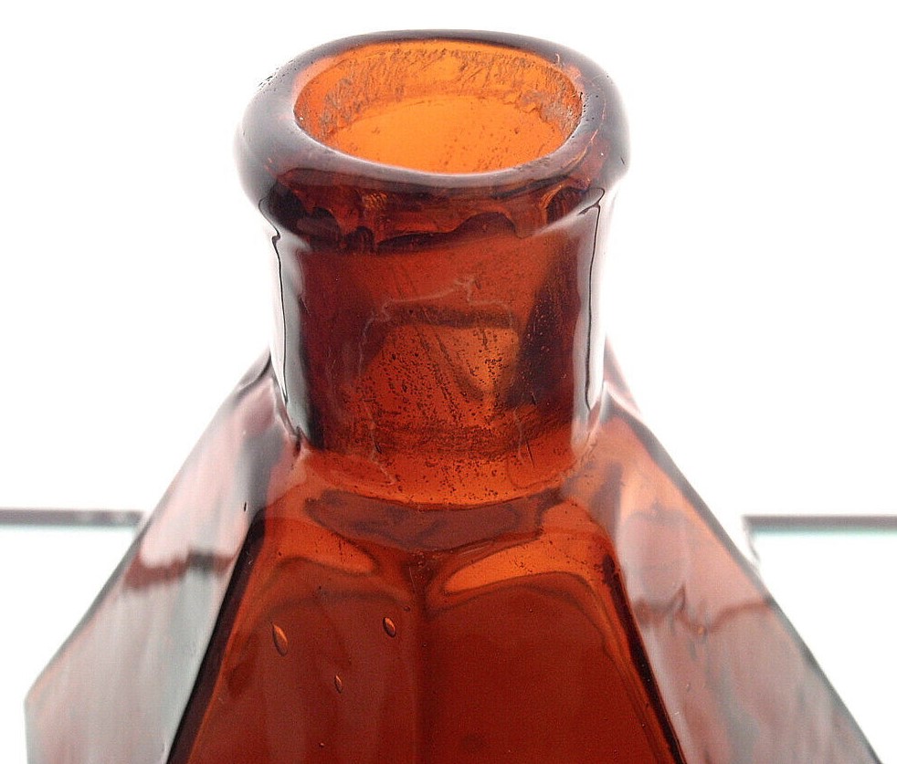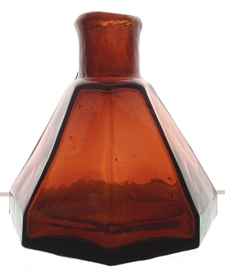 Orange-amber, rolled lip, unembossed eight-panel umbrella glass ink bottle.