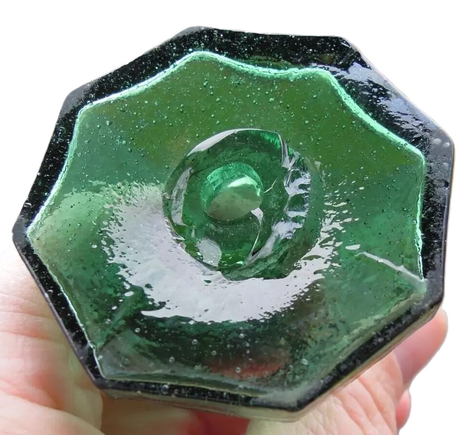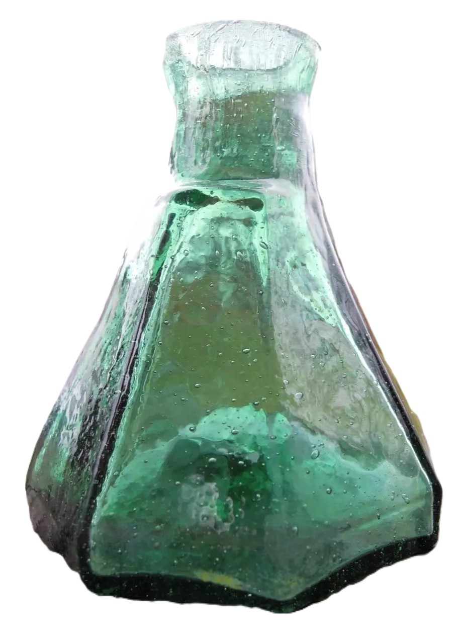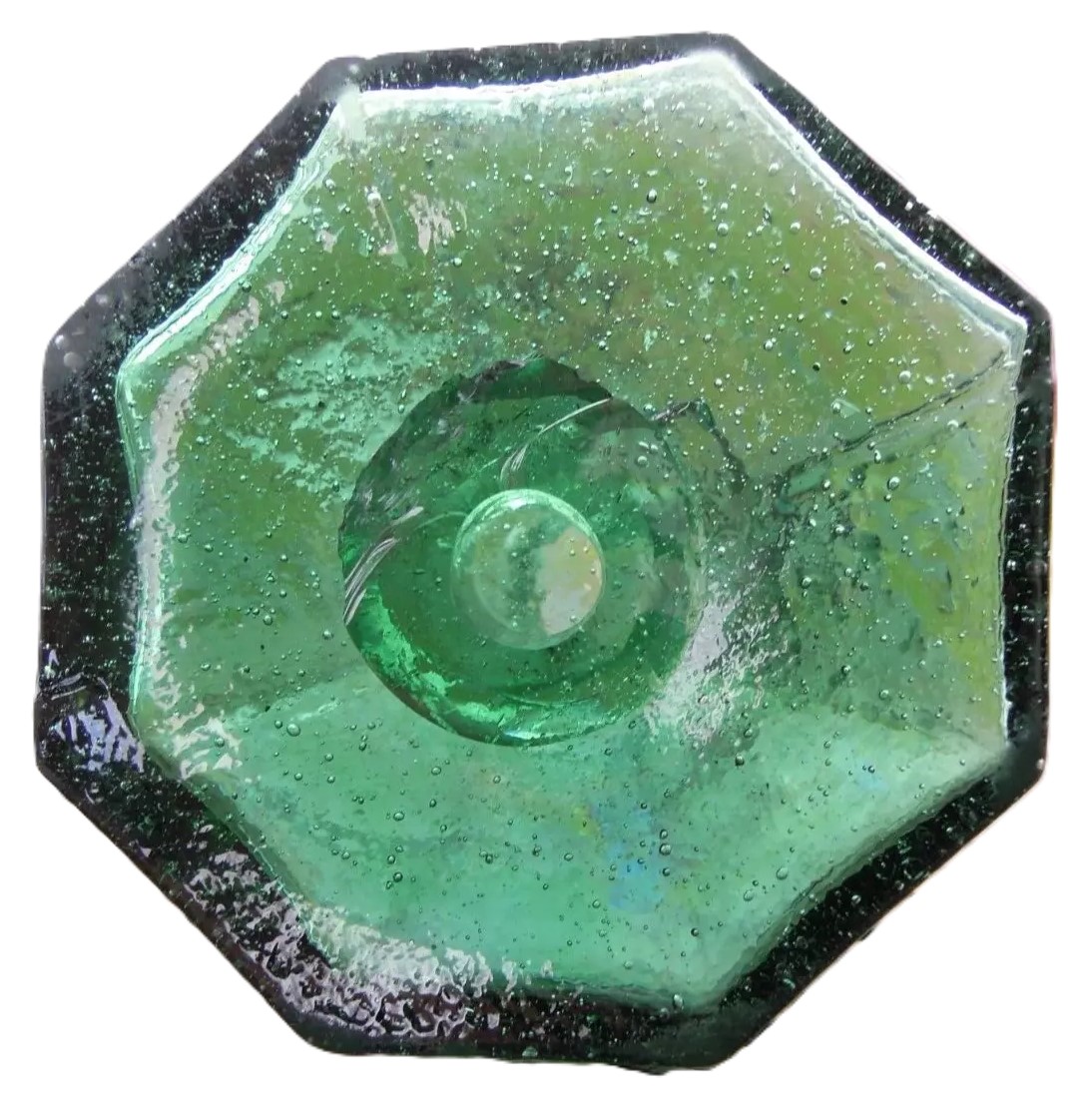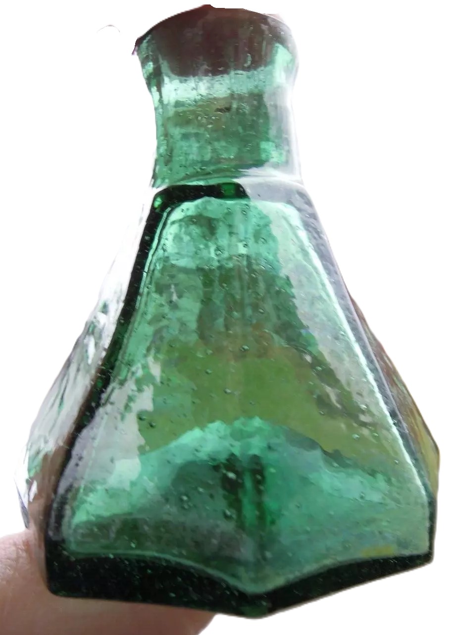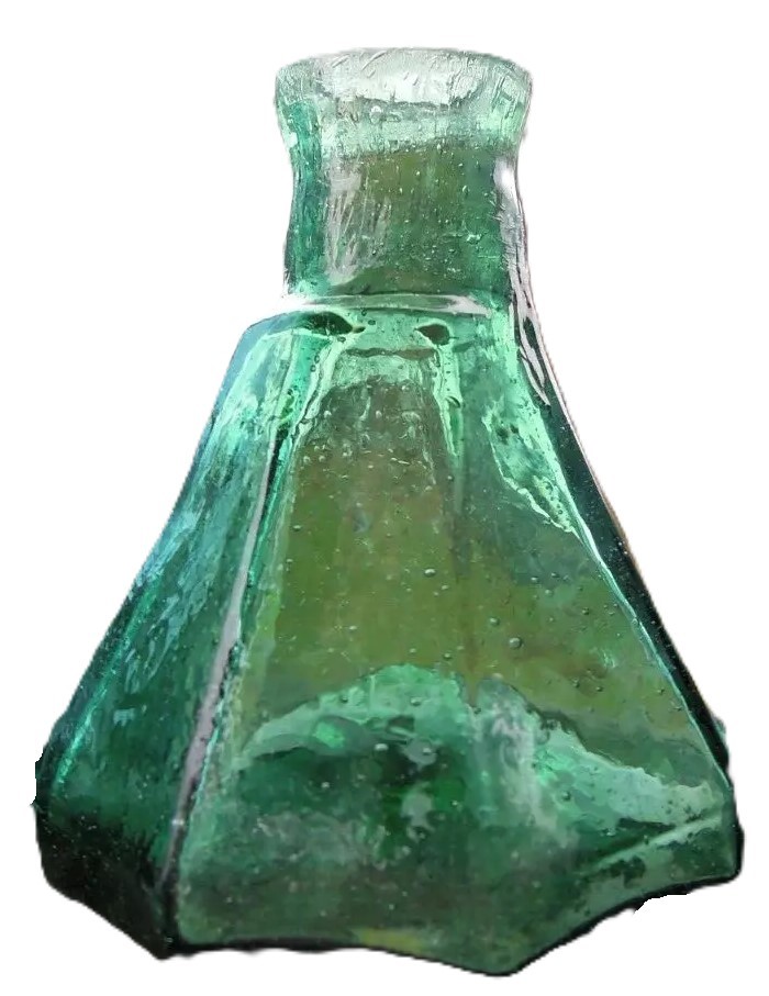 This eight-sided umbrella ink bottle is greenish teal in color. It has a shallow open bubble on the inside of the neck and an open pontil mark.