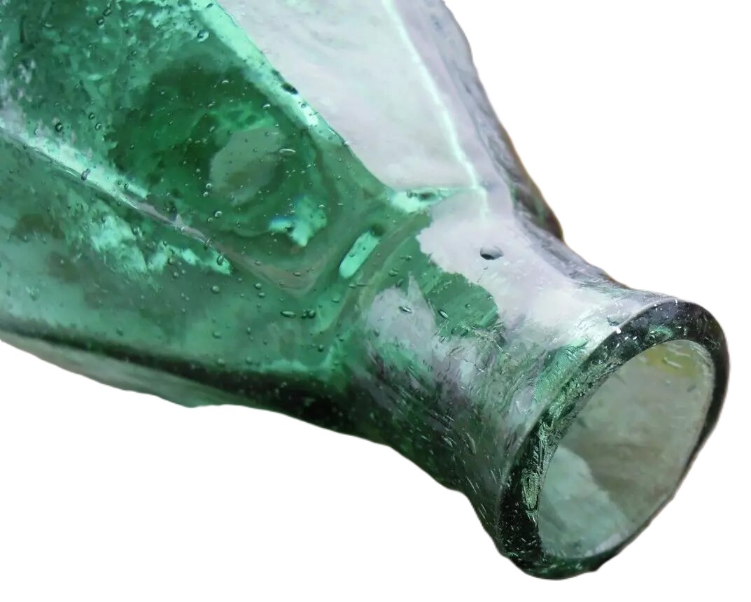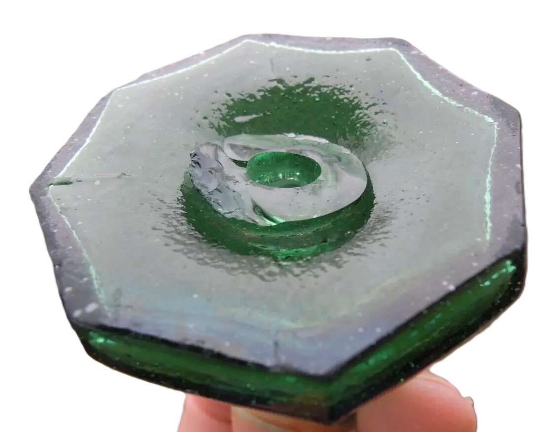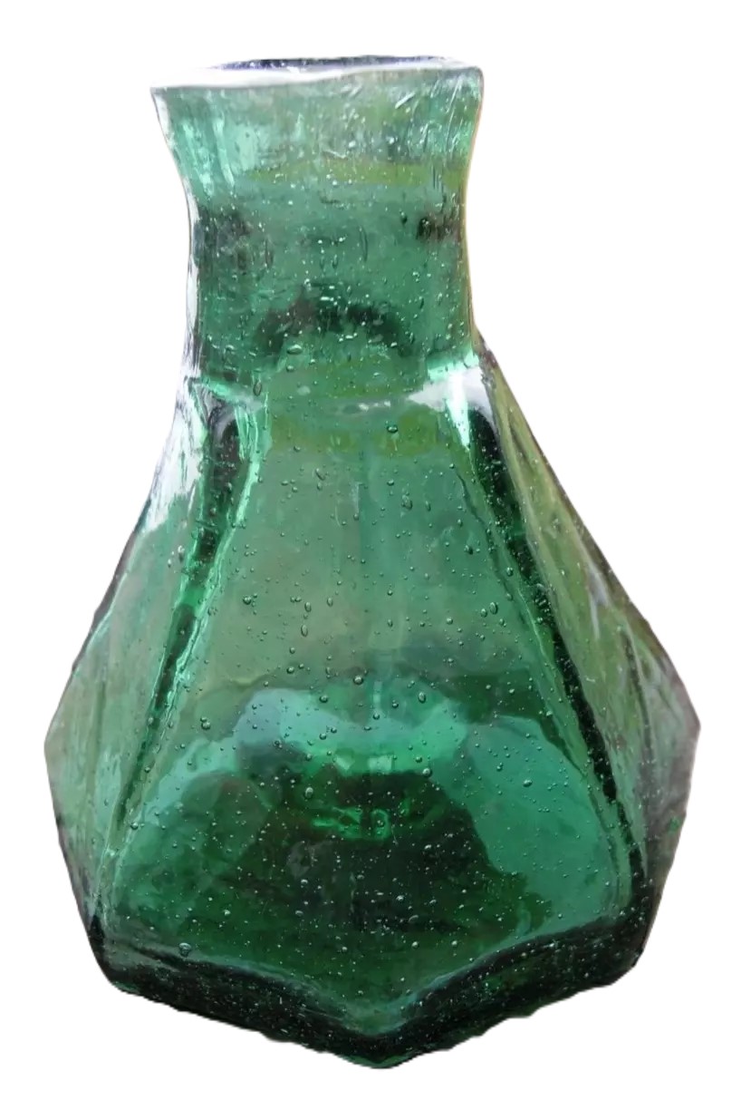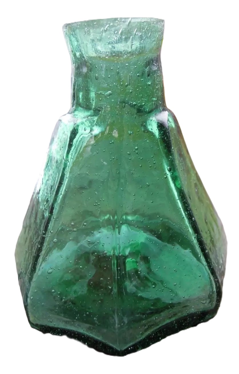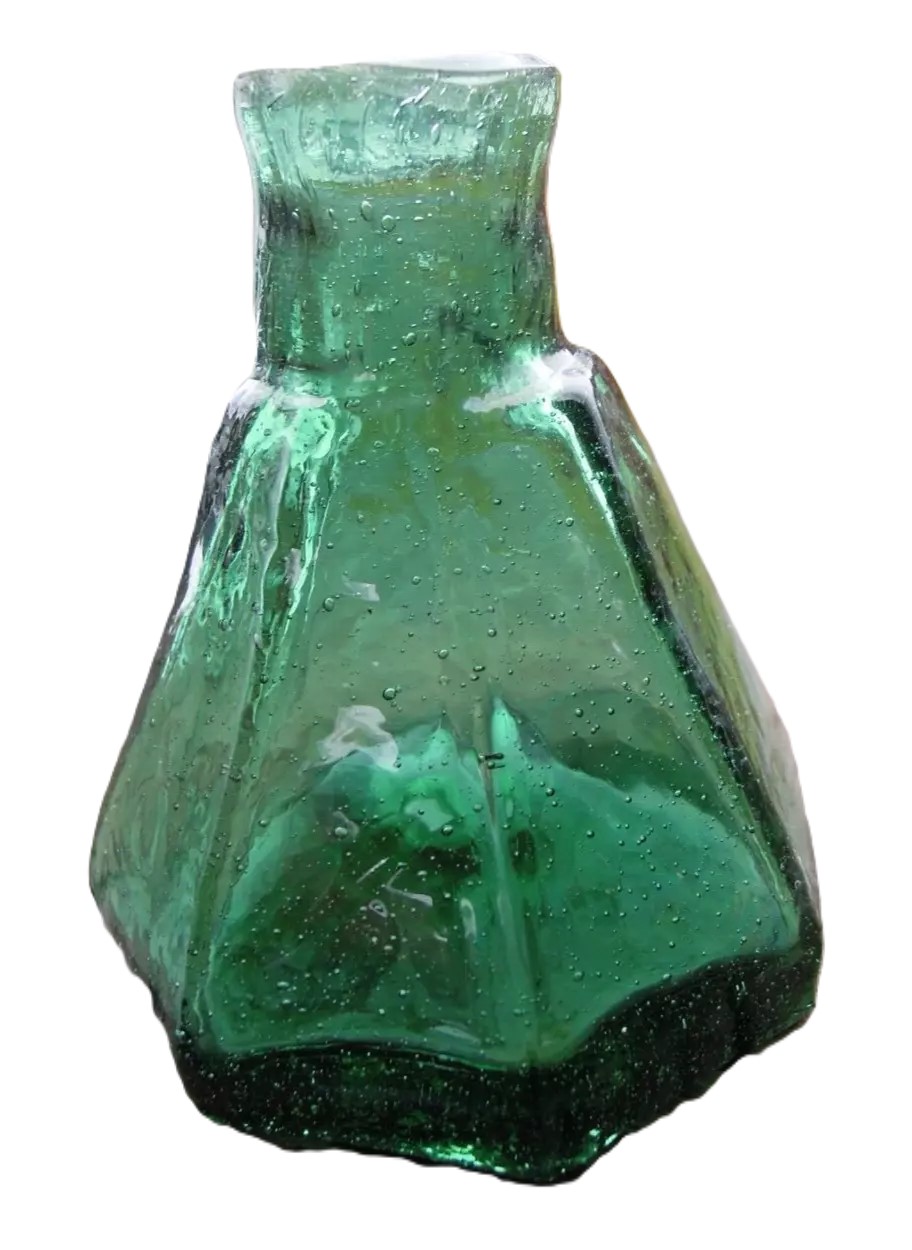 This eight-sided umbrella ink bottle is greenish teal in color. It has a shallow open bubble on the inside of the neck and an open pontil mark.