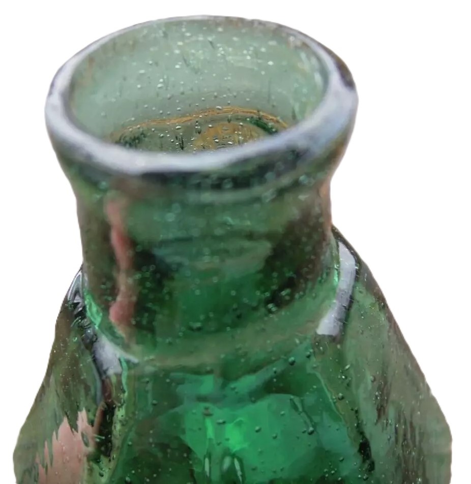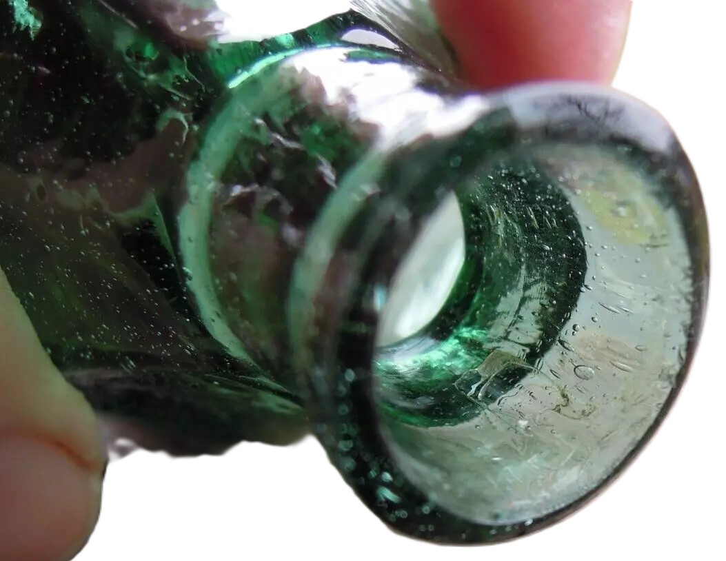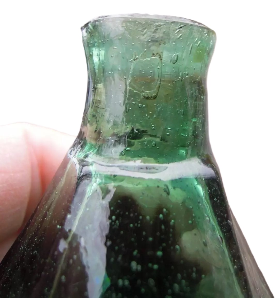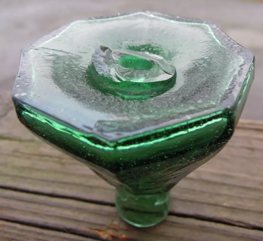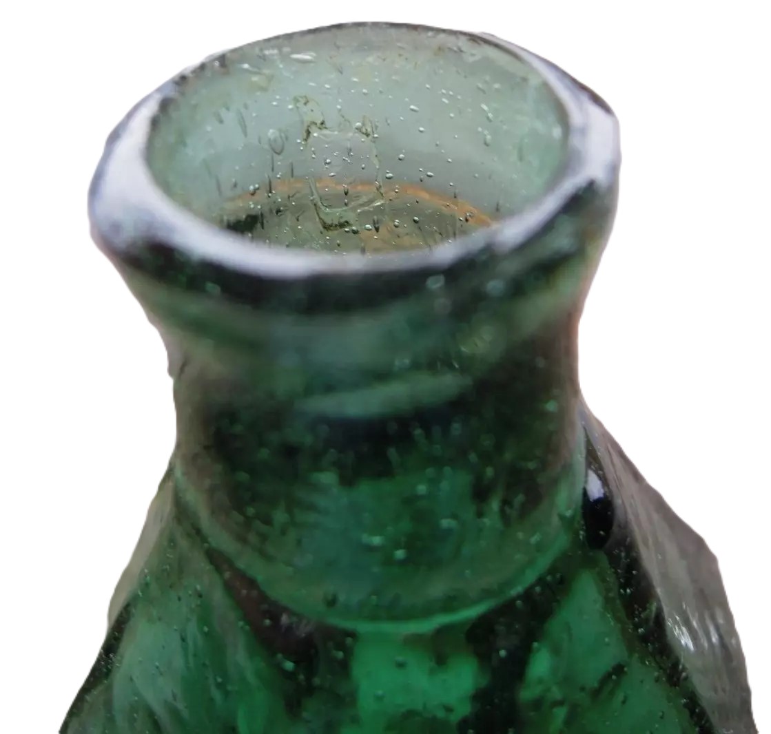 This eight-sided umbrella ink bottle is greenish teal in color. It has a shallow open bubble on the inside of the neck and an open pontil mark.