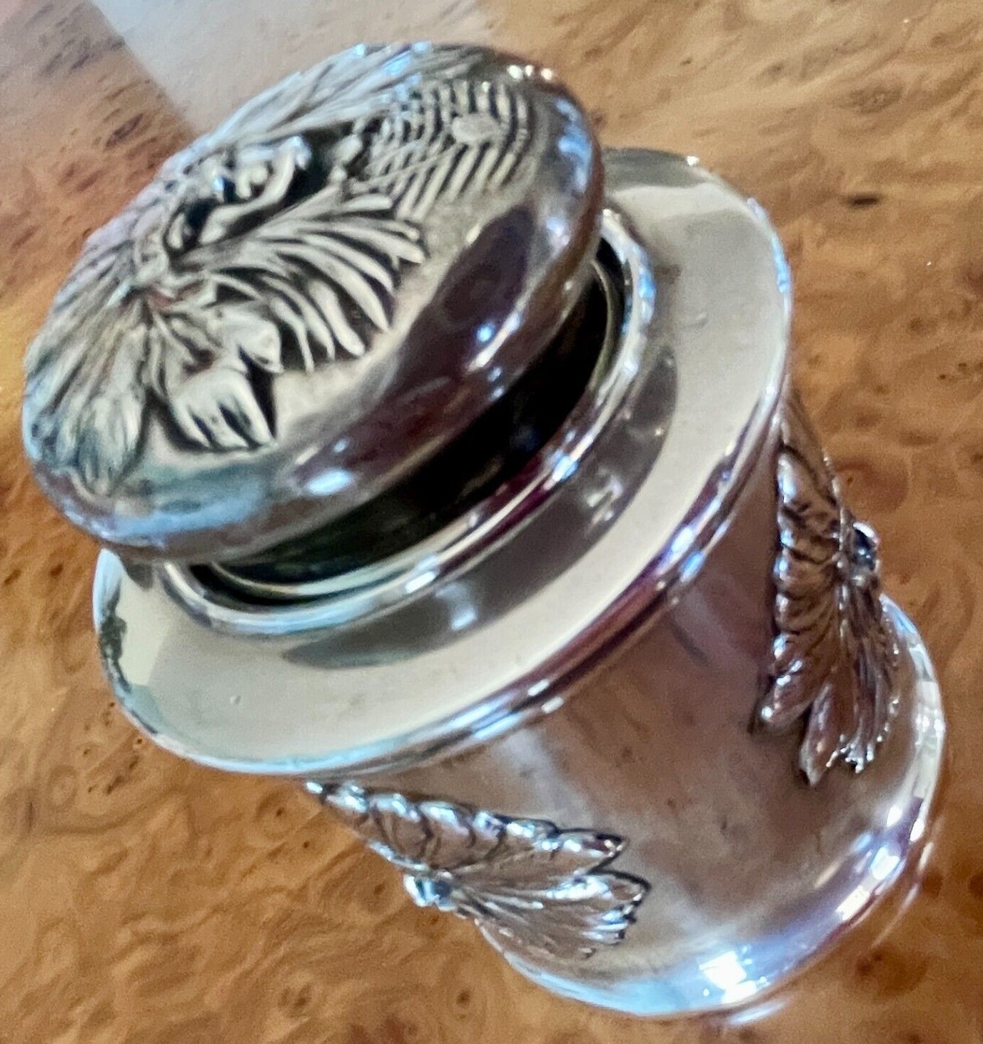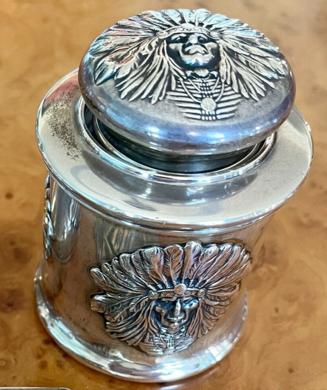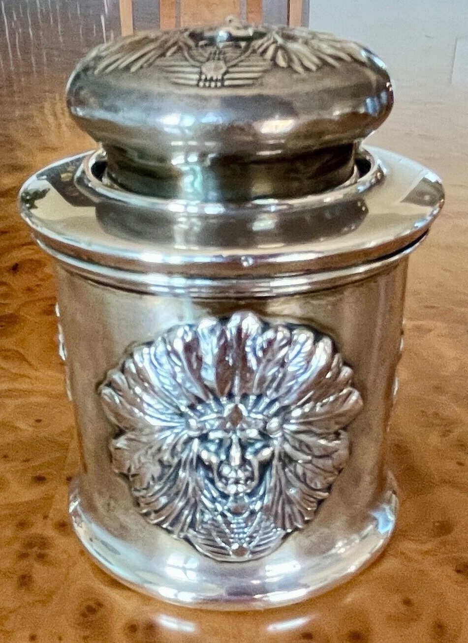 The Unger Bros Indian design on an inkwell is hard to find. This sterling silver inkwell has the face of an Indian chief on its side and lid. The unattached lid just lifts off to access the ink. The inkwell is marked with the intertwined UB mark, 925 Fine Sterling, UB logo.