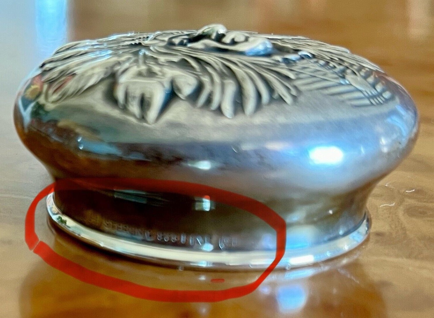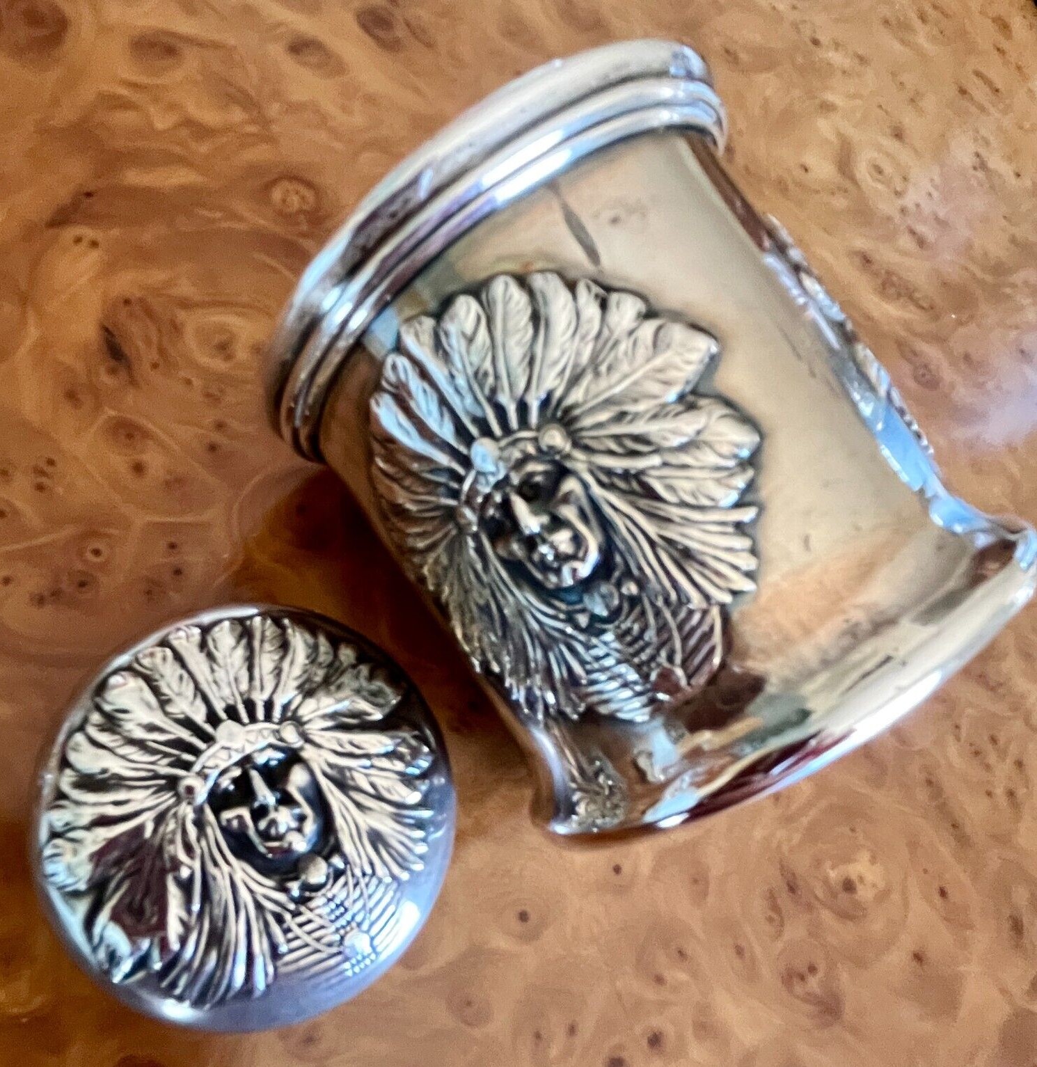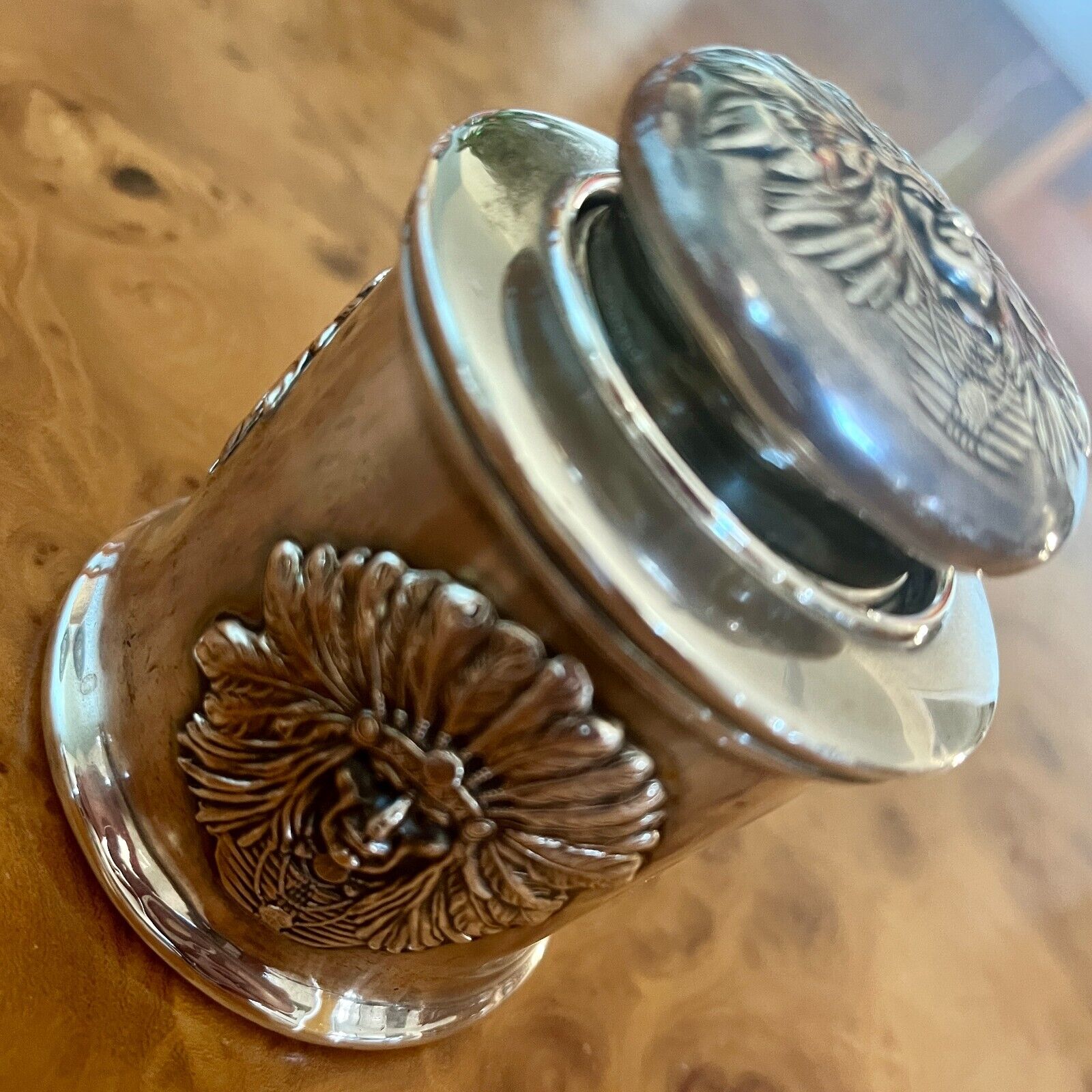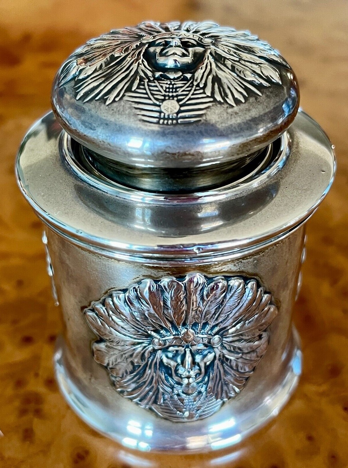 The Unger Bros Indian design on an inkwell is hard to find. This sterling silver inkwell has the face of an Indian chief on its side and lid. The unattached lid just lifts off to access the ink. The inkwell is marked with the intertwined UB mark, 925 Fine Sterling, UB logo.