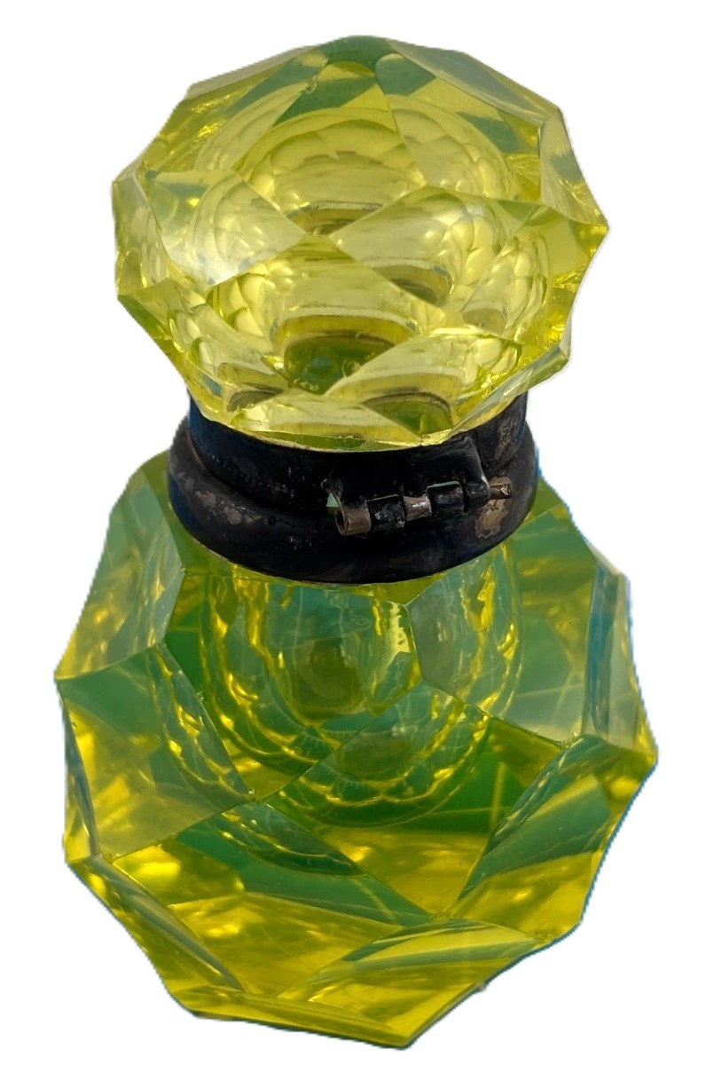 - Color and Appearance: The inkwell has a vibrant, translucent yellow-green color. The glass is faceted with multiple cut surfaces on both the main body and the lid, which allows light to catch and reflect in a brilliant manner. The color is characteristic of glass made with uranium oxide.