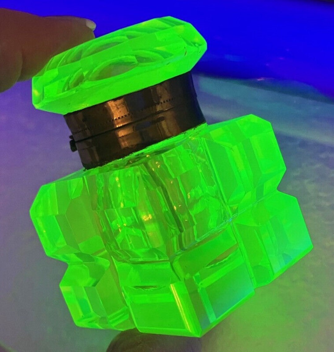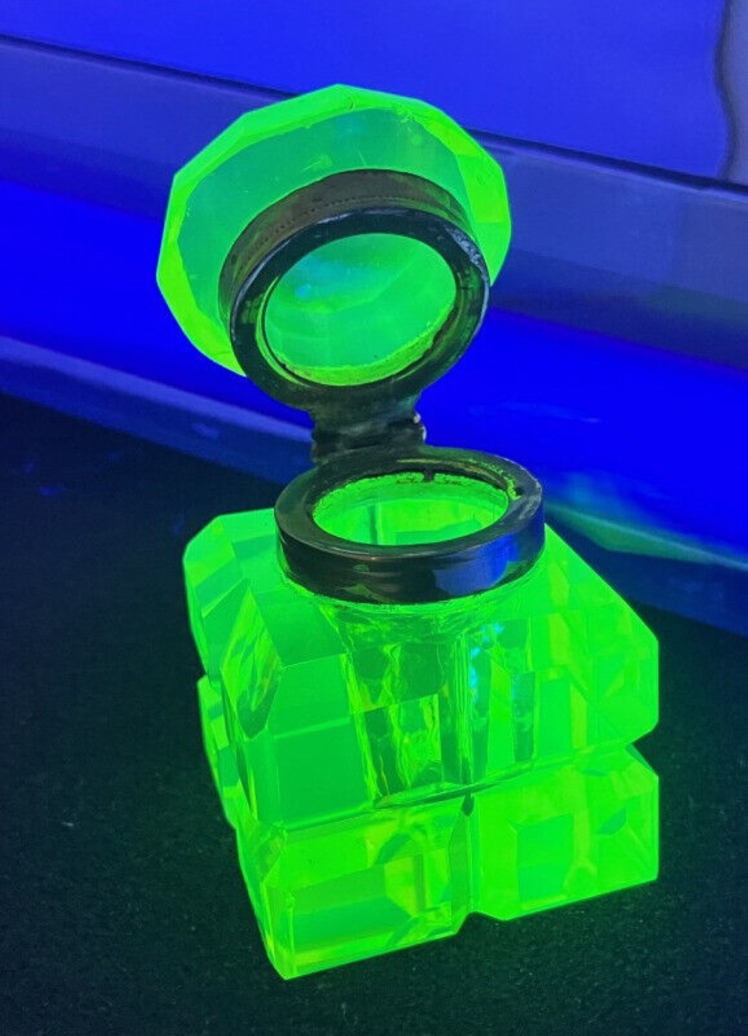 The cubed body is deeply cut into four beveled blocks on each side. In natural light it is a Vaseline yellow green. Under black light it glows a brilliant uranium yellow.