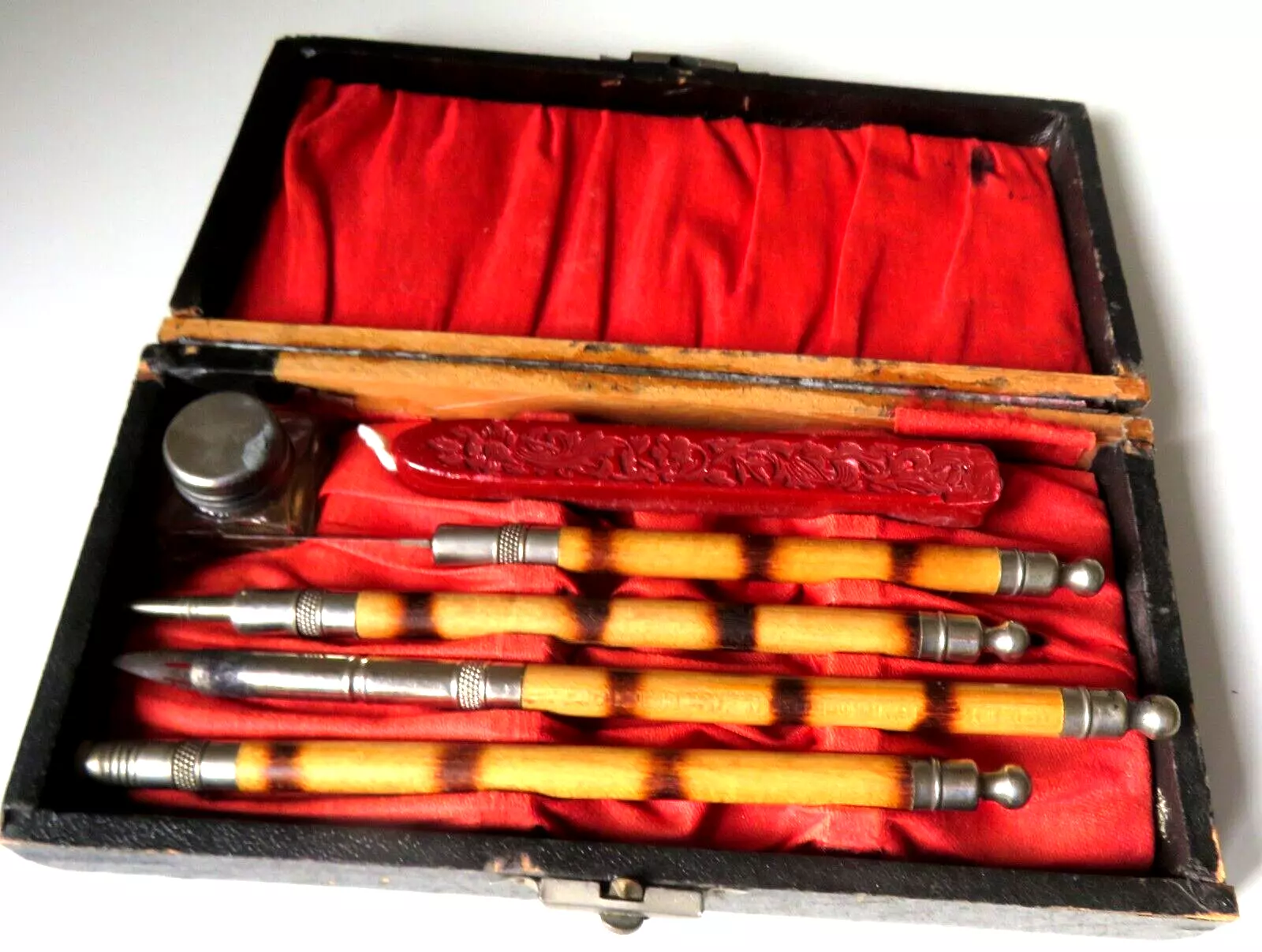 An elegant writing set with bamboo-inspired designs with East Asian influences. Included are an inkwell, quill knife, pencil, mechanical pencil, dip pen, and sealing wax.
