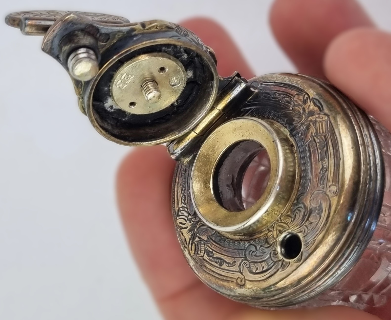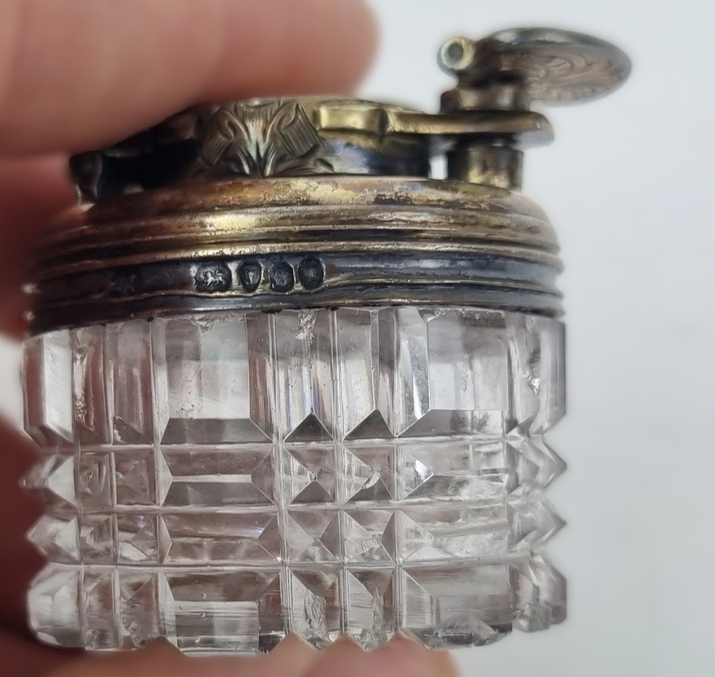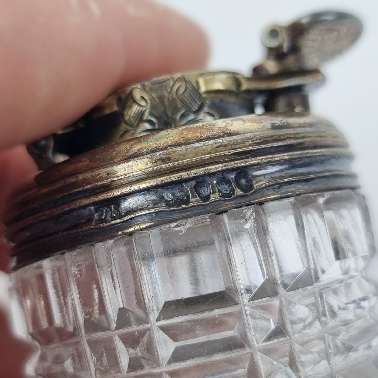 The body of the inkwell is made from thick, cut glass, with a multi-faceted design. The top is fitted with a hinged lid crafted from sterling silver. The lid’s surface is engraved with a monogram and is hallmarked with the maker’s mark (John Harris), the city mark (London), and the date letter for 1853.