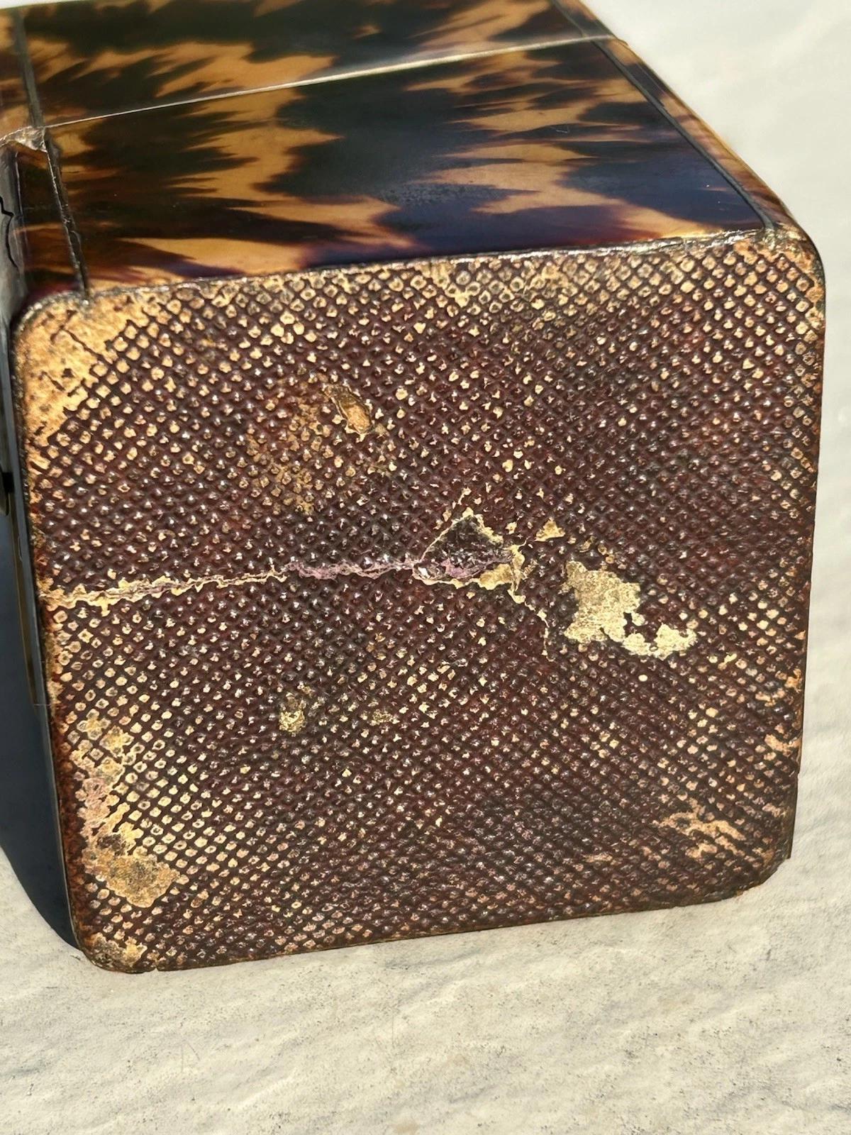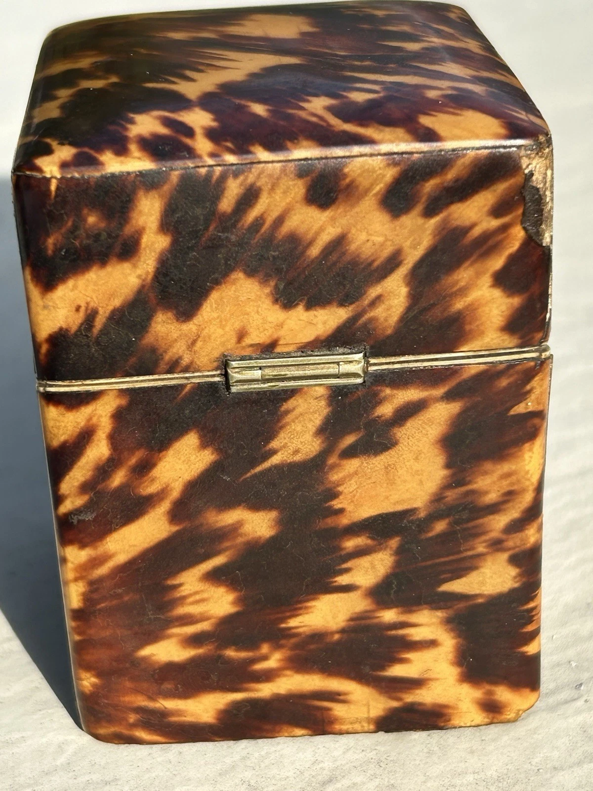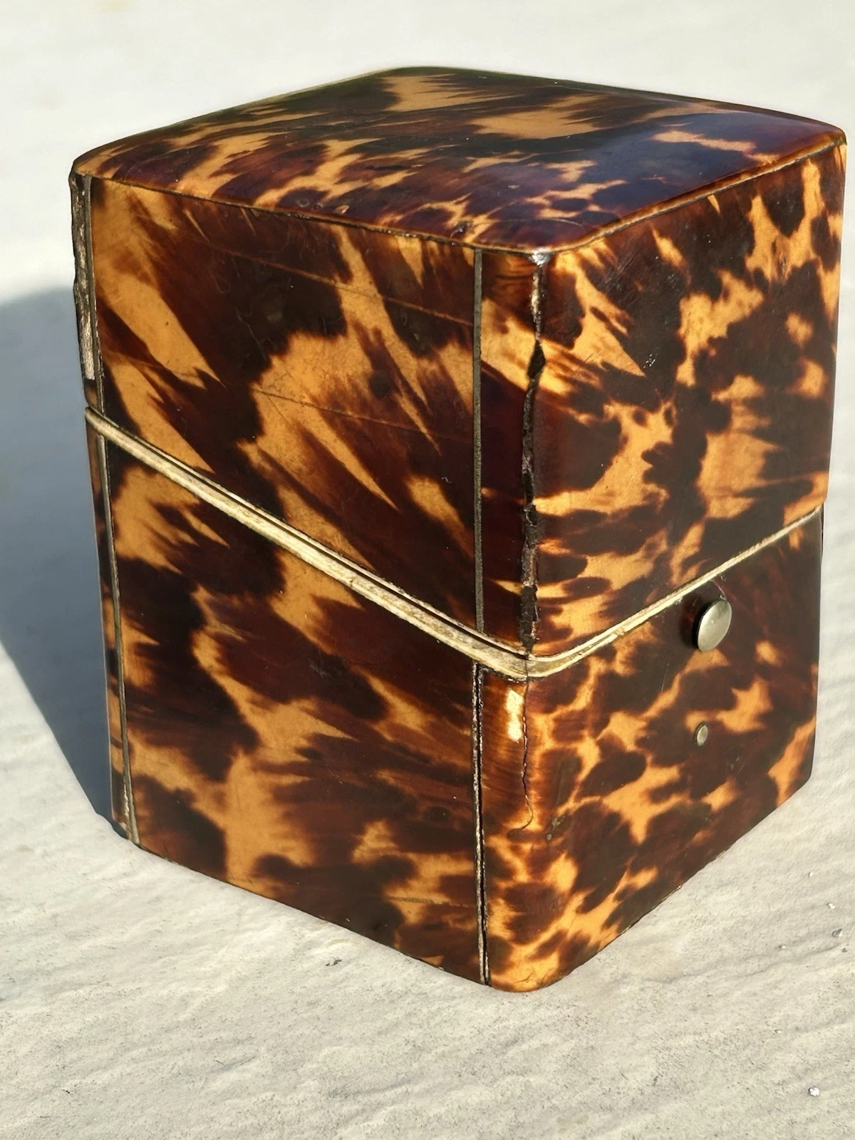 - The Case: The case is a small, rectangular box made of “faux tortoiseshell.” It has a warm, brown-and-gold mottled appearance, mimicking the shell of a tortoise. It is hinged on one side and opens by pressing a small button on the front, which releases a catch. The interior is lined with a dark, plush velvet, which is used to protect the delicate glass inkwell and hold it securely in place.