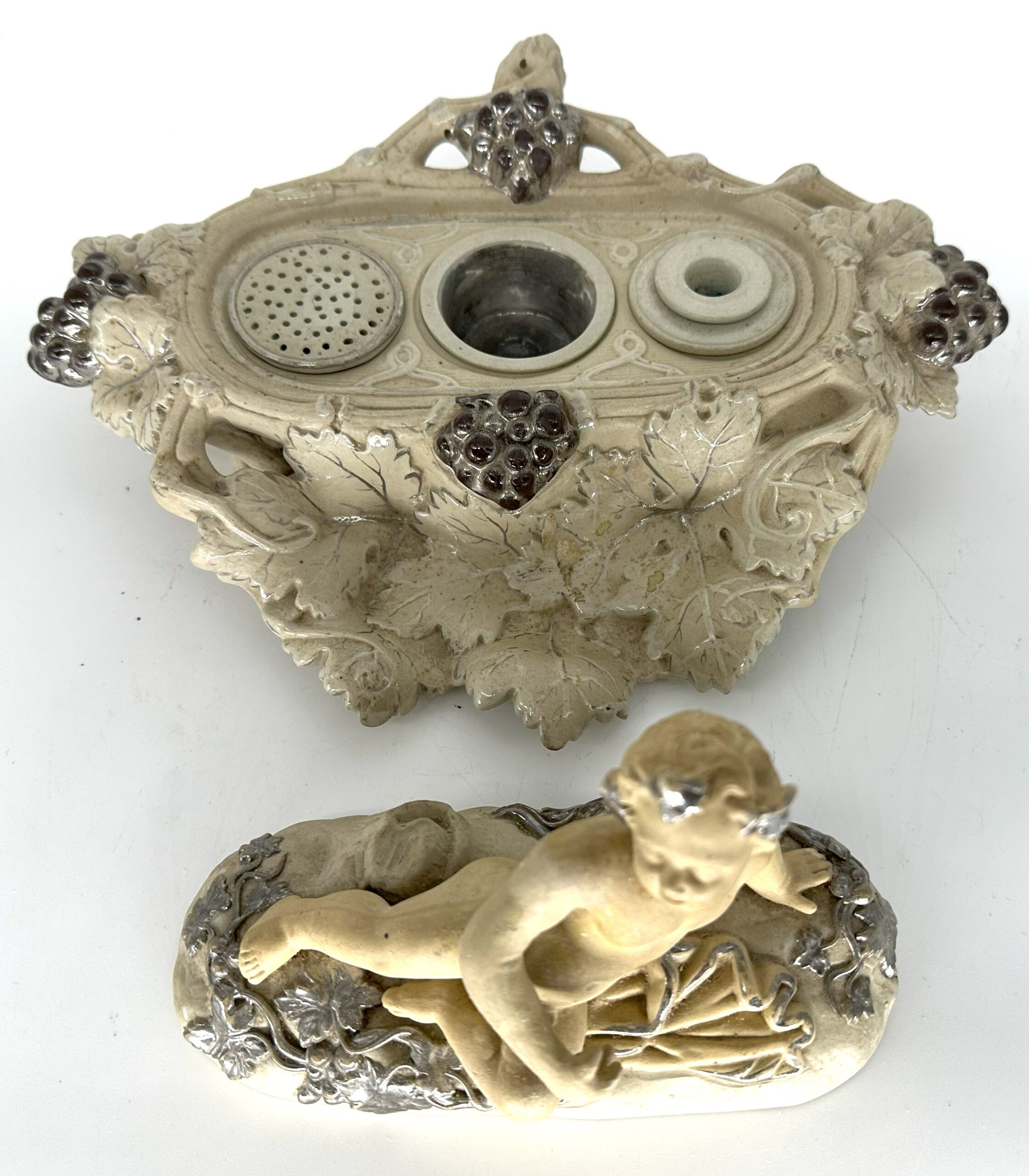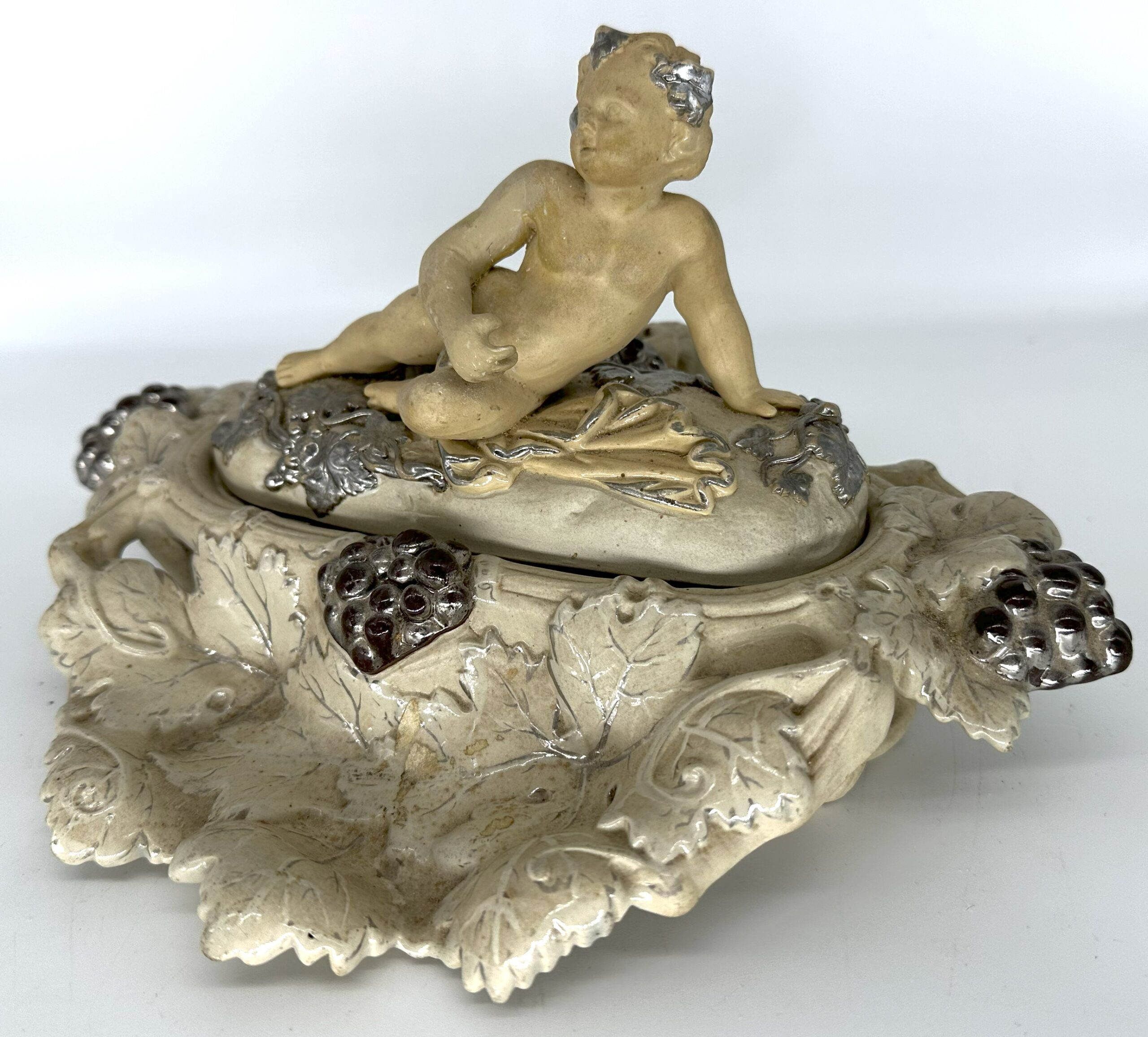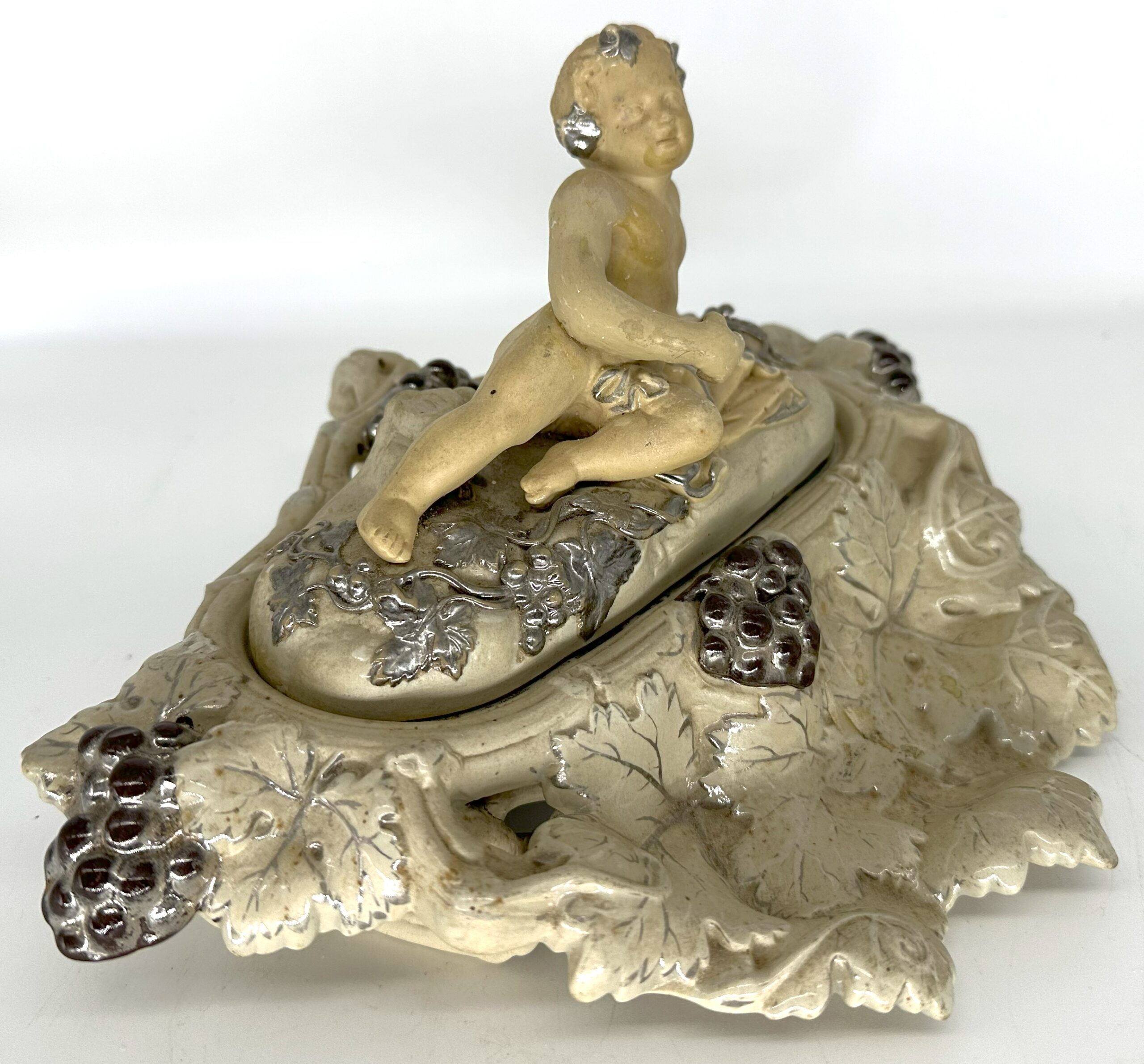 This Villeroy & Boch pottery inkstand was handcrafted in Mettlach, Germany. It features a cherub figure reclining among grapevines with silver highlights. Lift the top piece with the cherub to access a pounce pot / sander, inkwell, and open container for storage.
