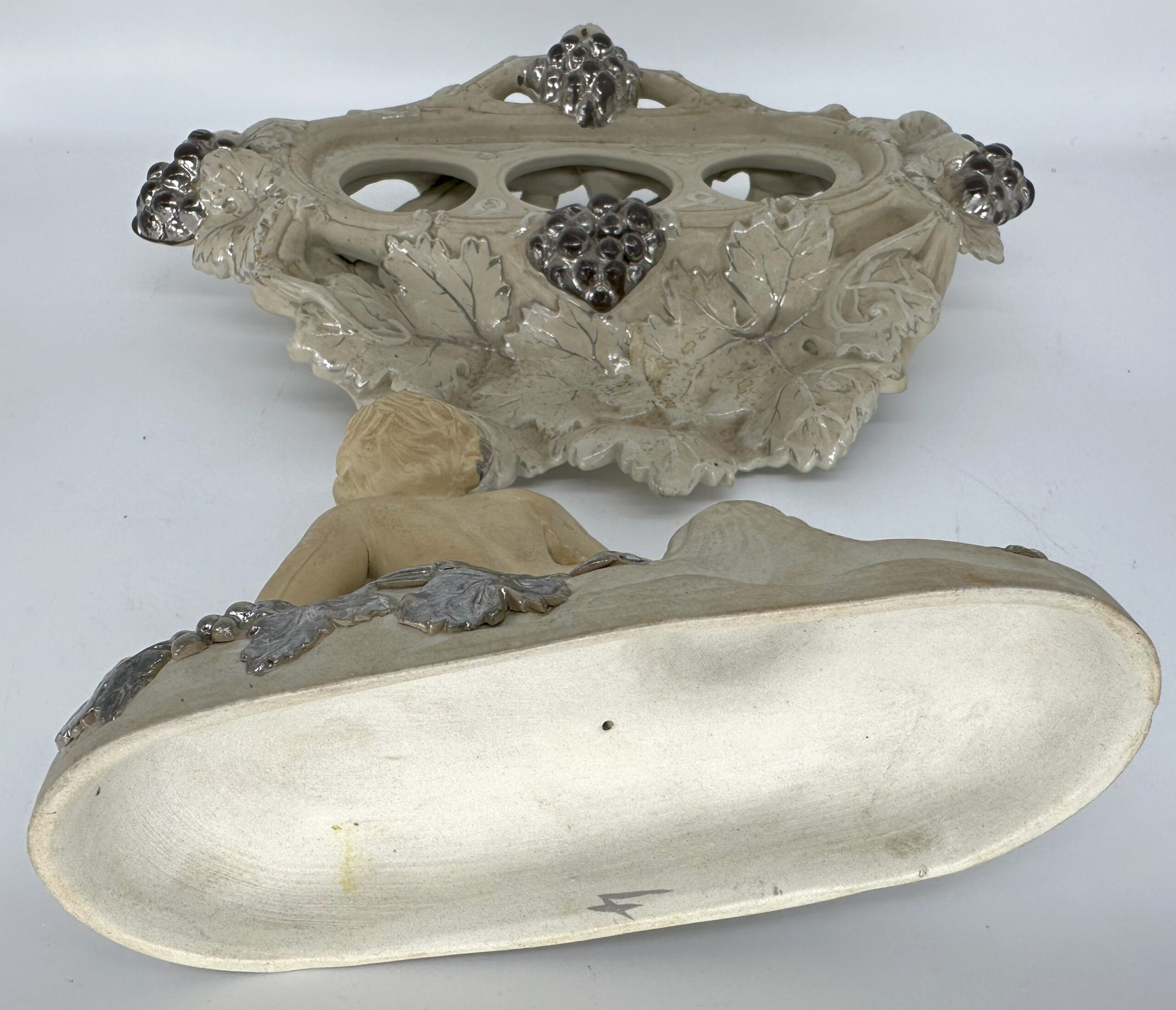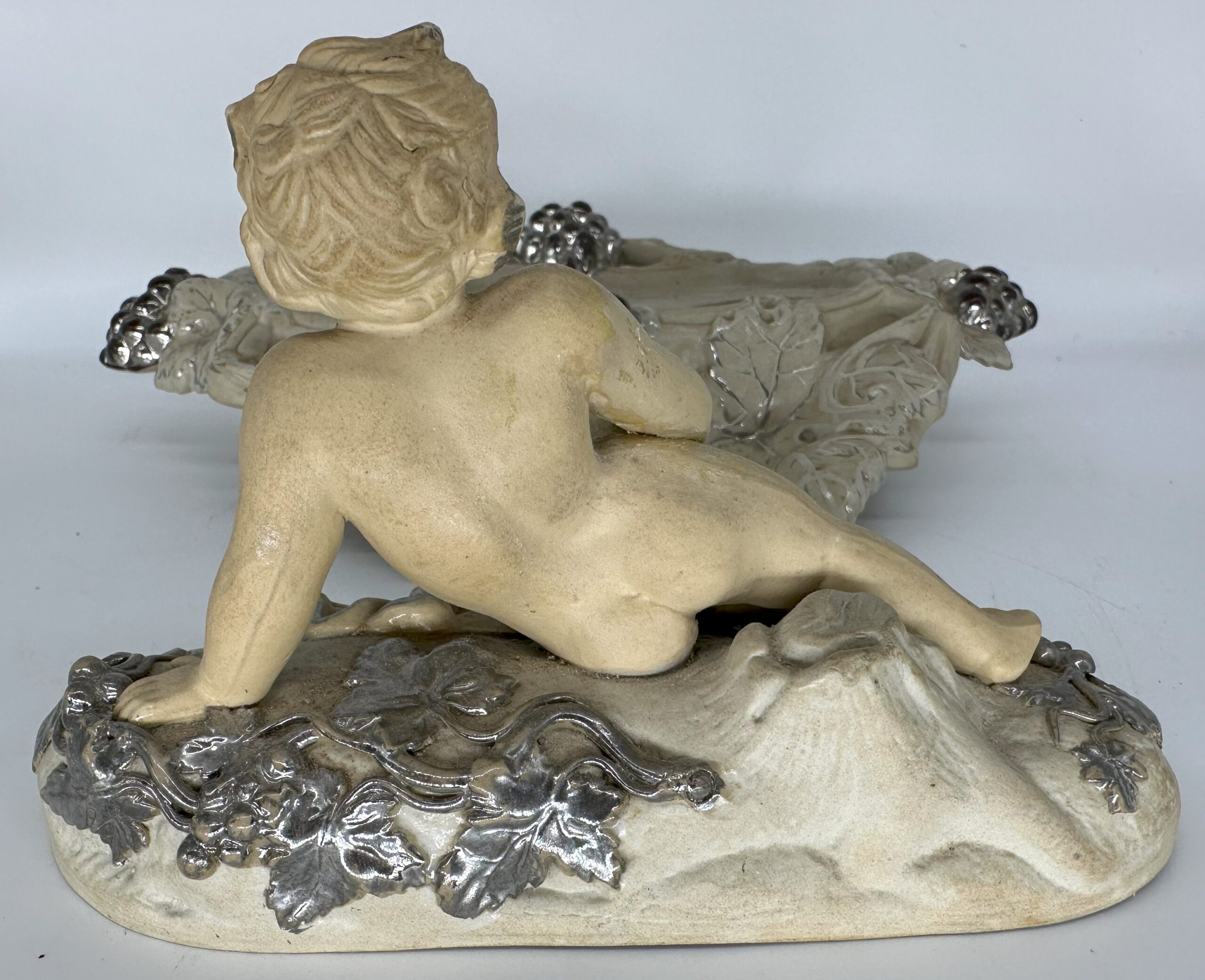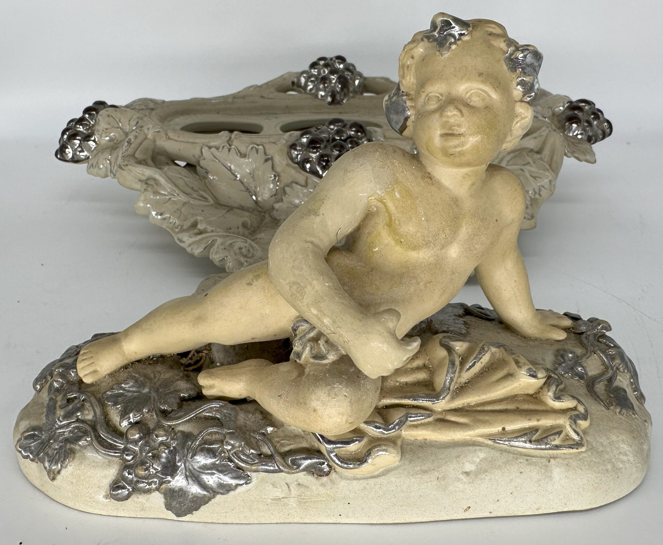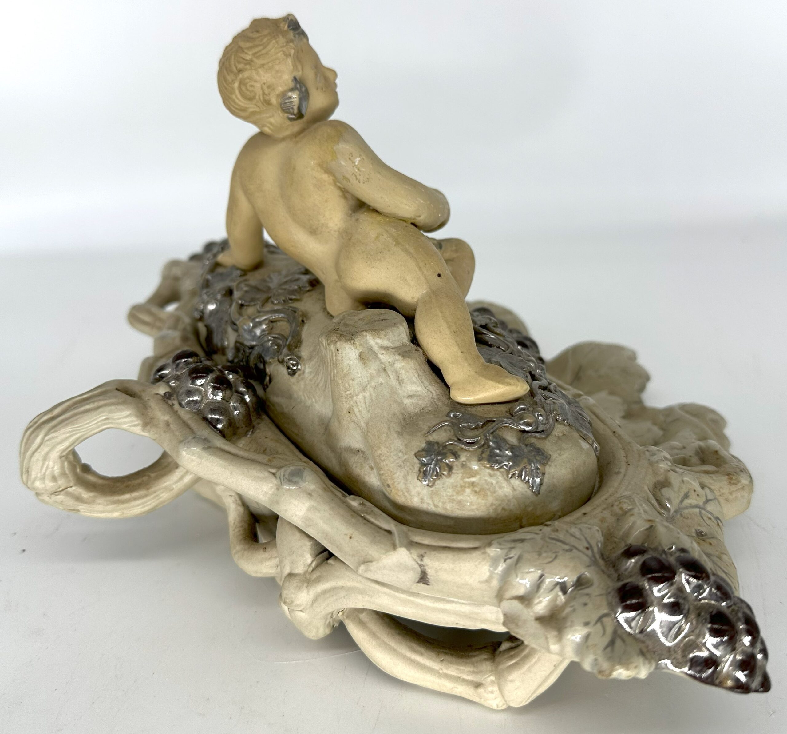 This Villeroy & Boch pottery inkstand was handcrafted in Mettlach, Germany. It features a cherub figure reclining among grapevines with silver highlights. Lift the top piece with the cherub to access a pounce pot / sander, inkwell, and open container for storage.