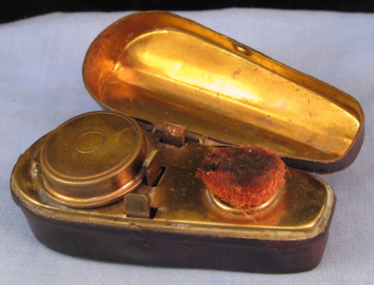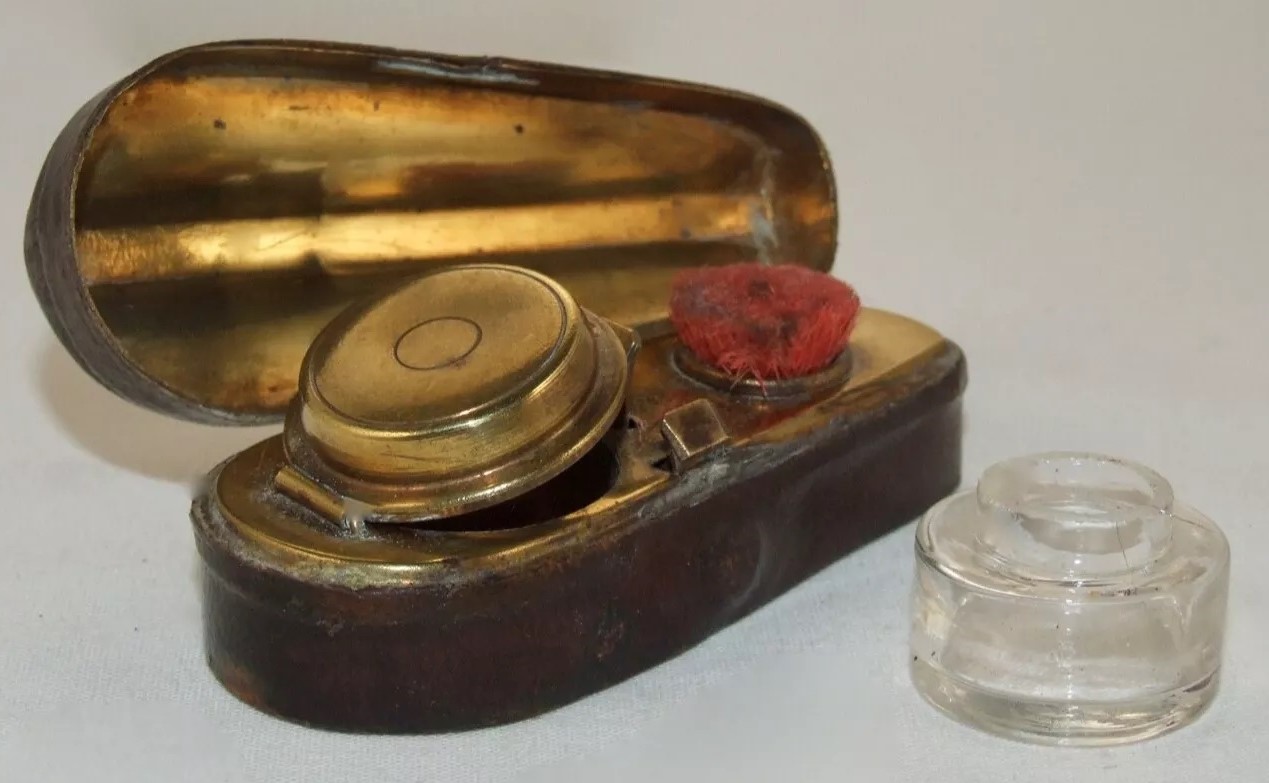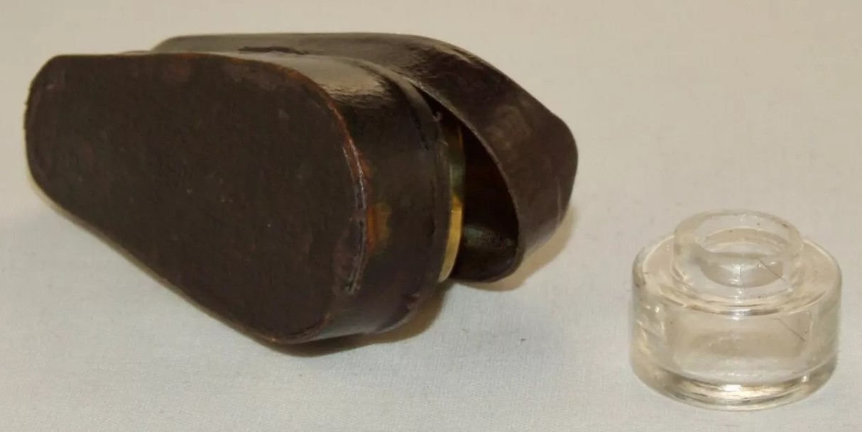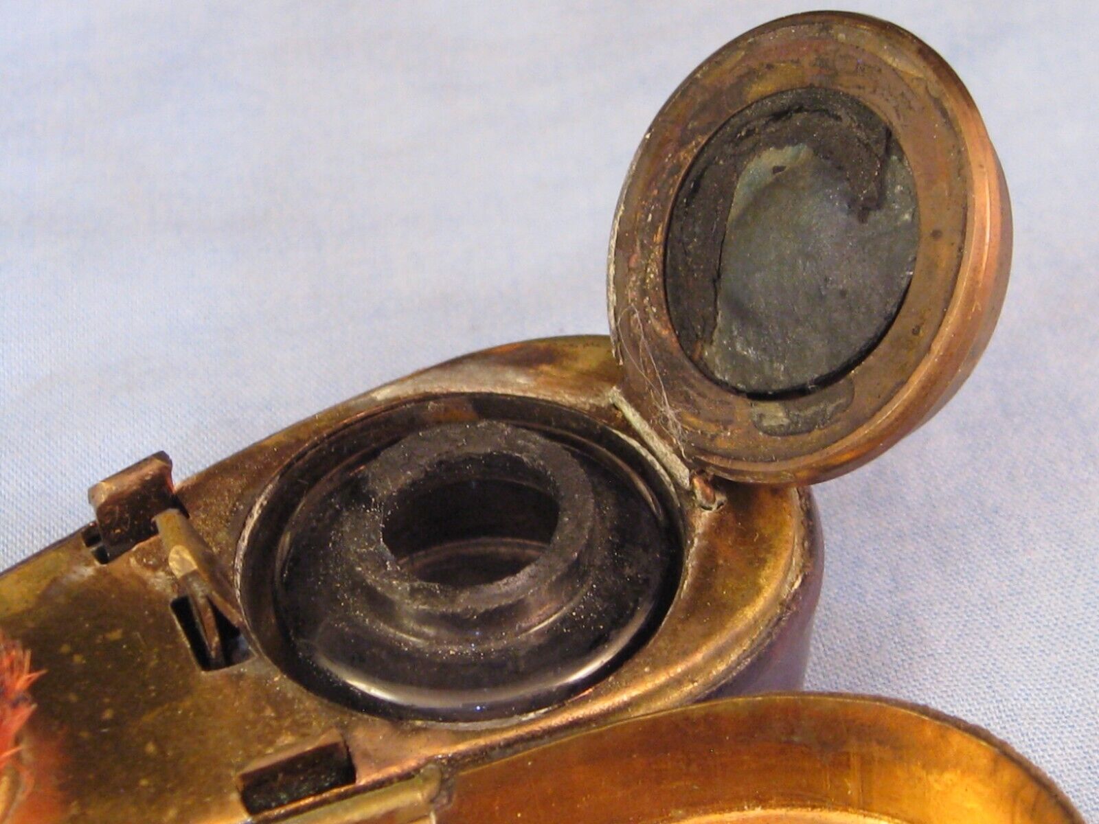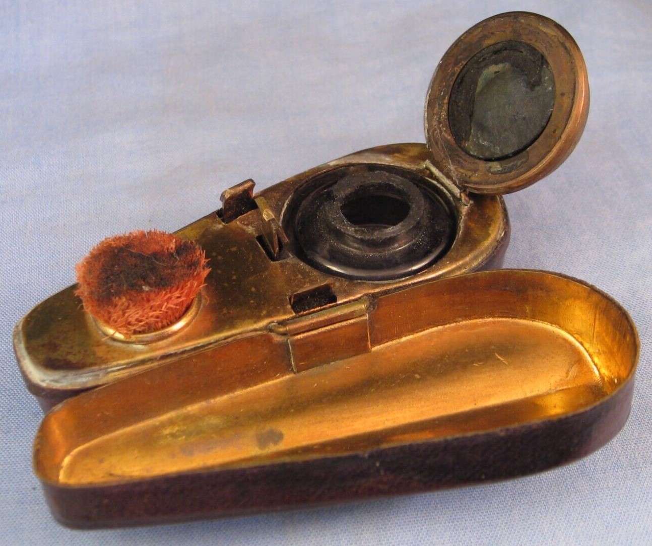 A traveler with a red leather cover on brass interior is fashioned as a violin case with a carrying handle. It has two spring-loaded covers with thumb release button and security catch securing the glass ink bottle inside. The case contains both an inkwell and a pen wipe.