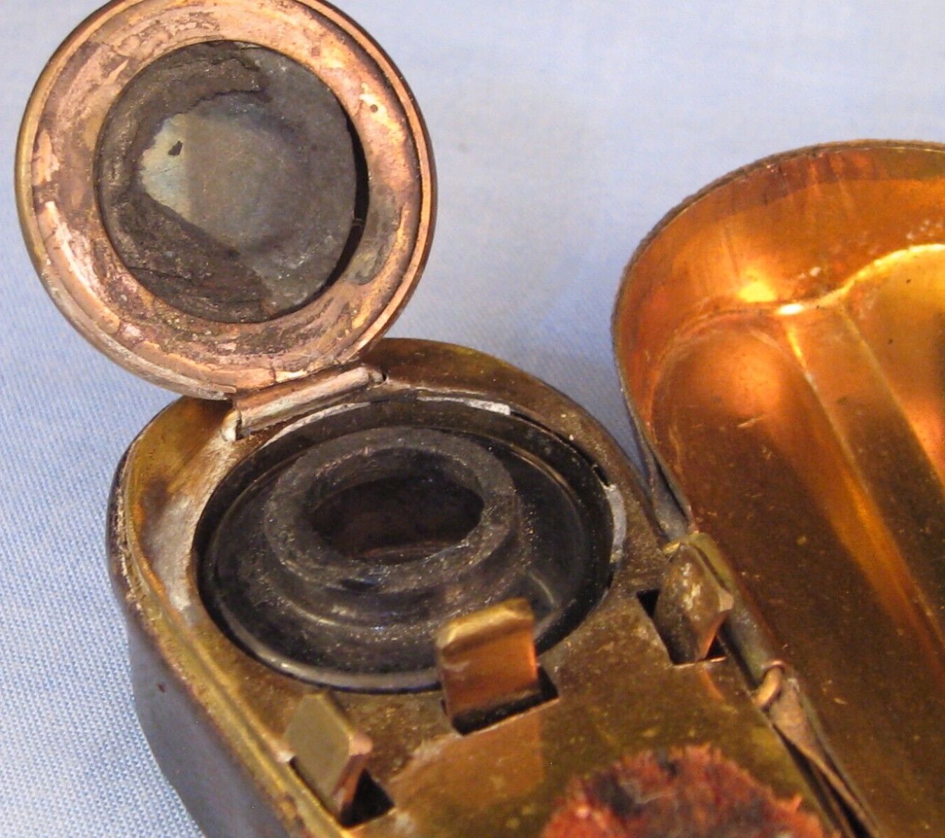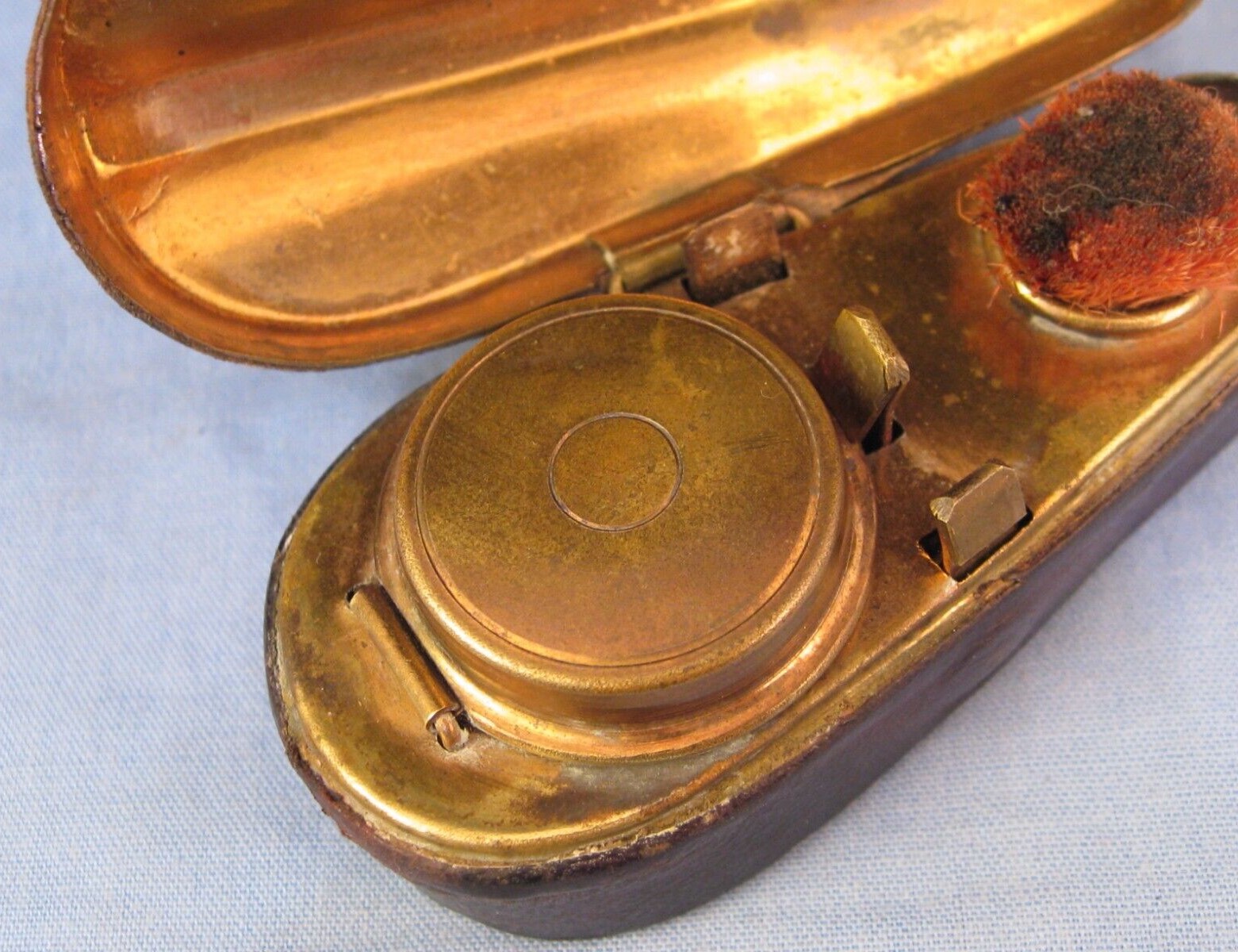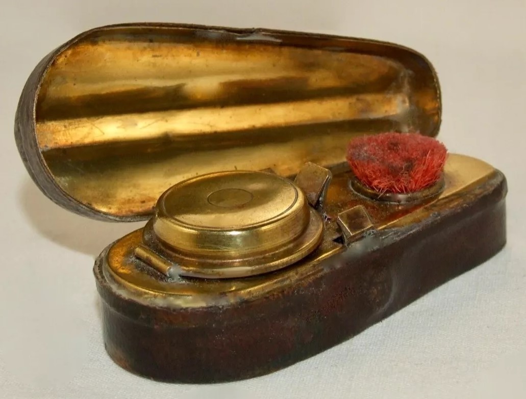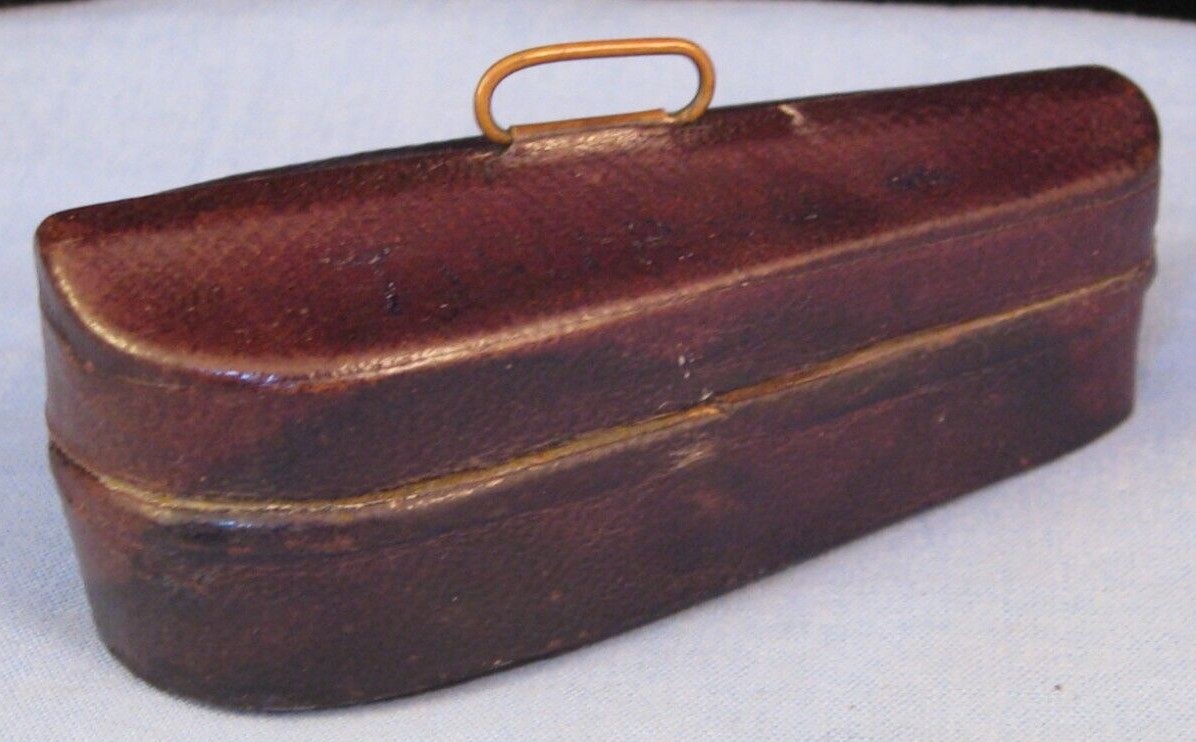 A traveler with a red leather cover on brass interior is fashioned as a violin case with a carrying handle. It has two spring-loaded covers with thumb release button and security catch securing the glass ink bottle inside. The case contains both an inkwell and a pen wipe.