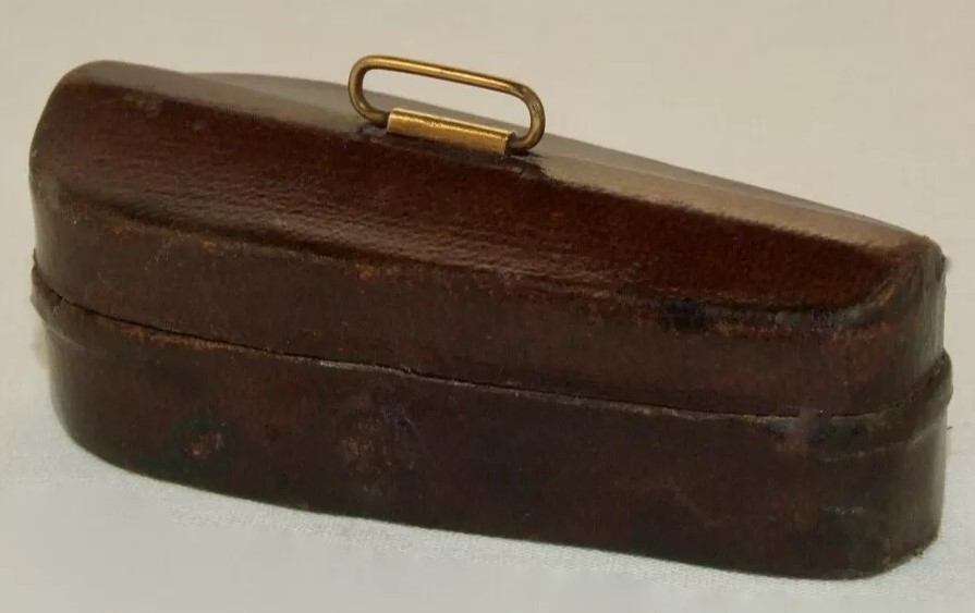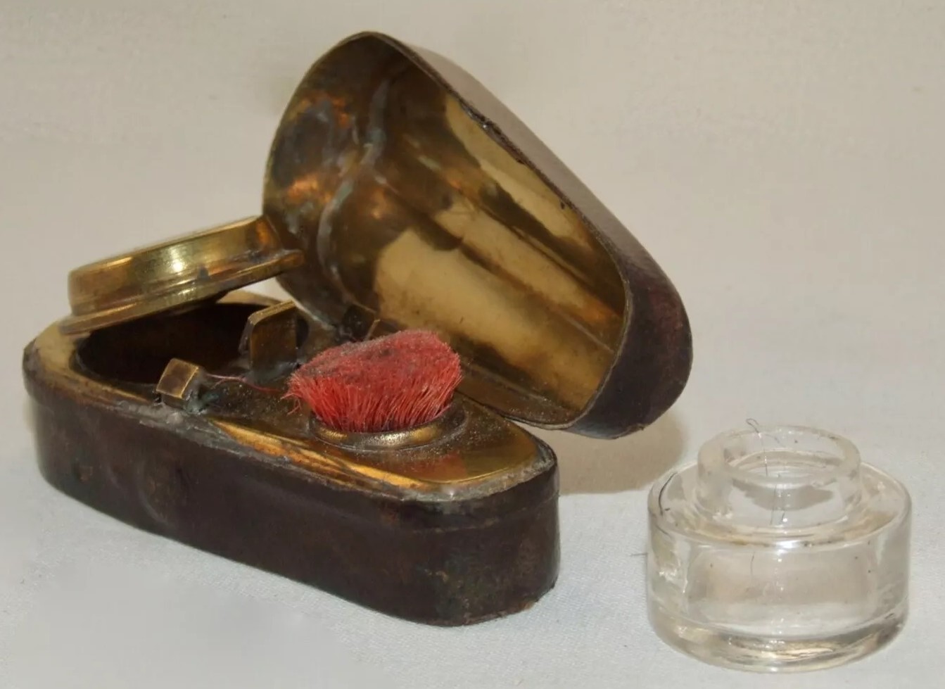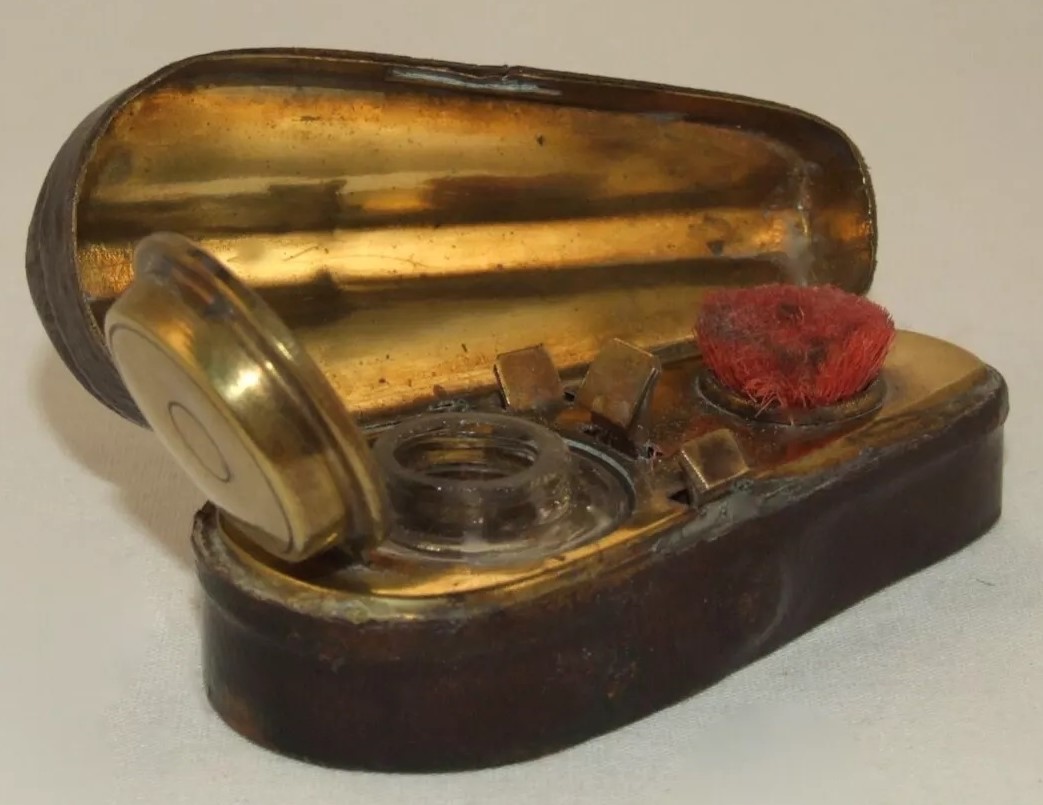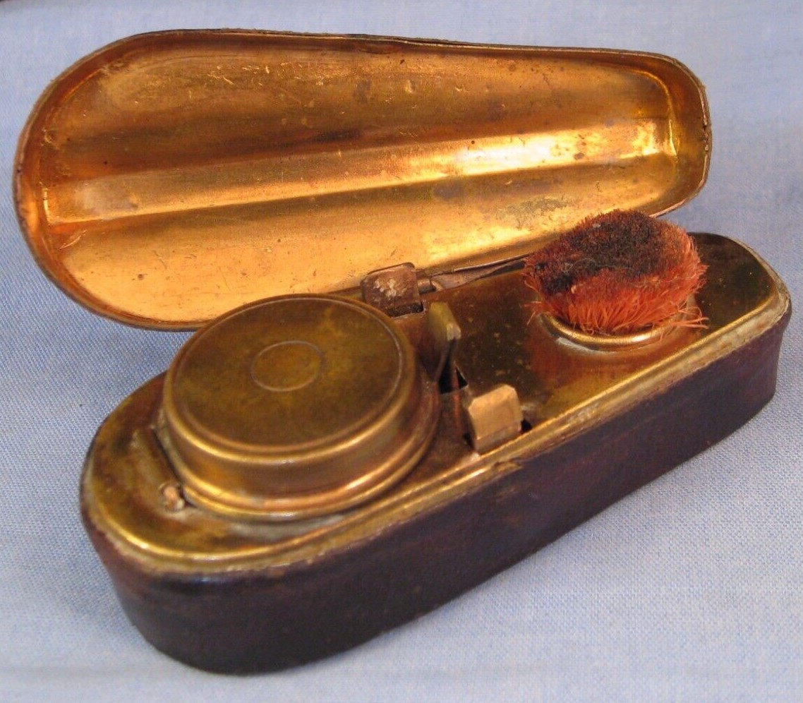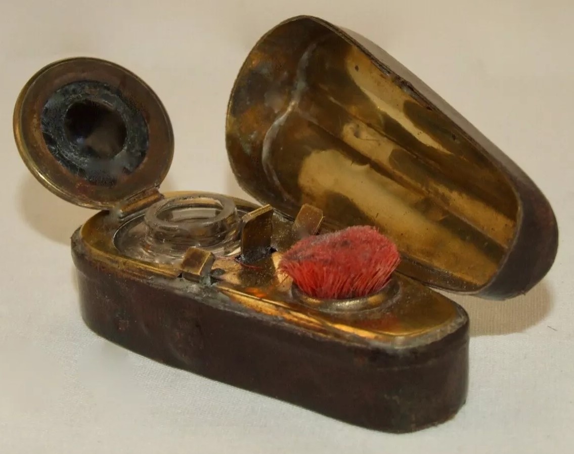 A traveler with a red leather cover on brass interior is fashioned as a violin case with a carrying handle. It has two spring-loaded covers with thumb release button and security catch securing the glass ink bottle inside. The case contains both an inkwell and a pen wipe.
