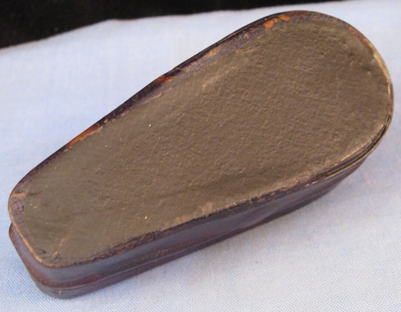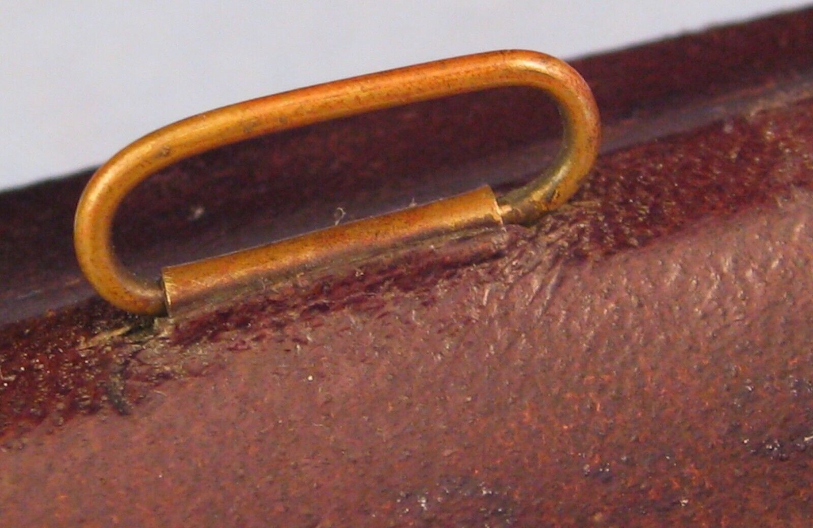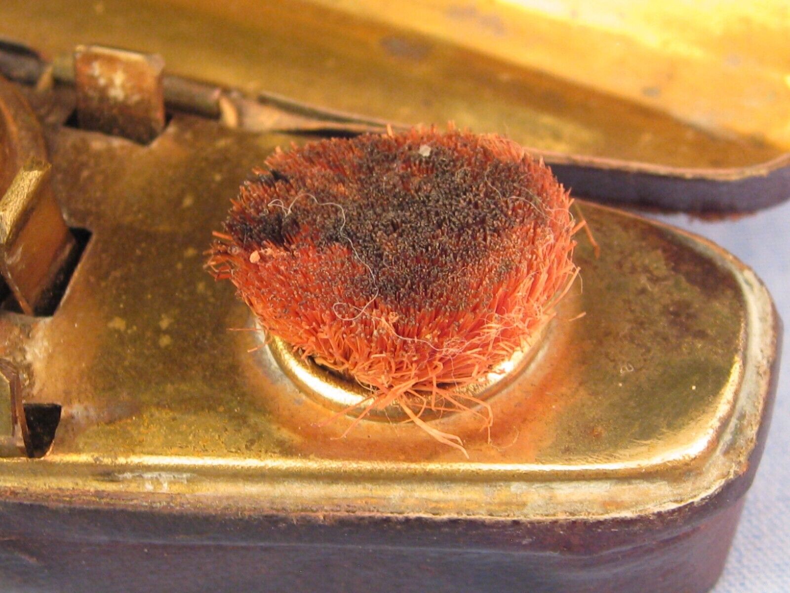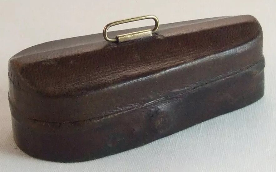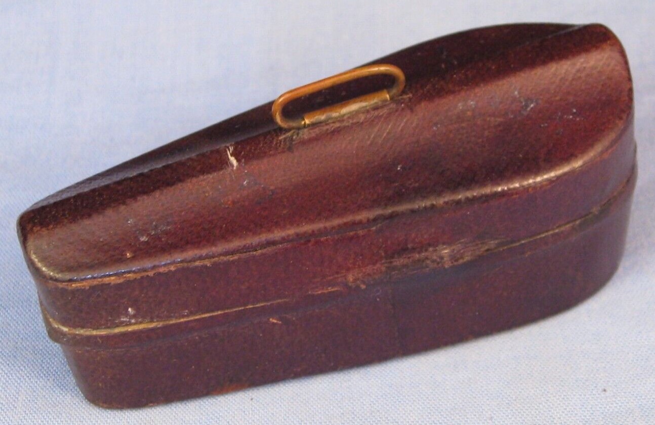 A traveler with a red leather cover on brass interior is fashioned as a violin case with a carrying handle. It has two spring-loaded covers with thumb release button and security catch securing the glass ink bottle inside. The case contains both an inkwell and a pen wipe.