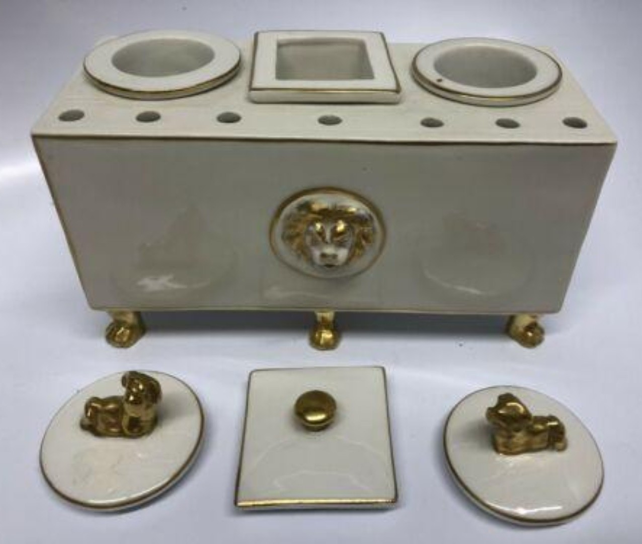 This porcelain double inkstand has an Asian inspired design with finials shaped like a Foo dog, a traditional Chinese guardian lion. A lion’s head is a central decoration.