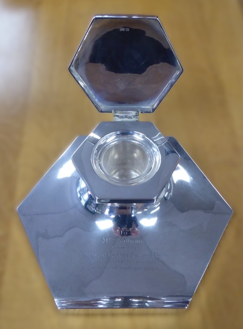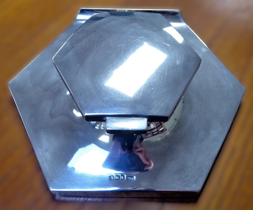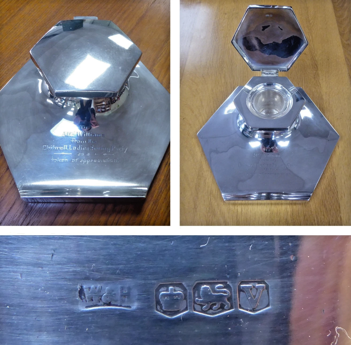 This is an Art Deco period sterling silver inkwell produced by the silversmiths Walker & Hall. Its clean, geometric lines reflect the modernist “streamlined” aesthetic popular in the late 1930s.