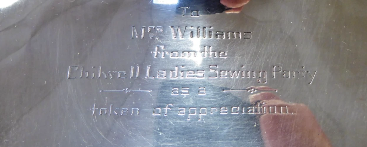 “To Mrs Williams from the Chilwell Ladies Sewing Party as a token of appreciation.”