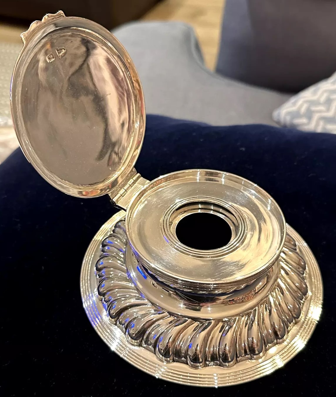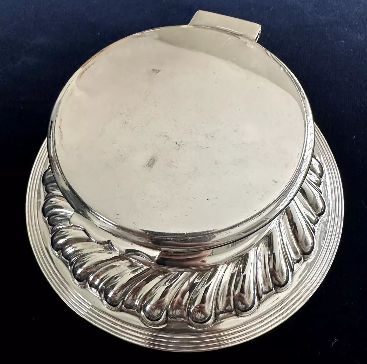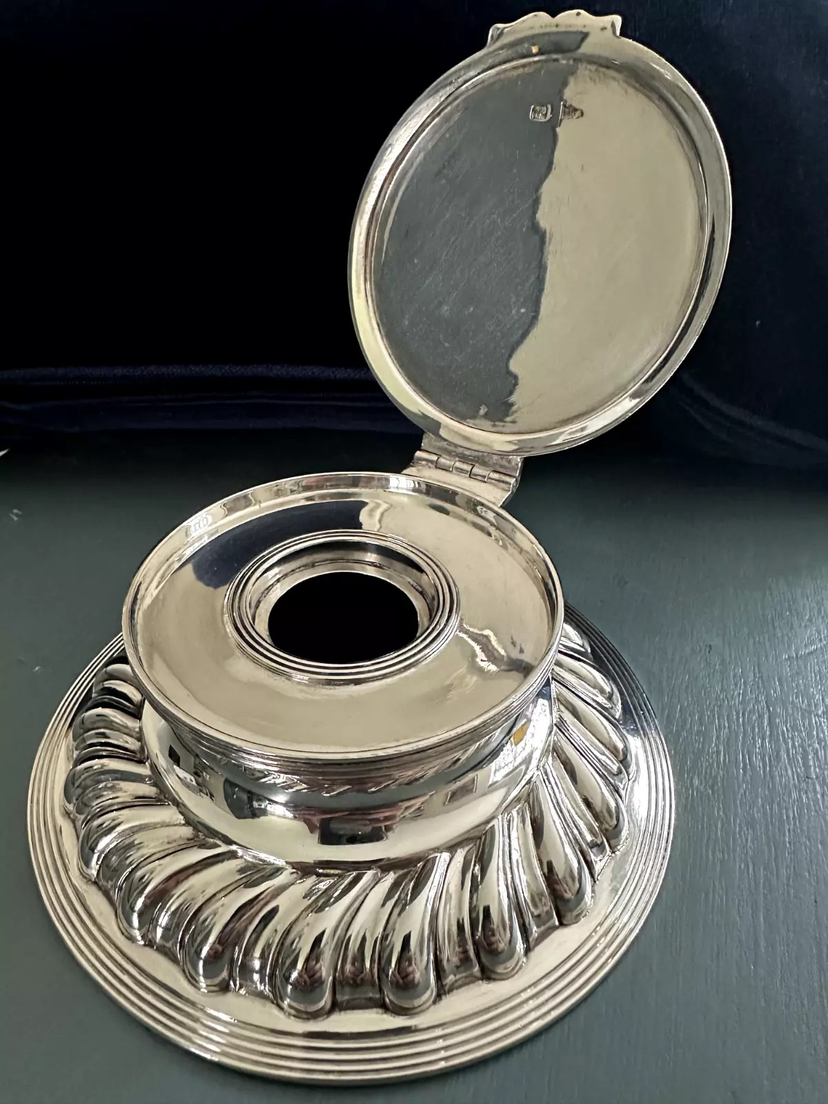This sterling silver inkwell, crafted by Walker & Hall from Sheffield, England, features a round base with a fluted design, creating a ridged appearance around its circumference. The lid is hinged and opens for access to the inkwell (insert missing here). The piece is hallmarked and dates to around 1905. Walker & Hall, established in 1845, was renowned for producing high-quality silverware.