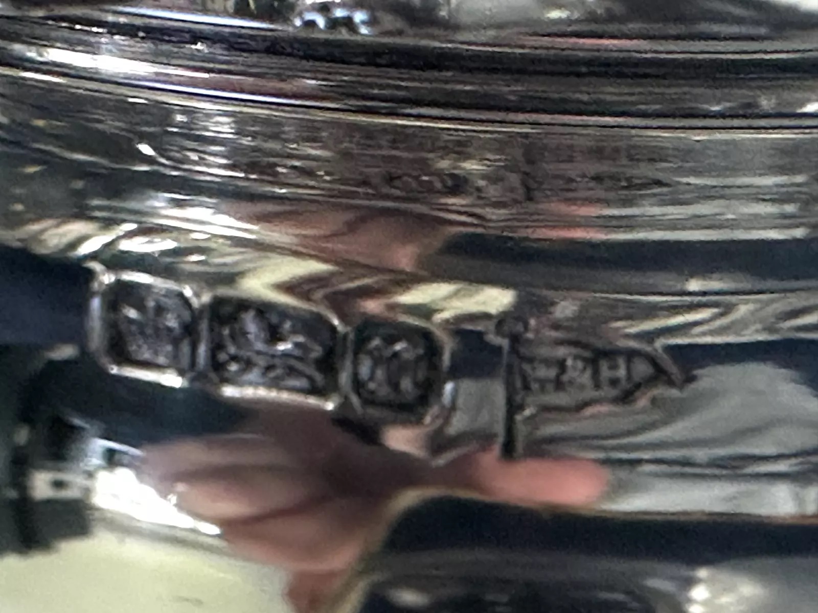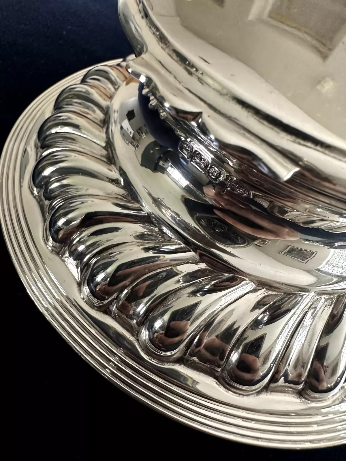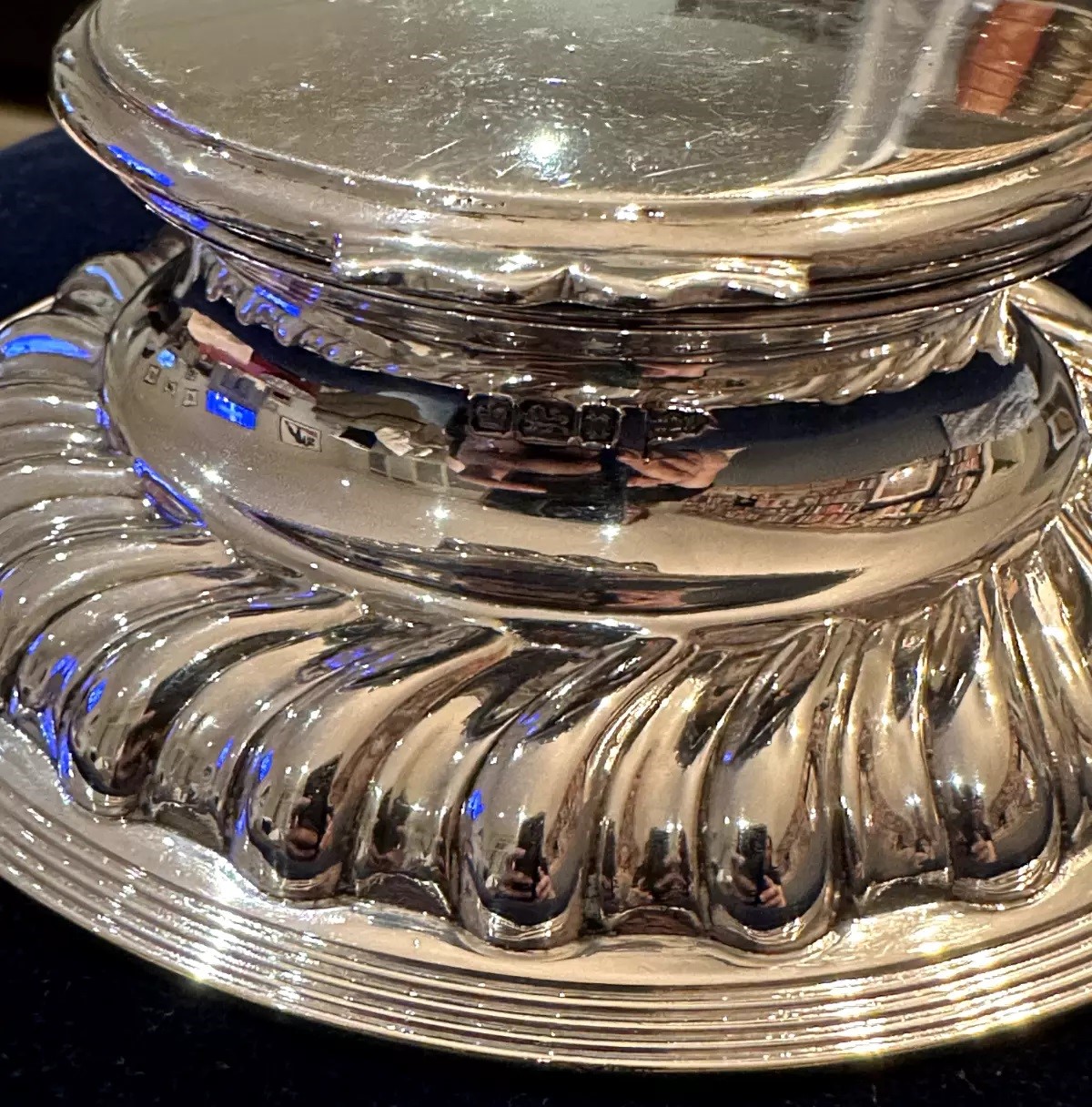 This sterling silver inkwell, crafted by Walker & Hall from Sheffield, England, features a round base with a fluted design, creating a ridged appearance around its circumference. The lid is hinged and opens for access to the inkwell (insert missing here). The piece is hallmarked and dates to around 1905. Walker & Hall, established in 1845, was renowned for producing high-quality silverware.