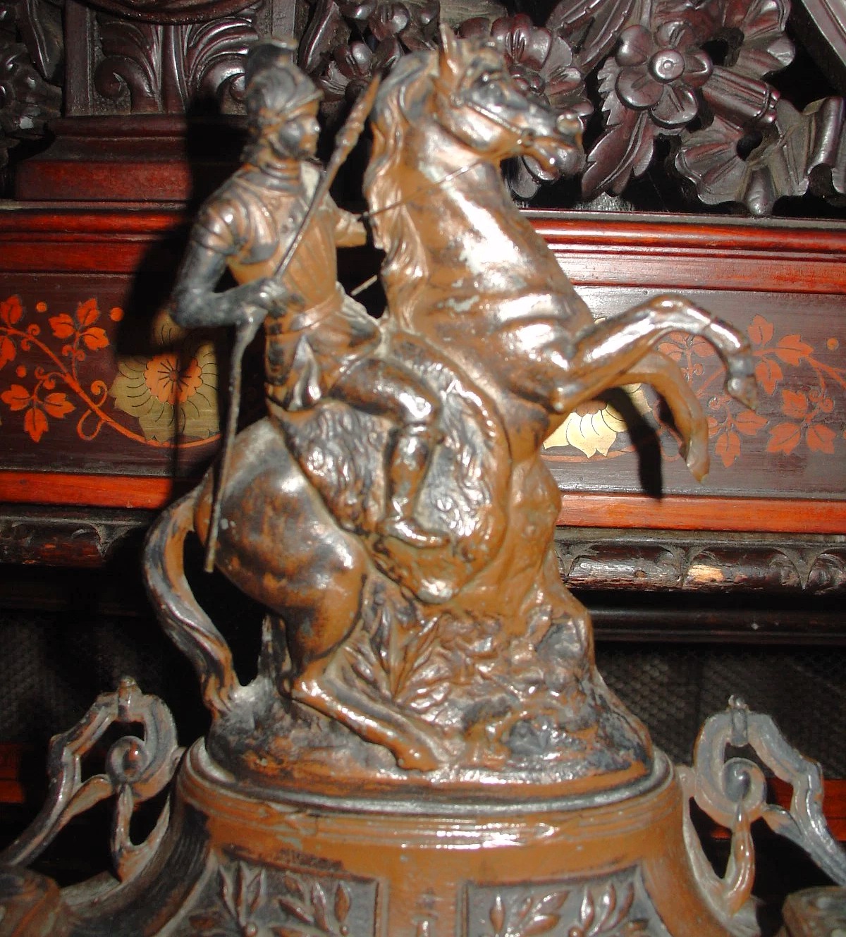- The Figure: The central focal point is a cast figure of a mounted warrior or officer in a dynamic “levade” or rearing pose. The rider wears military attire characteristic of the late 17th century (Louis XIV era), including a cuirass (breastplate), a helmet, and high riding boots. He holds a lance or baton of command in his right hand.