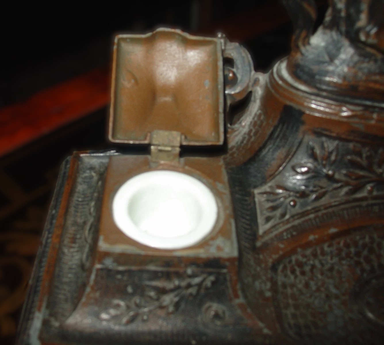 - The Inkwells: Flanking the central statue are two square inkwells with hinged lids. When opened, they reveal removable white porcelain inserts.