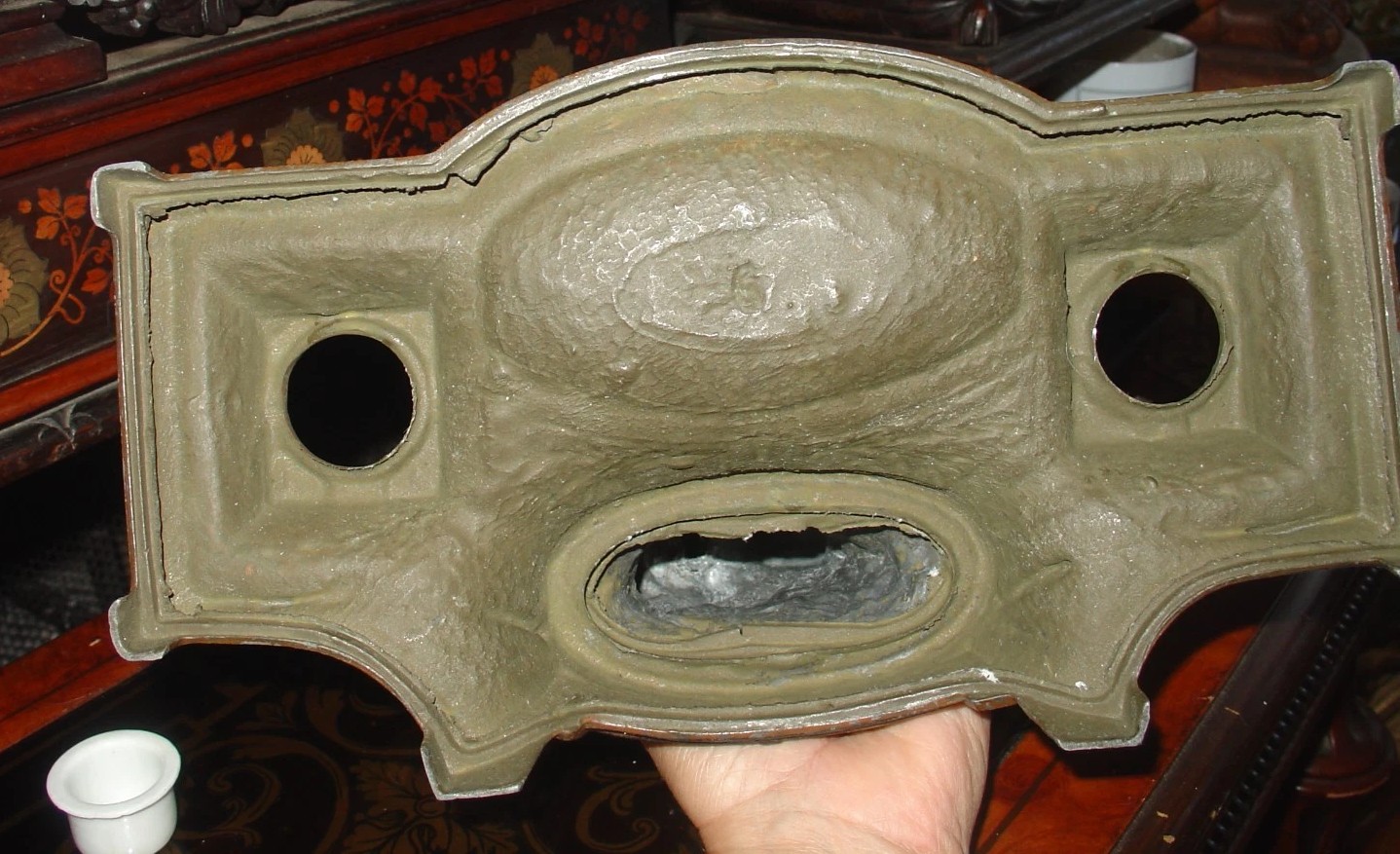 - The Base: The base features an ornate, neoclassical design with scrolling acanthus leaves, floral swags, and a textured “cobblestone” or “earth” pattern in the central pen tray. The underside shows the characteristic hollow, sand-cast appearance of spelter metal.