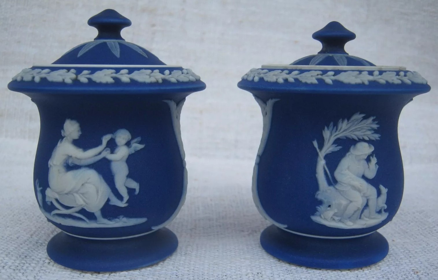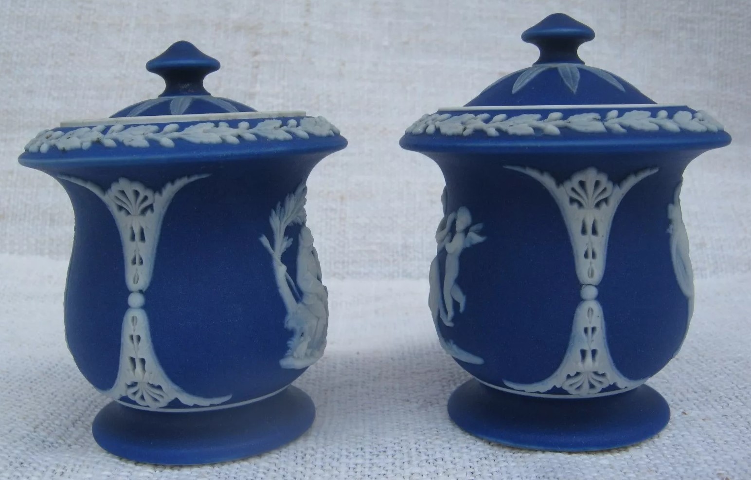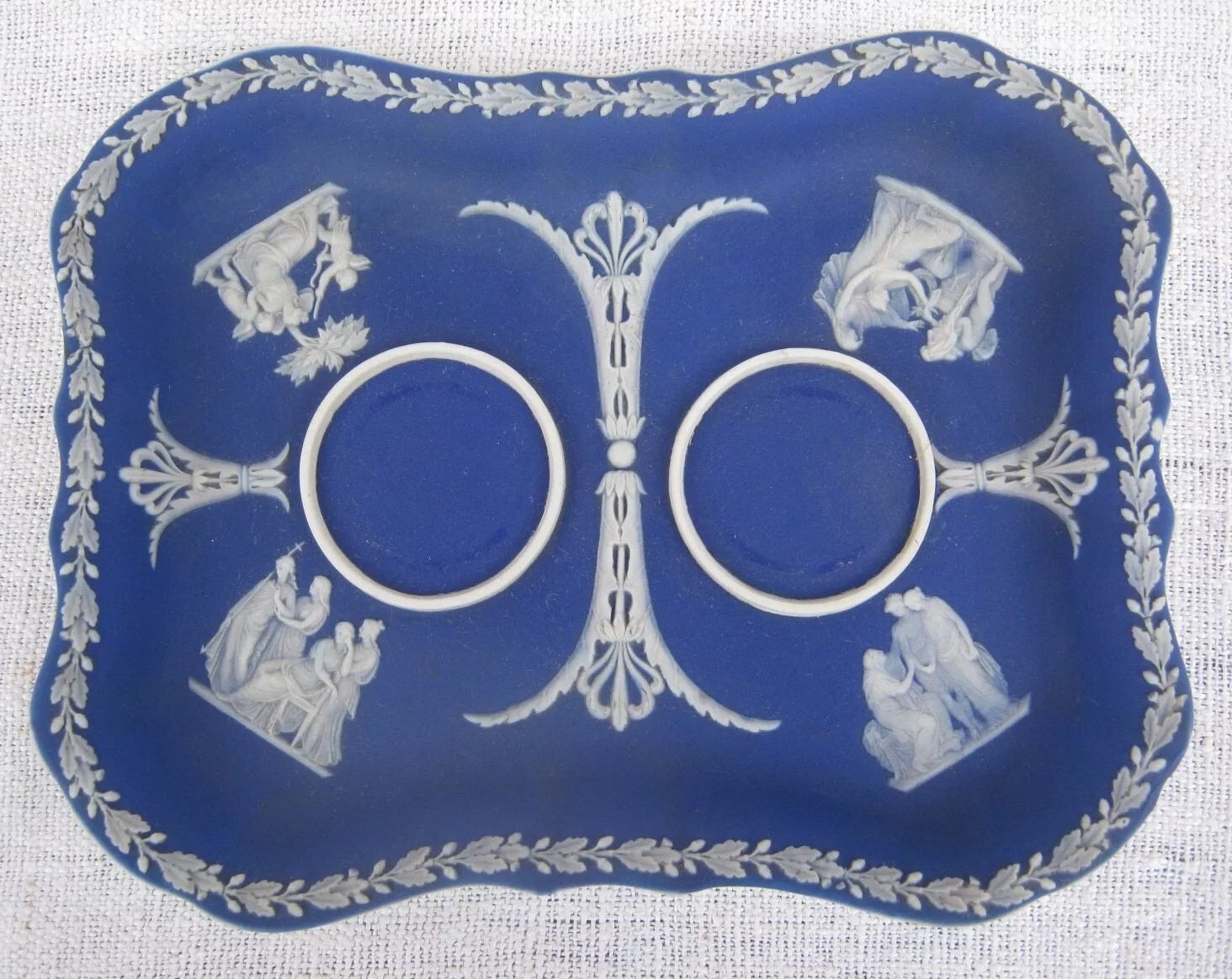 A 19th-century Wedgwood with two inkwells on a tray in dark blue Jasper ware. All pieces are marked with the impressed Wedgwood mark and date letter “D” for 1875.