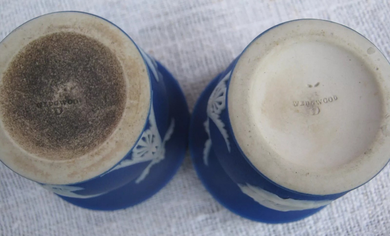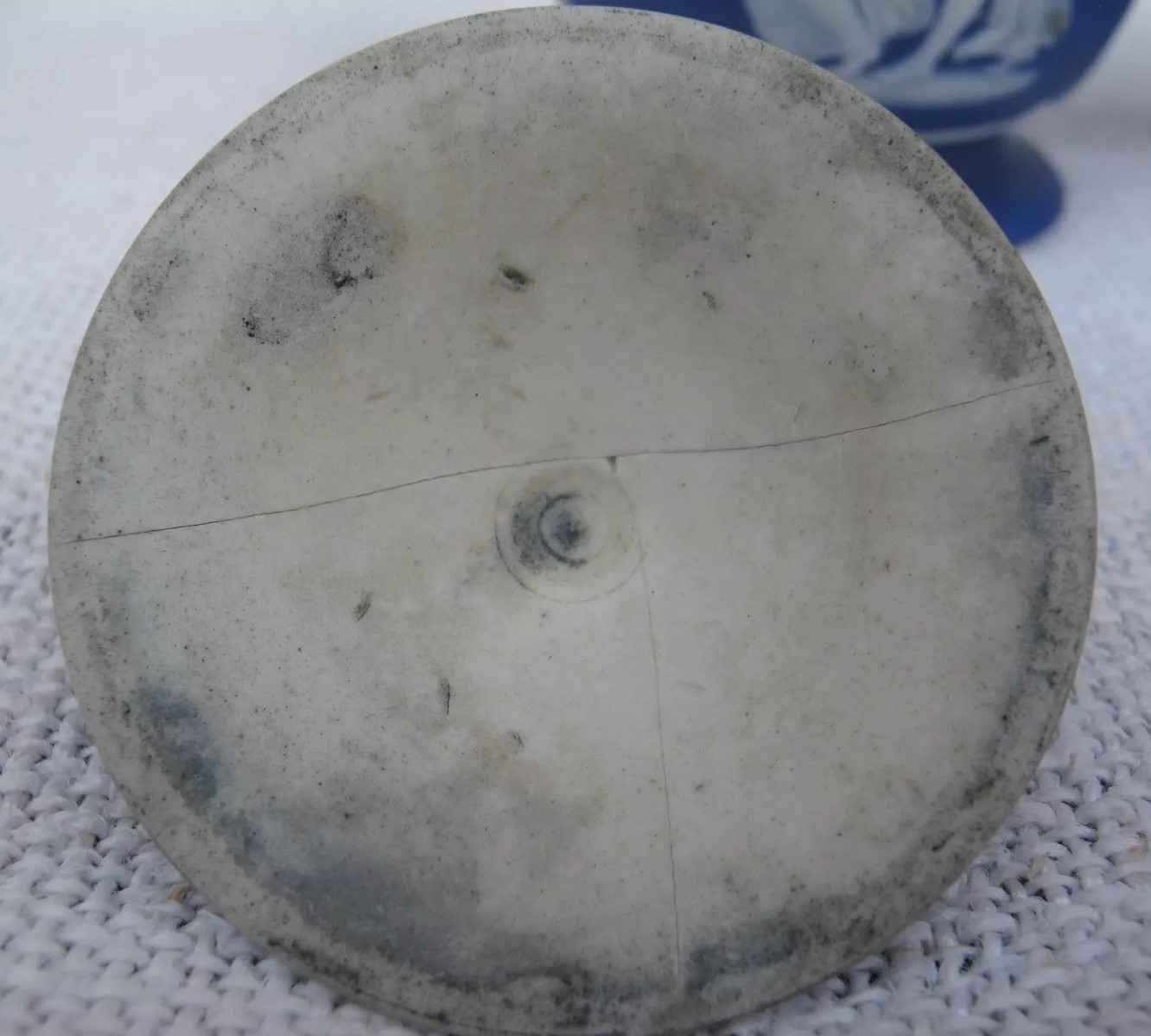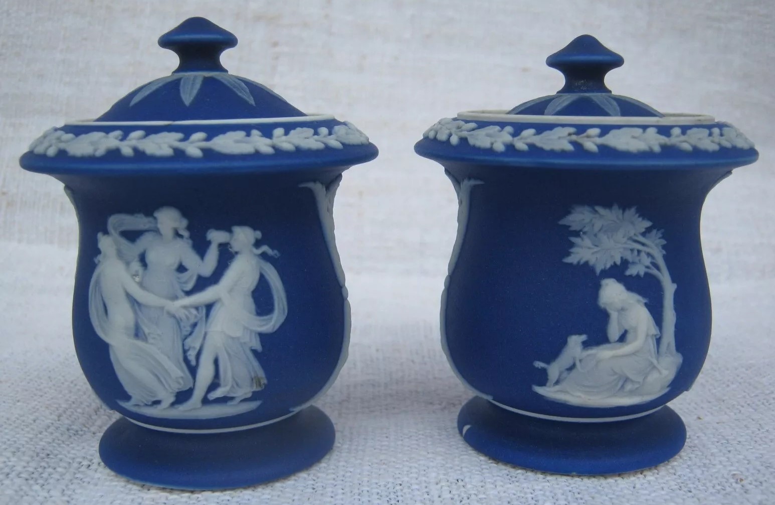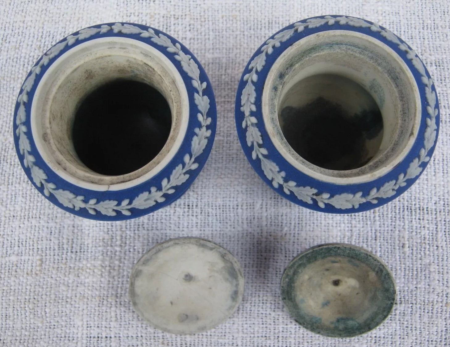 A 19th-century Wedgwood with two inkwells on a tray in dark blue Jasper ware. All pieces are marked with the impressed Wedgwood mark and date letter “D” for 1875.