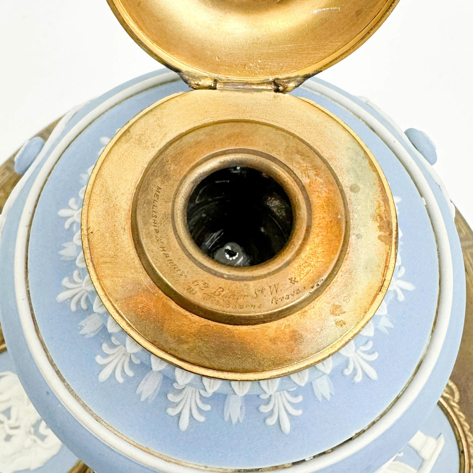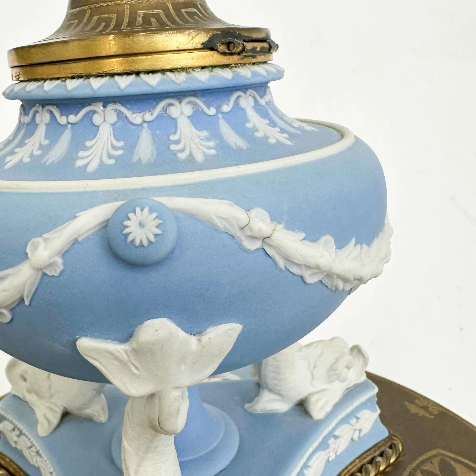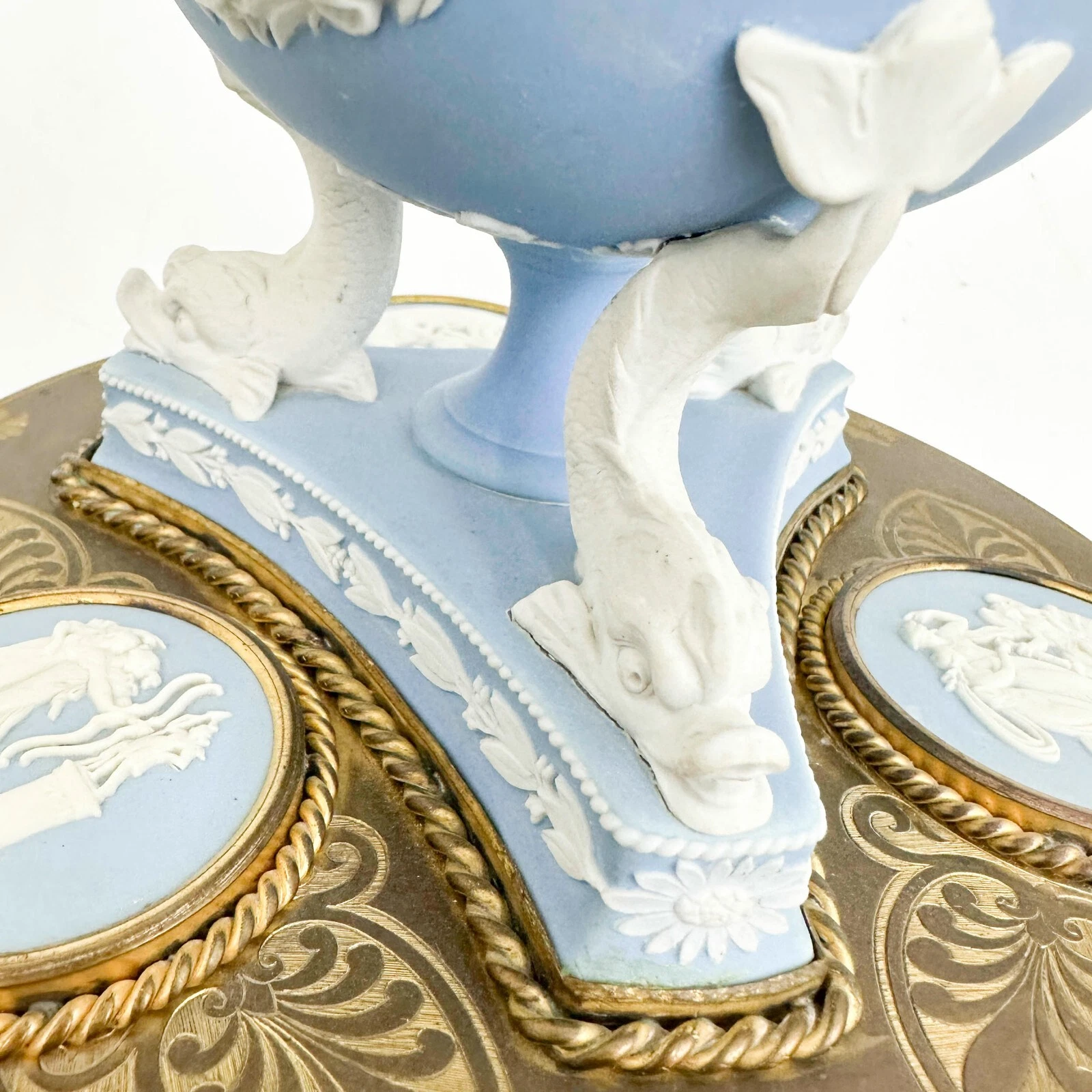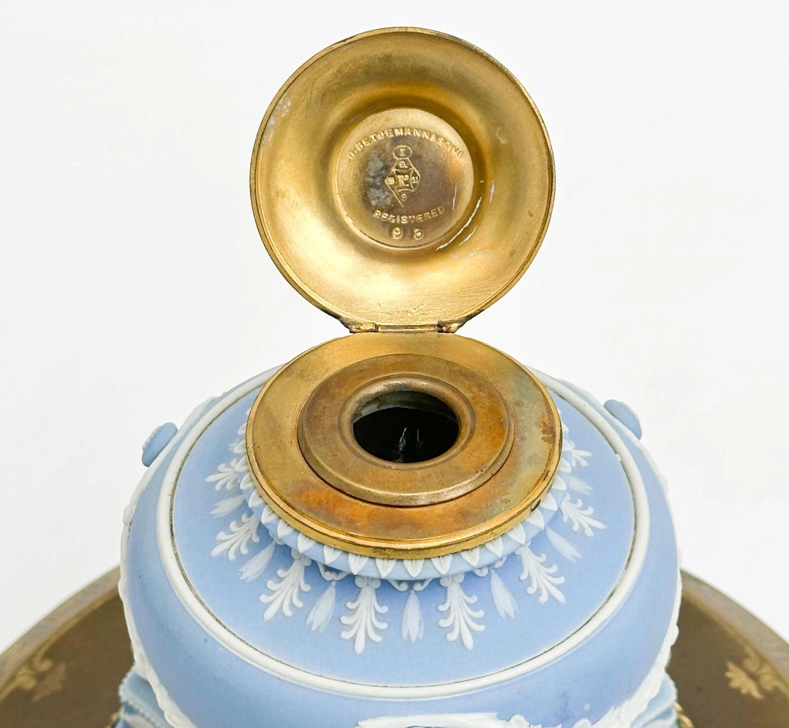 Overview A fine quality Neoclassical revival inkstand, dating to the late 19th century (c. 1870–1900). It combines a Wedgwood Blue Jasper Dip body with substantial gilt bronze (ormolu) mounts.