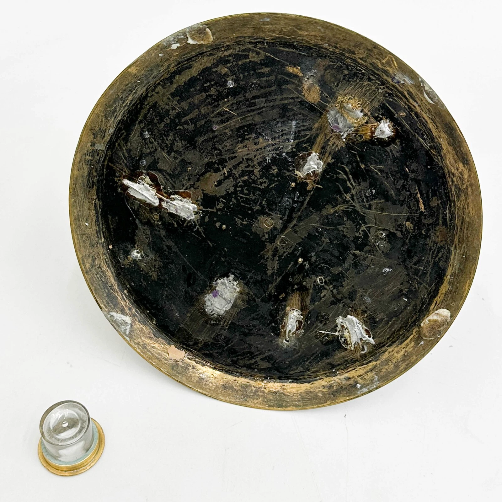- Retailer: The rim of the glass liner is engraved “MELLISHIP & HARRIS, 62 BAKER St. W.”. This identifies the luxury stationer and fancy goods shop in London where the piece was originally sold.