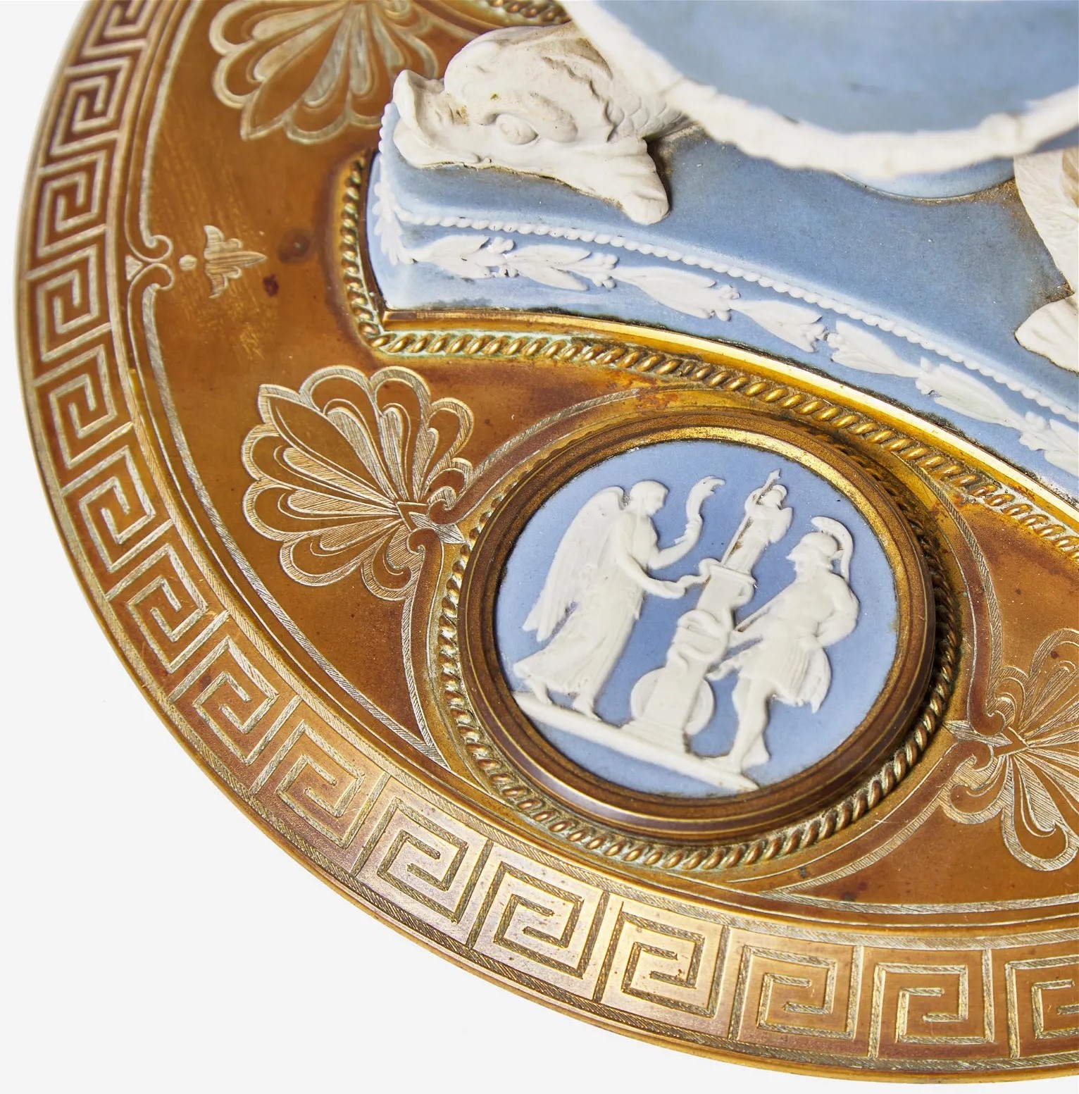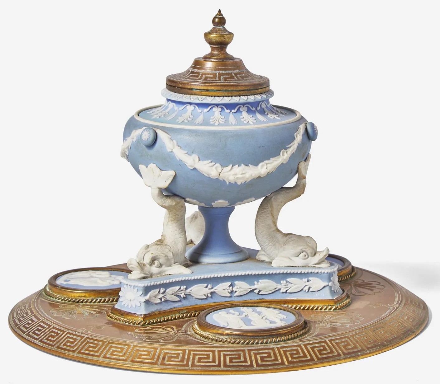 Stoneware inkwell in the form of a dolphin perfume burner with a hinged brass lid, mounted on a brass base set with three solid blue Jasperware cameos. The three cameos are marked “WEDGWOOD”.