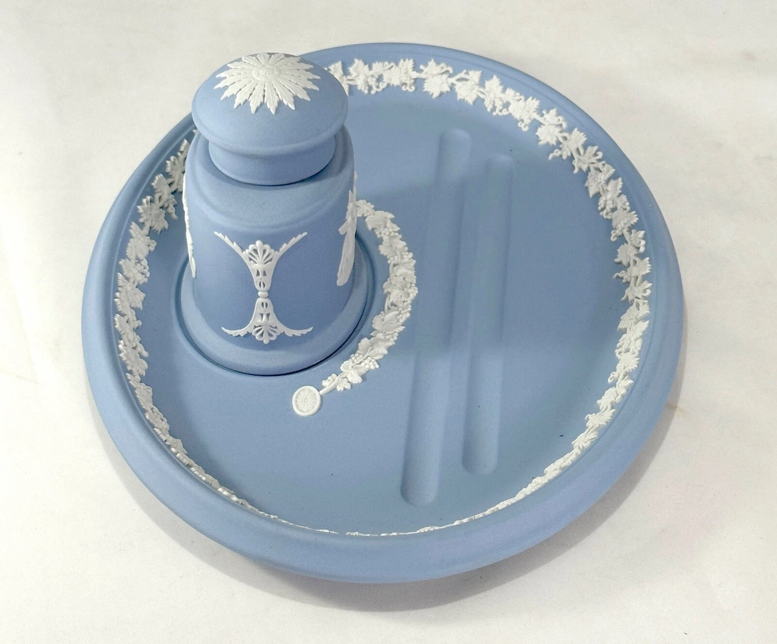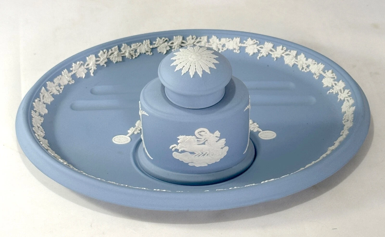 Wedgwood made its Jasperware famous since the late 18th century. It is a common misconception that all Wedgwood pieces are pre-20th century antiques.  as they have consistently produced items in this distinctive style. This inkstand, made circa 1976, is an example of contemporary Wedgwood.