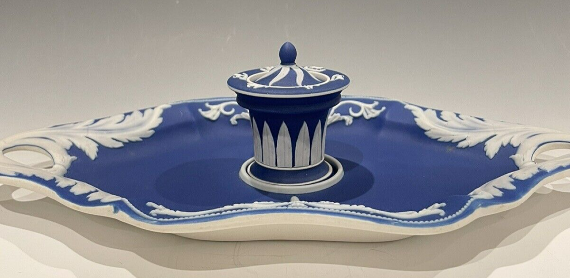 This Wedgwood inkstand with lidded inkwell is cobalt blue colored jasper dip / jasperware. The tray is impressed WEDGWOOD (only), Y and the inkwell is impressed WEDGWOOD (only), CDP for the year 1861.