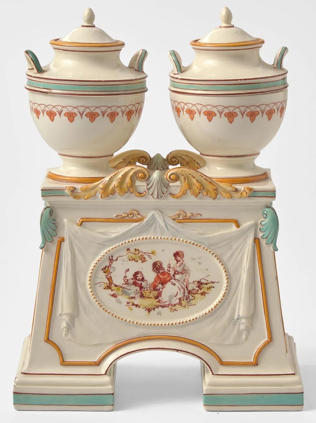 Glazed and enameled earthenware inkstand in the form of two handled urns on a plinth, enamel-decorated with pastoral scenes. Impressed “WEDGWOOD”, signed “E Lessore” (Emile Lessore 1805 -1876).