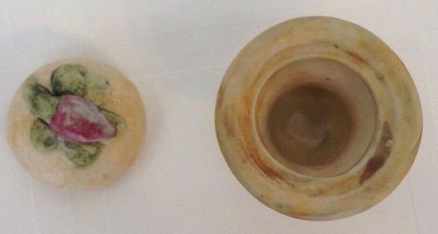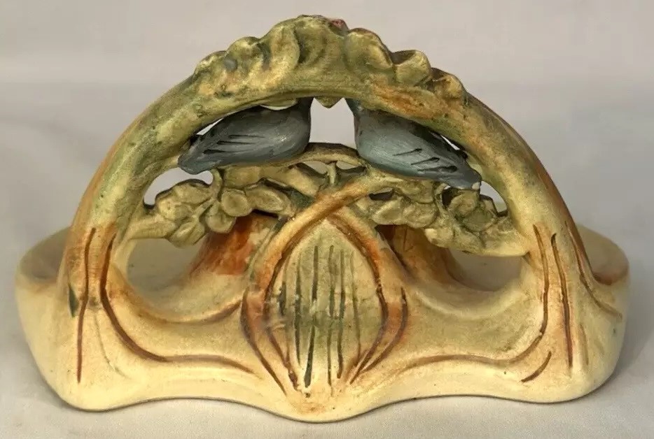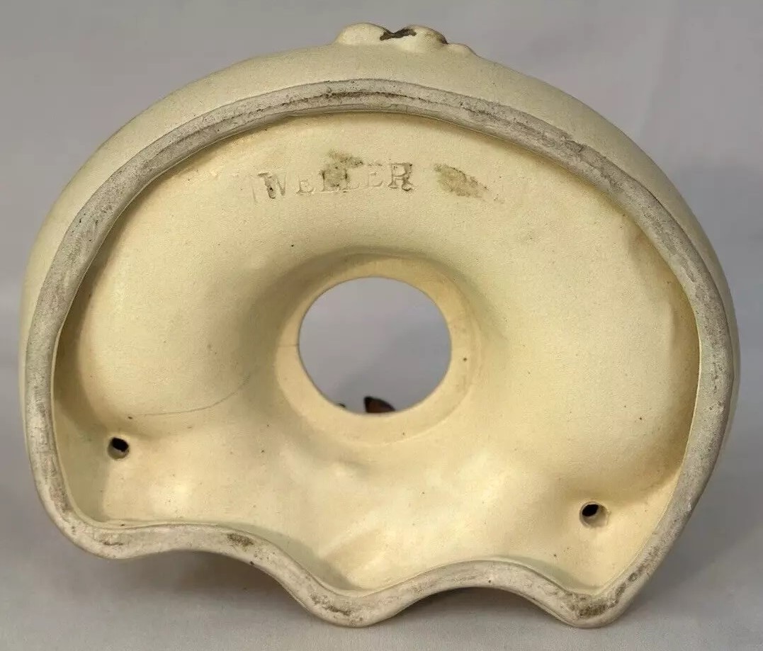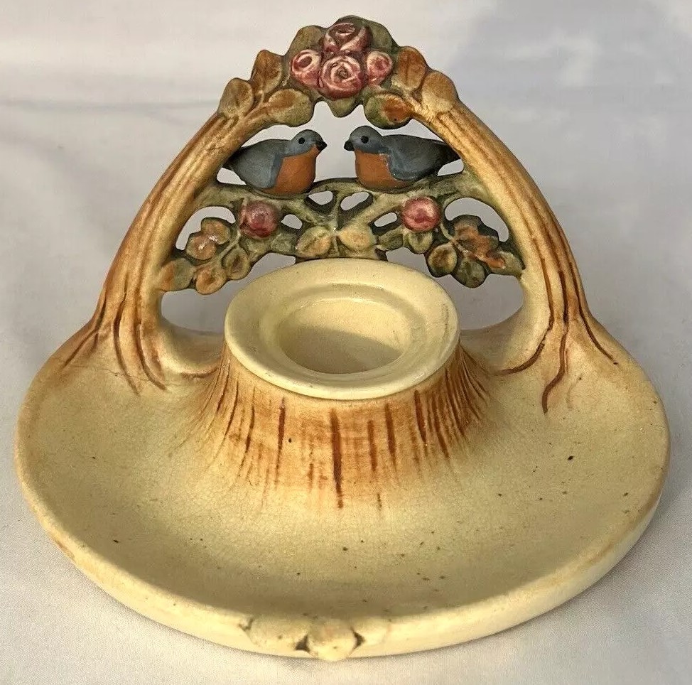 This Weller pottery inkstand in the Flemish pattern features two blue birds perched on a branch. The inkstand’s arched backdrop in the form of branches provides an elegant frame for the birds. The branch beneath them has leaves and berries. The creamy beige base holds the inkwell and serves as a pen tray. Impressed on the underside in block letters is “WELLER”.