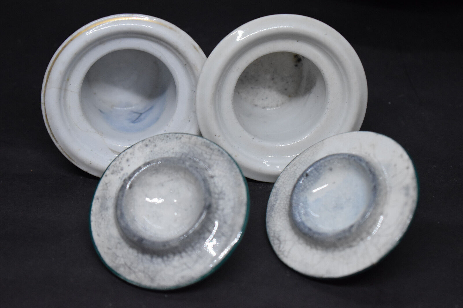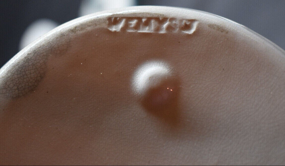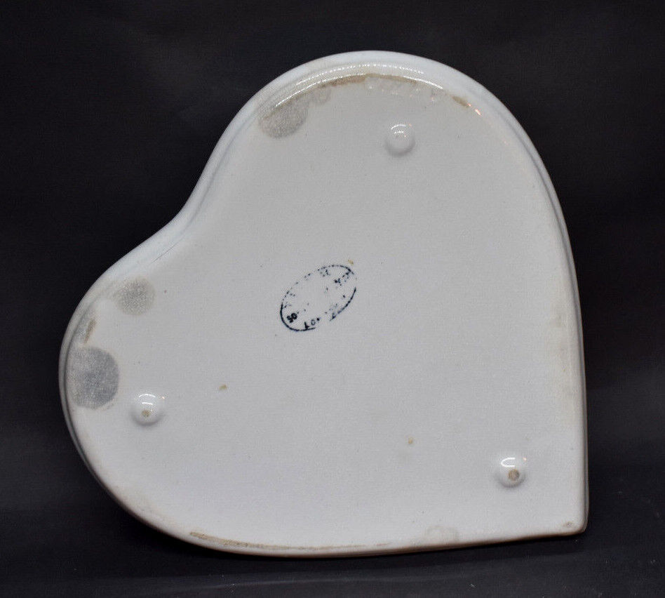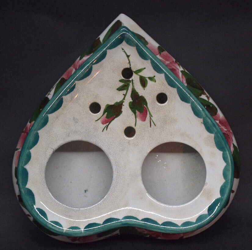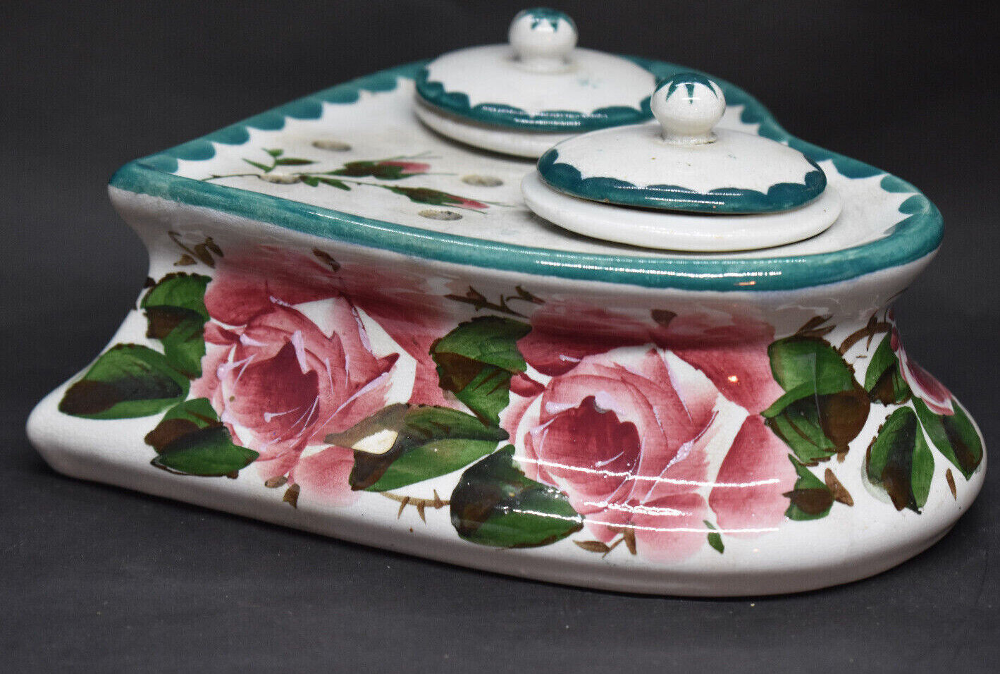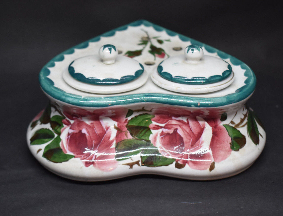 This pottery double inkstand is in the Cabbage Rose pattern by Wemyss of Scotland. It is complete with two pottery ink pots and lids. The base of the heart shaped inkstand is impressed with WEMYSS in block letters. It also has the mark for London retailer T. Goode & Co.