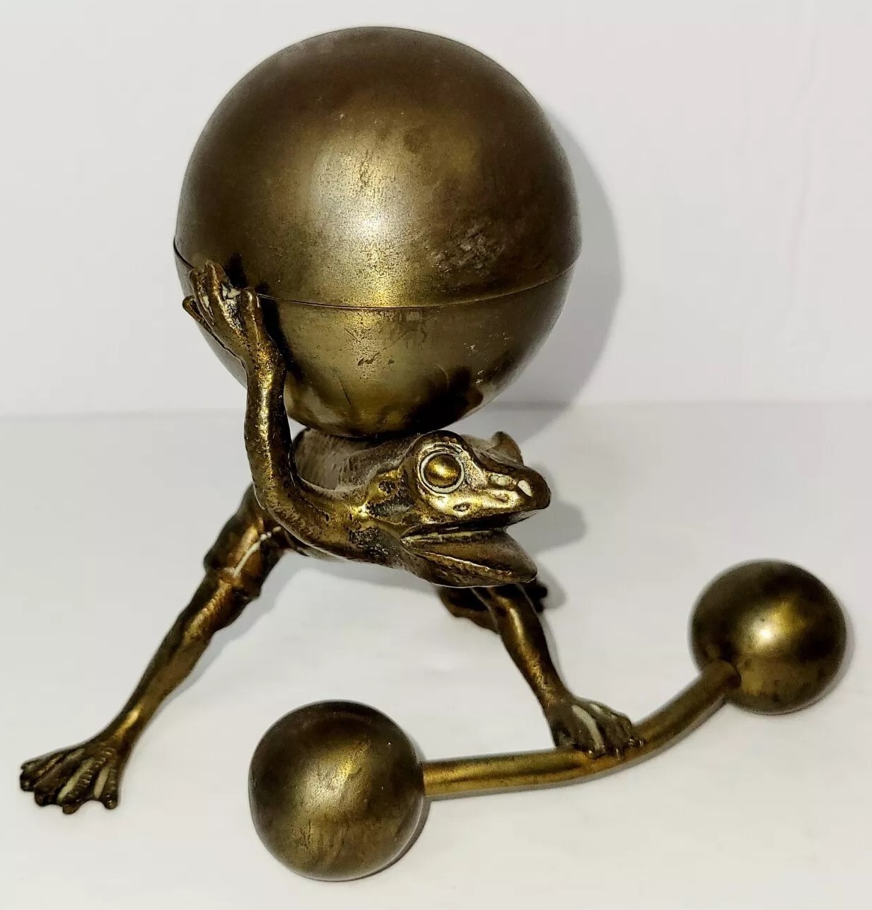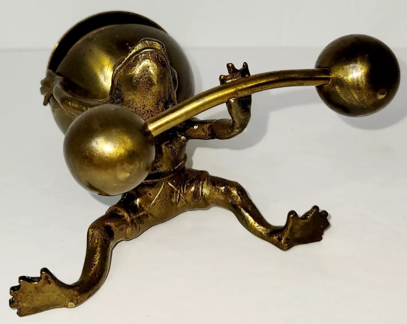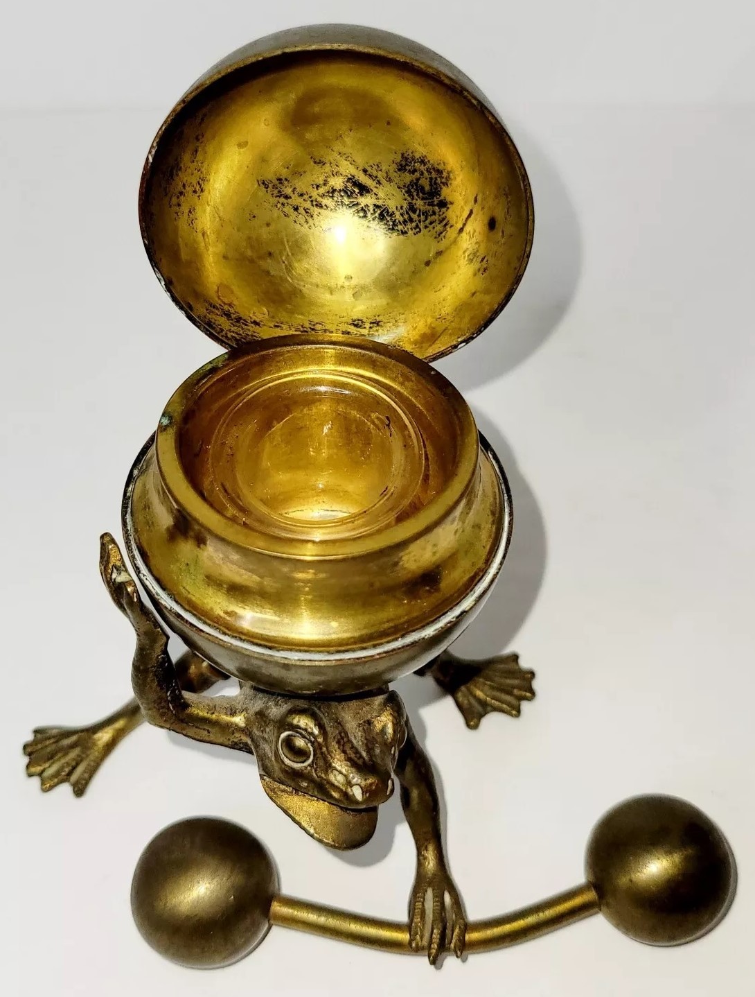 This Vienna bronze inkwell features a circus frog balancing a spherical inkwell with hinged lid on his back while his left front foot is holding a dumbbell.