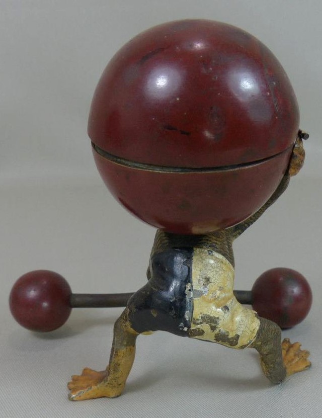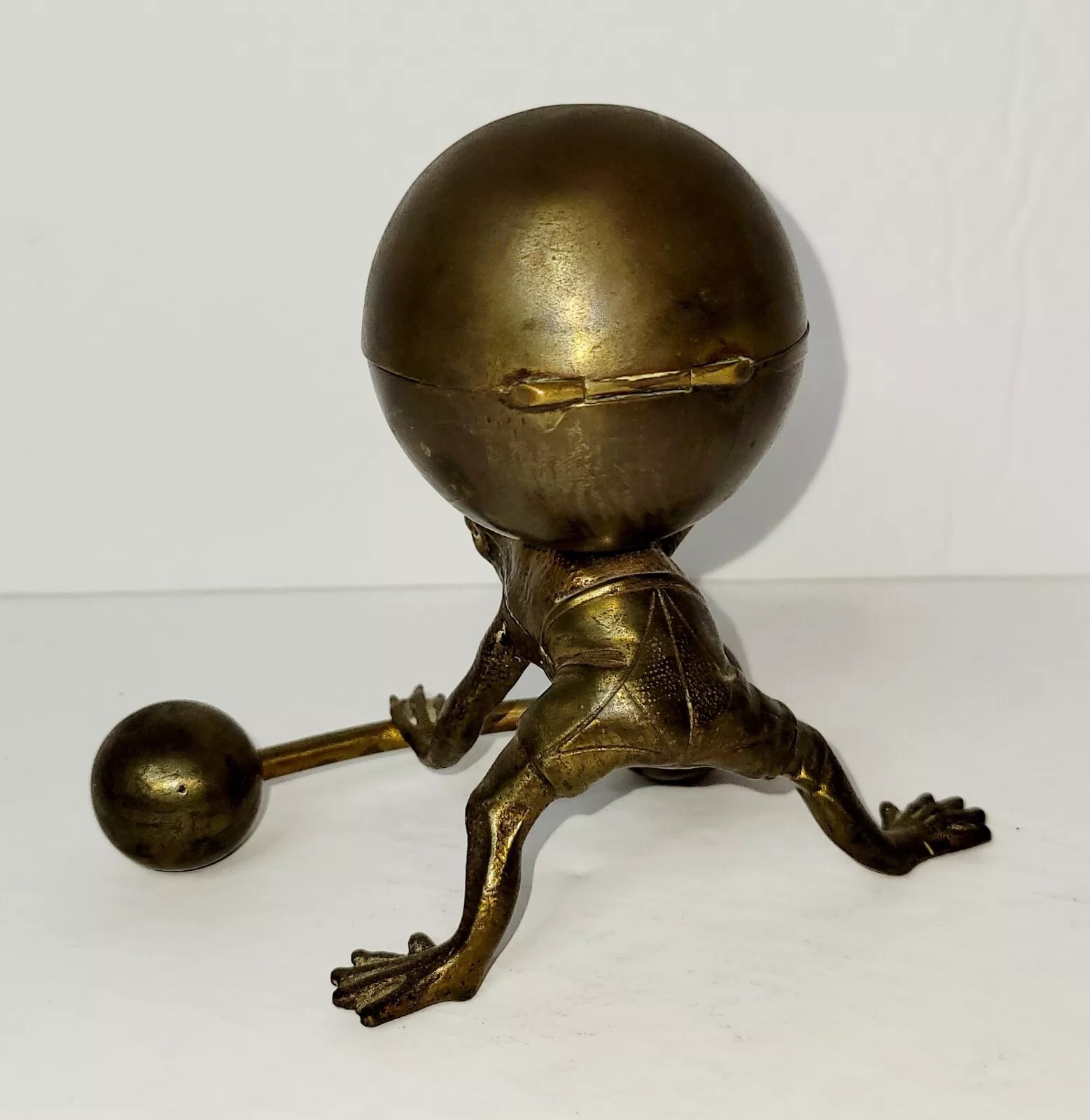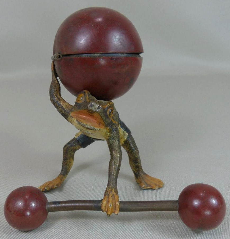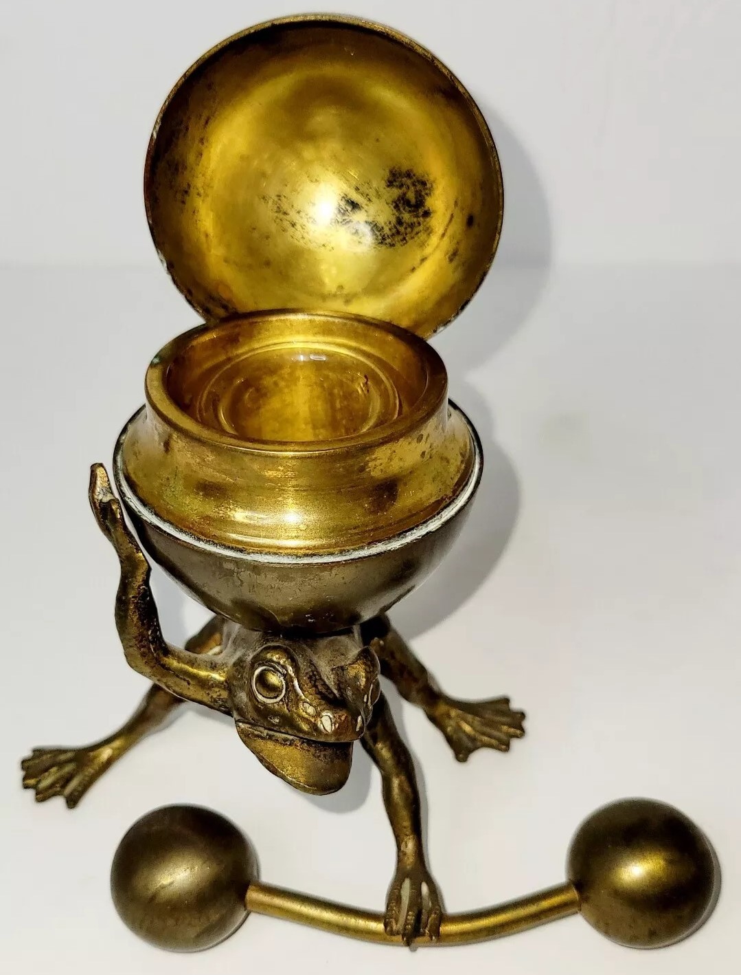 This Vienna bronze inkwell features a circus frog balancing a spherical inkwell with hinged lid on his back while his left front foot is holding a dumbbell.