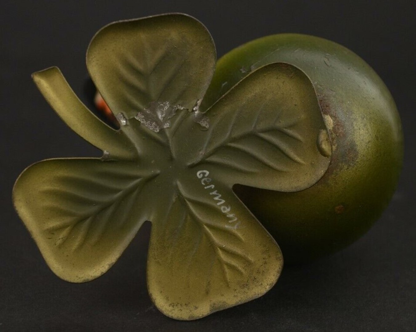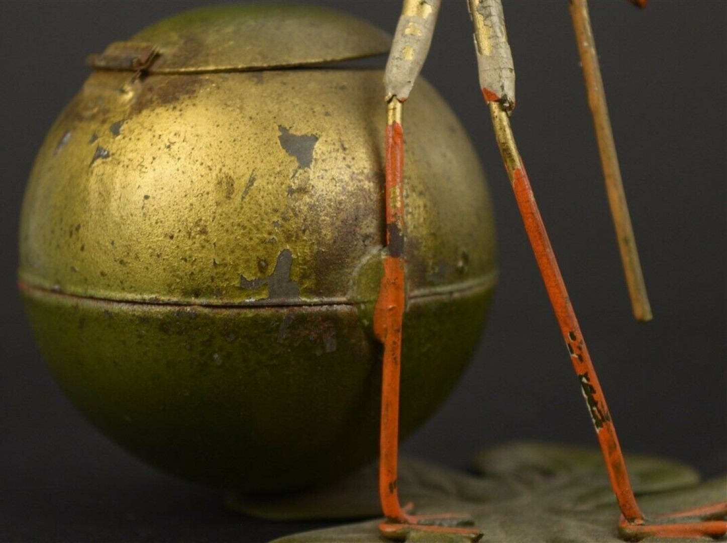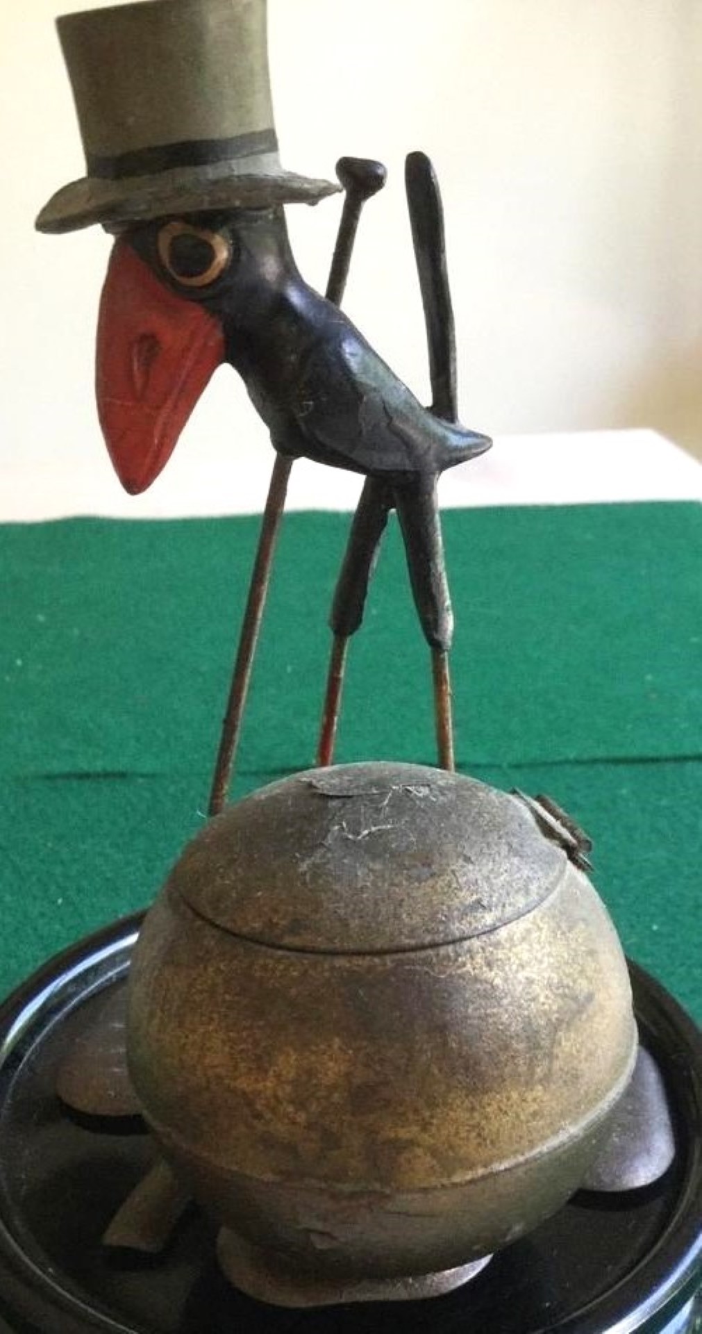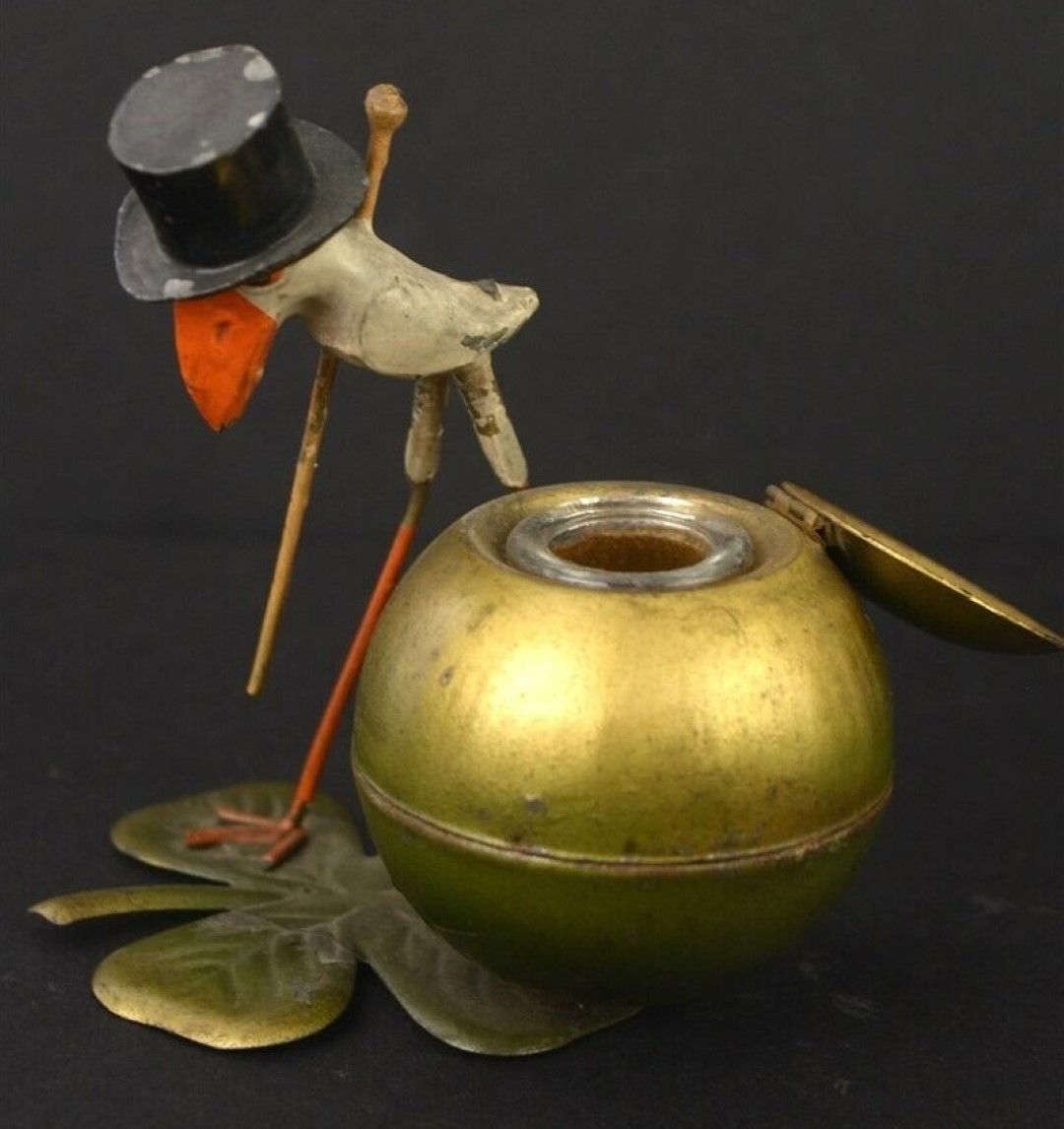 Standing on a 4-leaf clover next to a globe-shaped inkwell, this comical bird with an orange beak and long legs, holding a cane, may have been an advertising piece. Marked “Germany”.