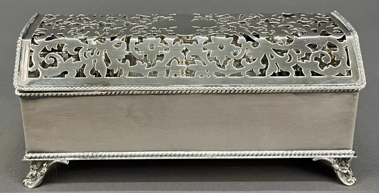 This late 19th century Wilcox Silver Plate Co. lidded casket style inkstand with rope trim features double glass inkwells with hinged lids flanked by a removable quill box and channel for writing utensils. The casket’s lid has pierced ornate flowers and scrolls and rests on four scrolled feet. The base is stamped with the Wilcox Silverplate hallmark S P & Co., c. 1870’s.
